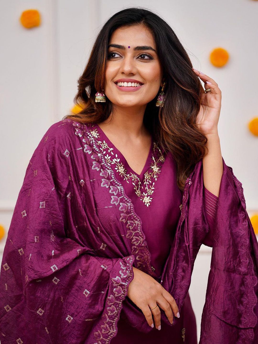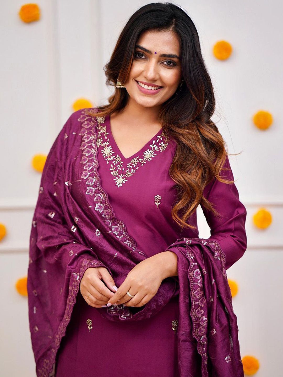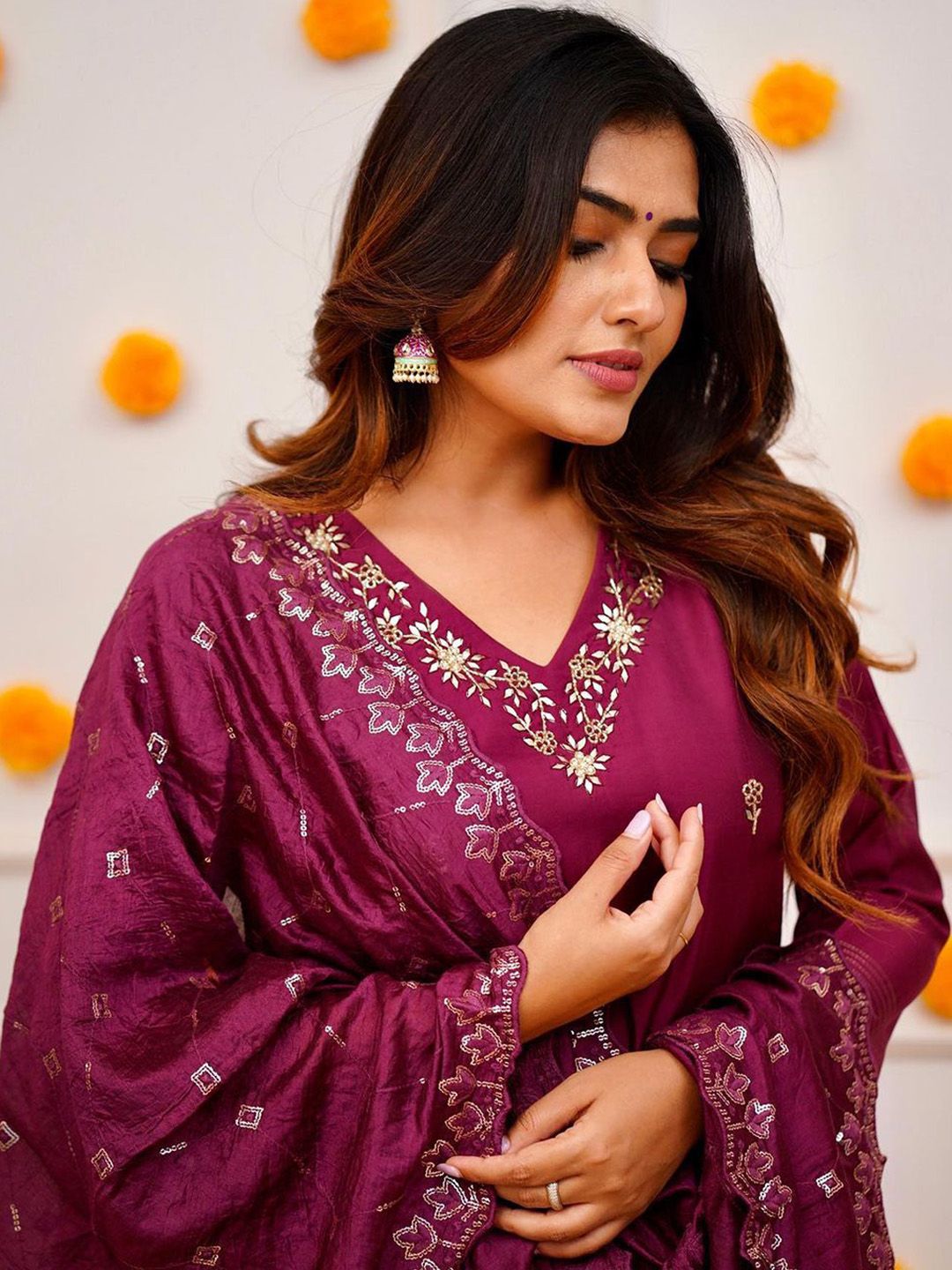 Storebrite Floral Embroidered V-Neck Chanderi Silk Kurta With Trousers & Dupatta
