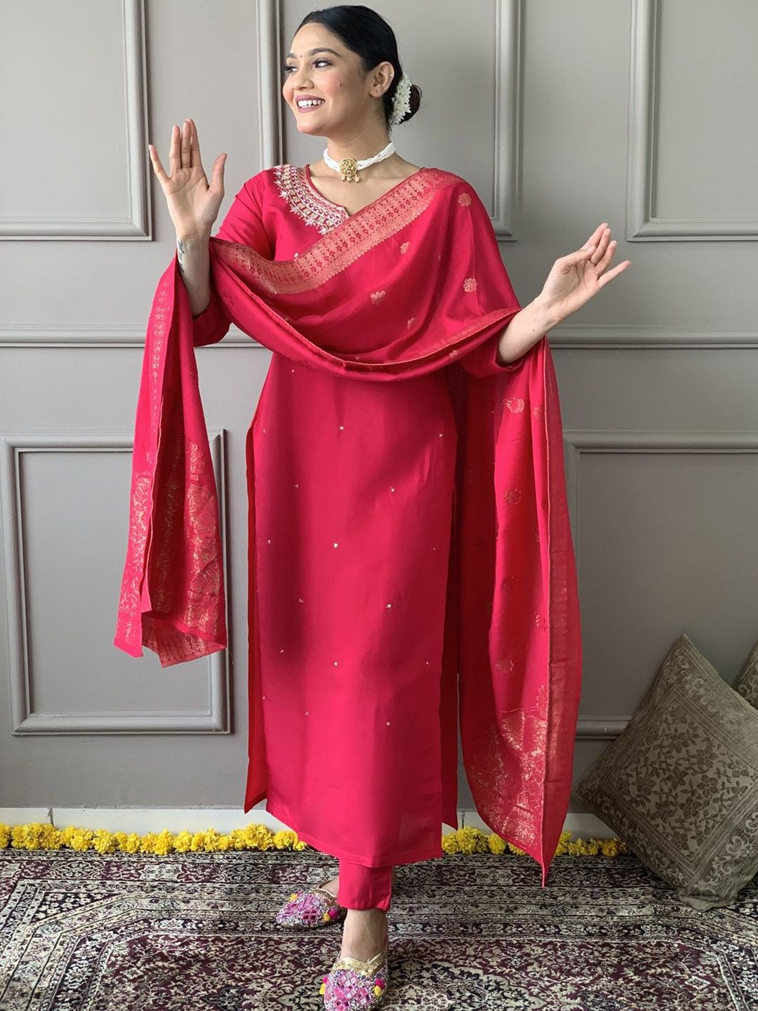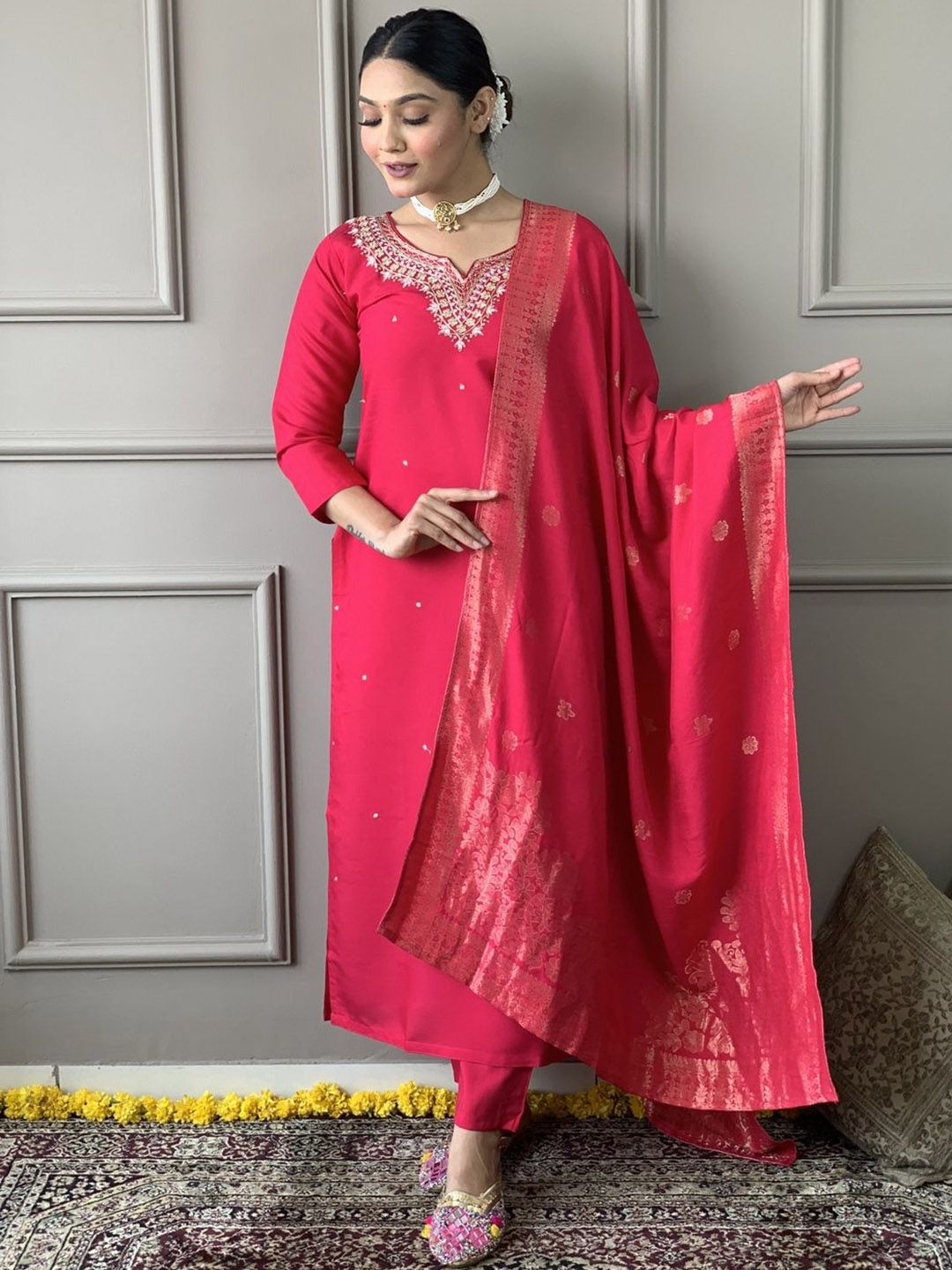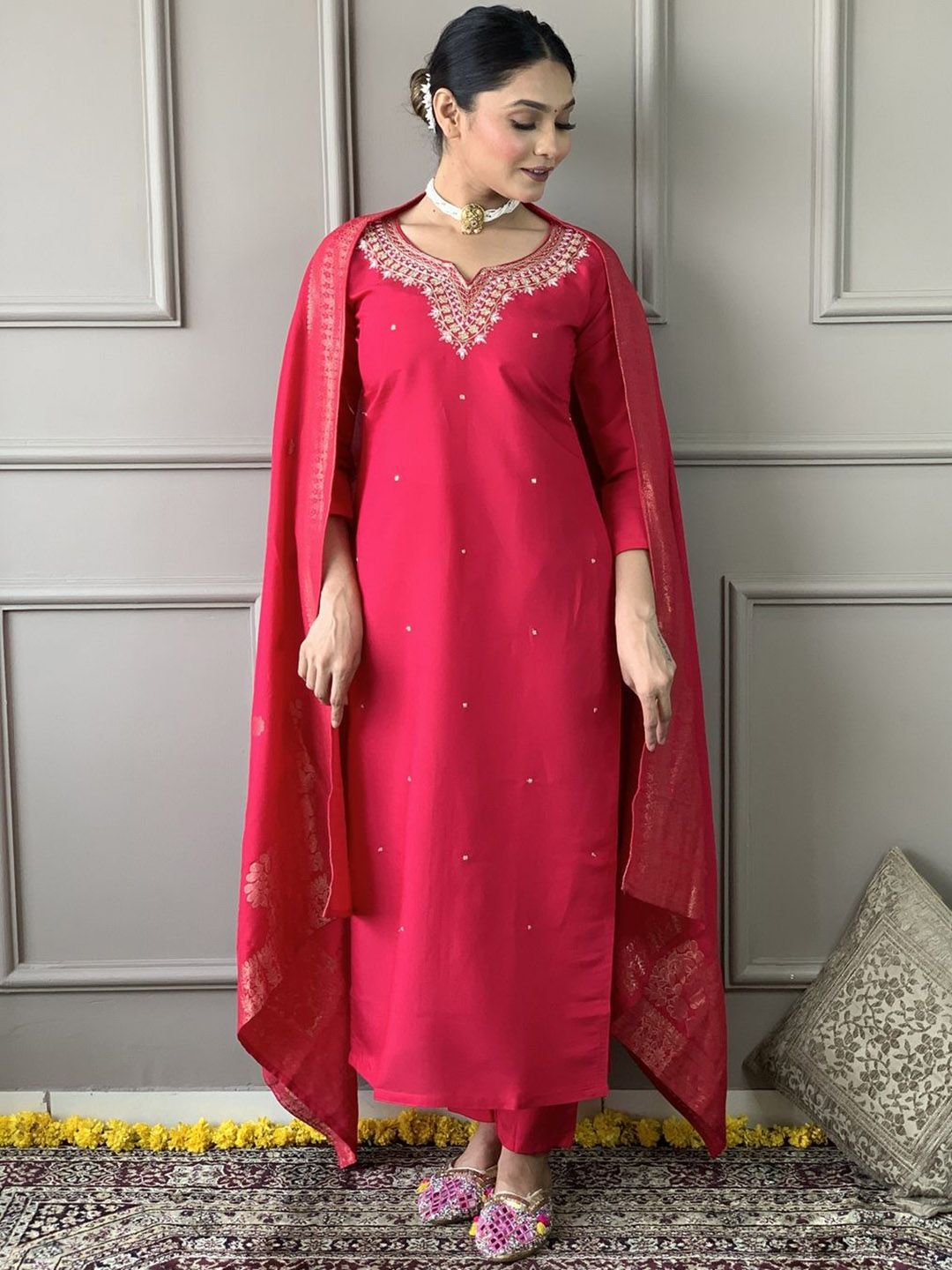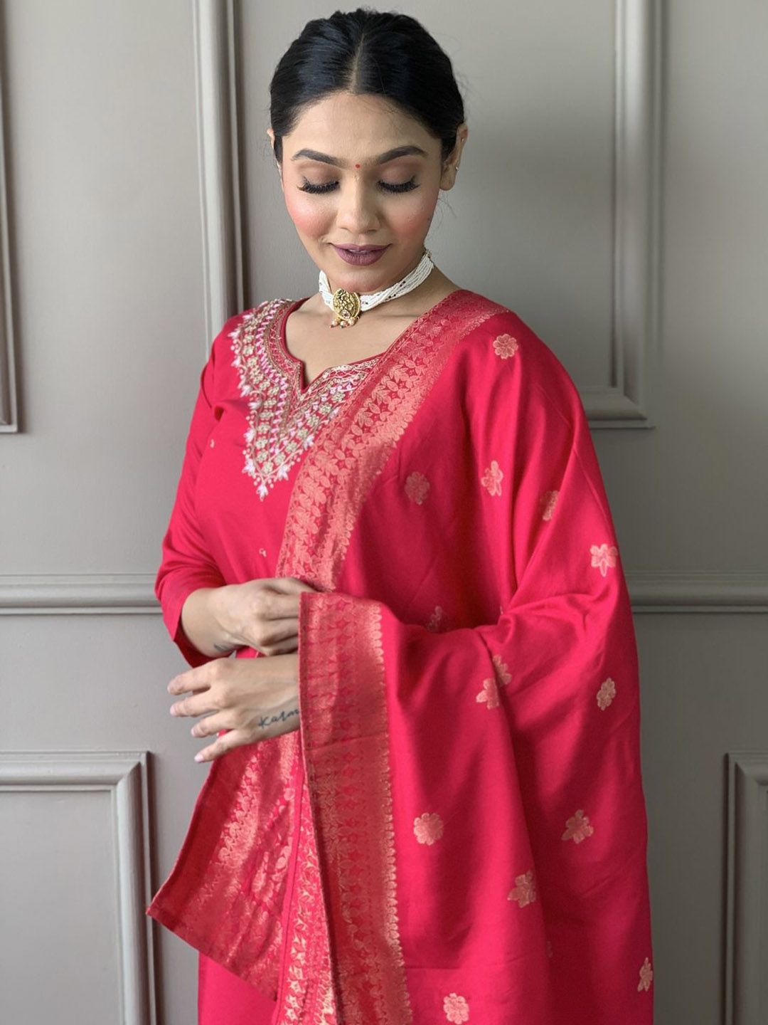 Storebrite Women Floral Embroidered Chanderi Silk Kurta with Trousers & Dupatta