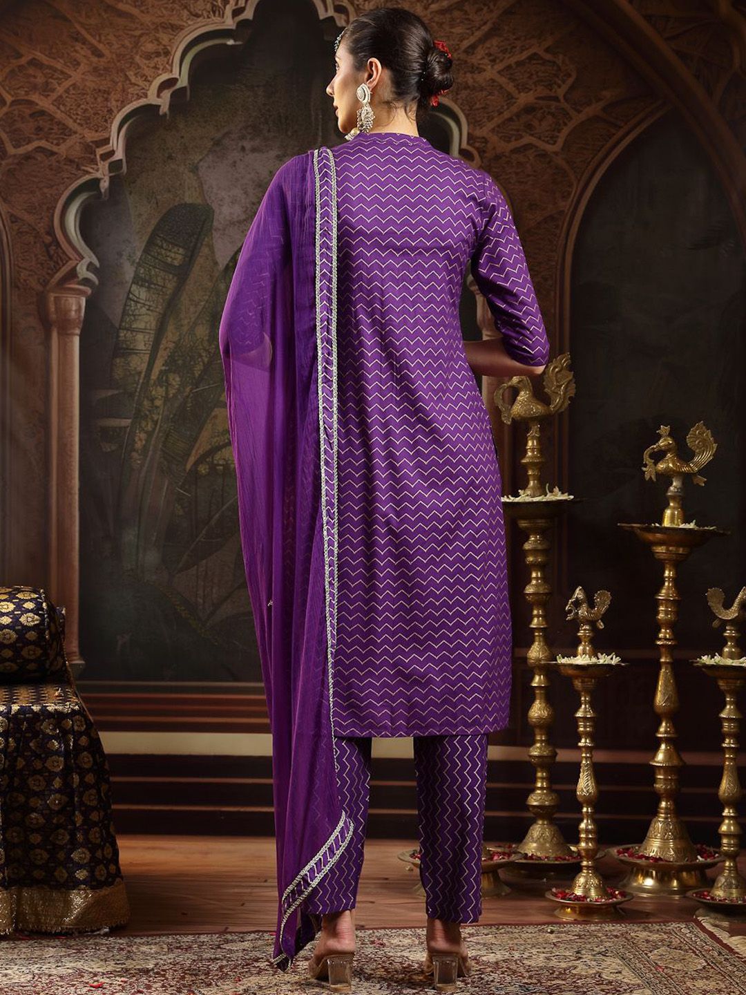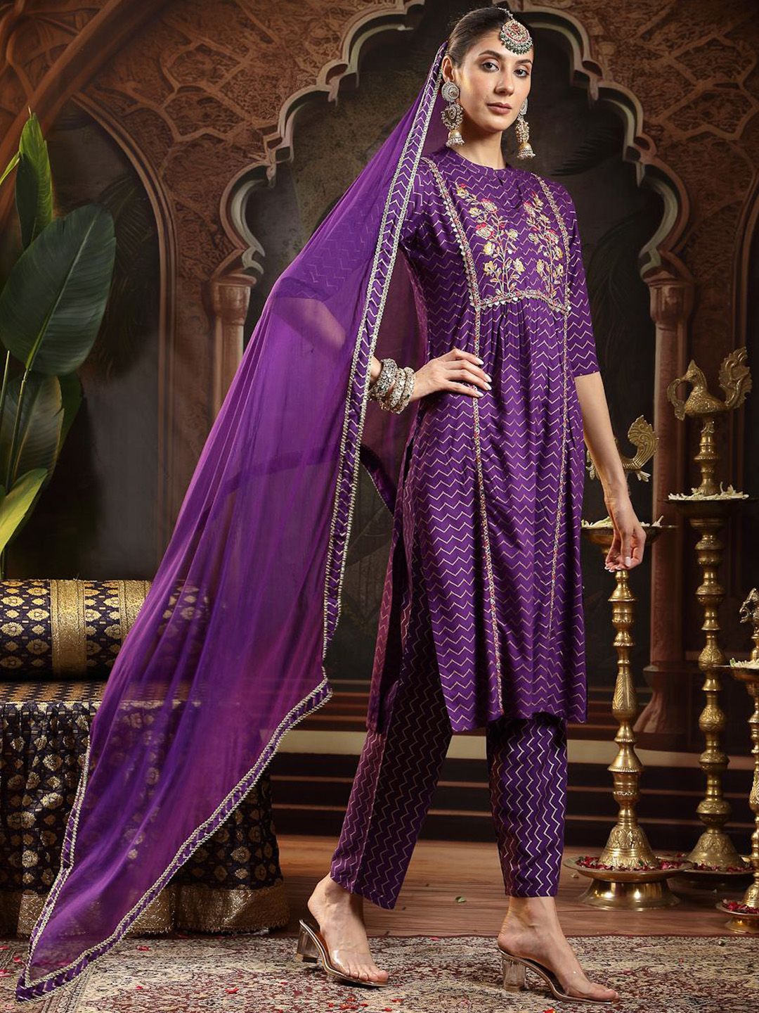 Stylum Ethnic Motifs Printed Thread Work Straight Kurta With Trousers & Dupatta