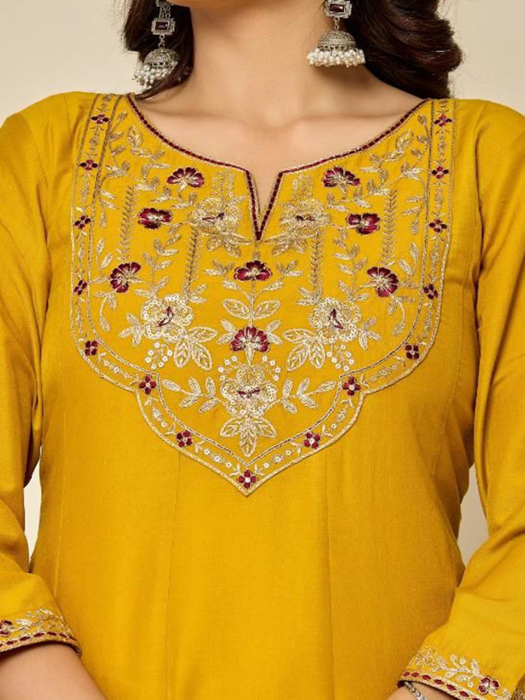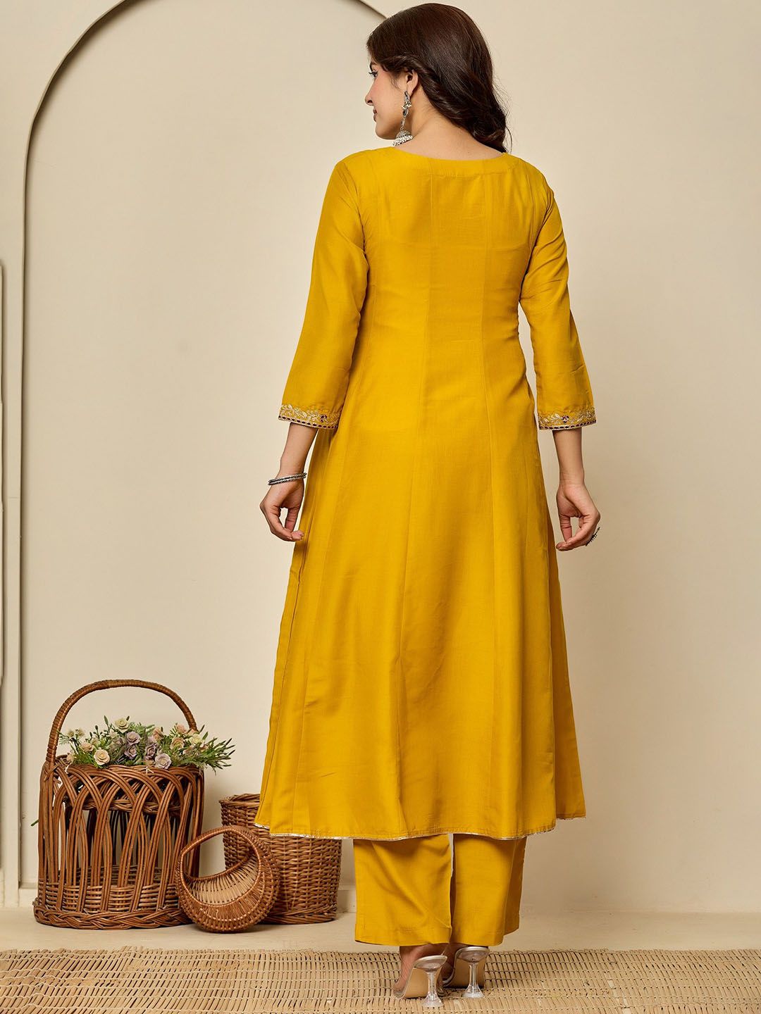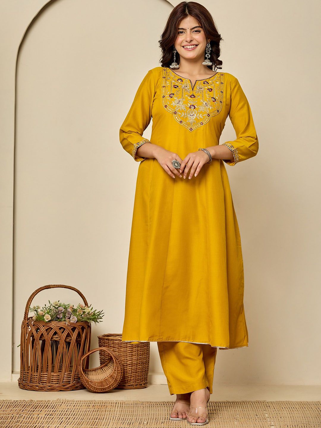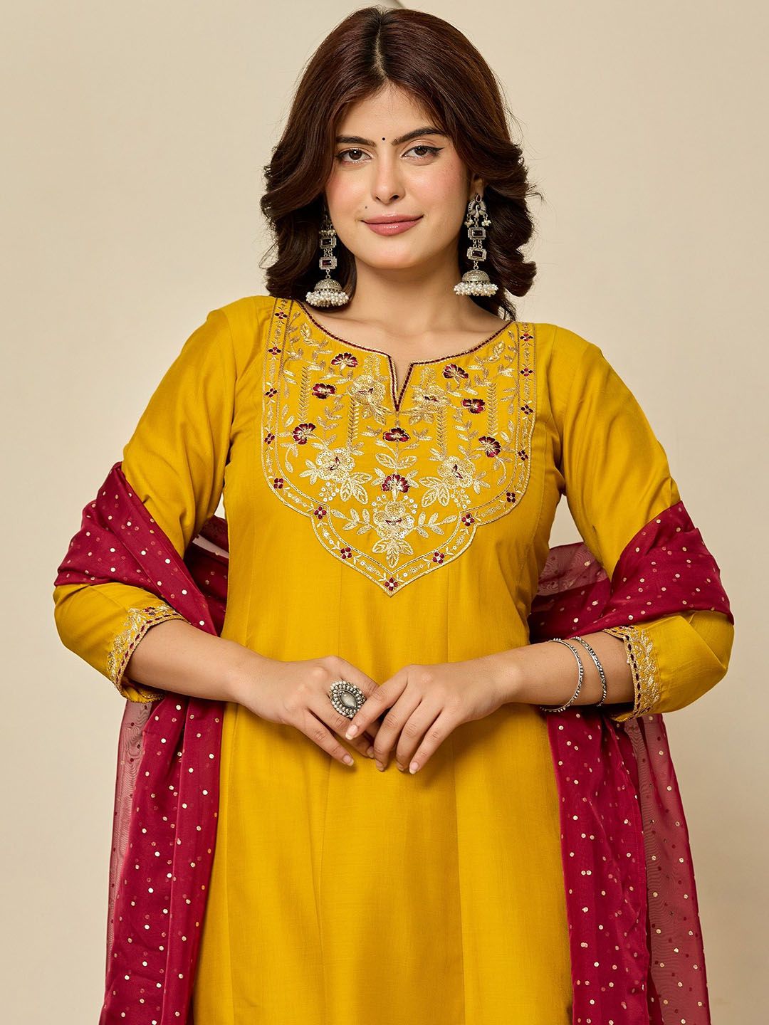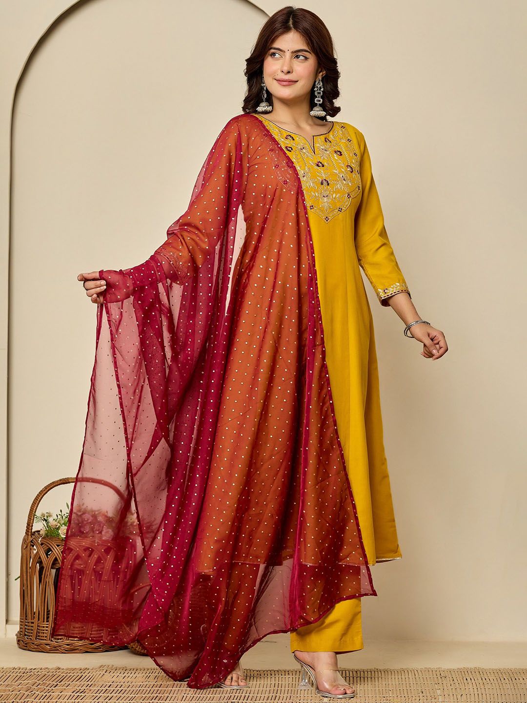 SUAAC Floral Yoke Design Thread Work A-Line Kurta With Trousers & Dupatta