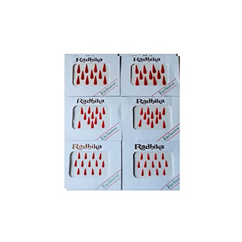 Tilak Shape Medium Size Red Colour Bindis for Girls and Women. Self Adhesive with skin friendly glue on it. Good for young girls and ladies Use for daily wear or any special occasion.This product is handmade 100% original medium size lndian forehead bindi.