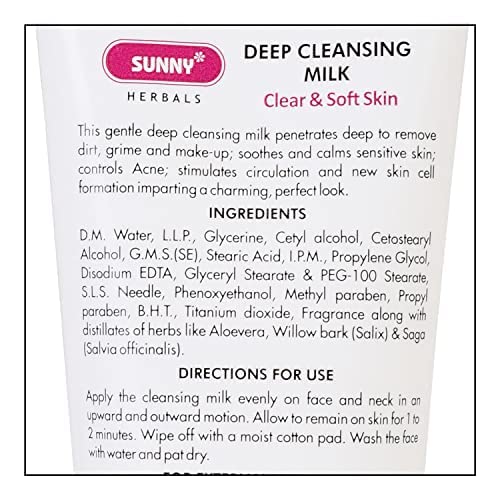 Sunny Deep Cleansing Milk gently cleanses the dirt, grime and makeup. Deep Cleansing Milk controls acne and soothes the sensitive skin Sunny Deep Cleansing Milk stimulates circulation & new skin cell formation Gives you a perfect charming look USAGE DIRECTION – Apply the Deep Cleansing Milk evenly on face and neck in an upward and outward motion. Allow to remain on skin for 1-2 minutes. Wipe off with a moist cotton pad. Wash the face with water and pat dry.