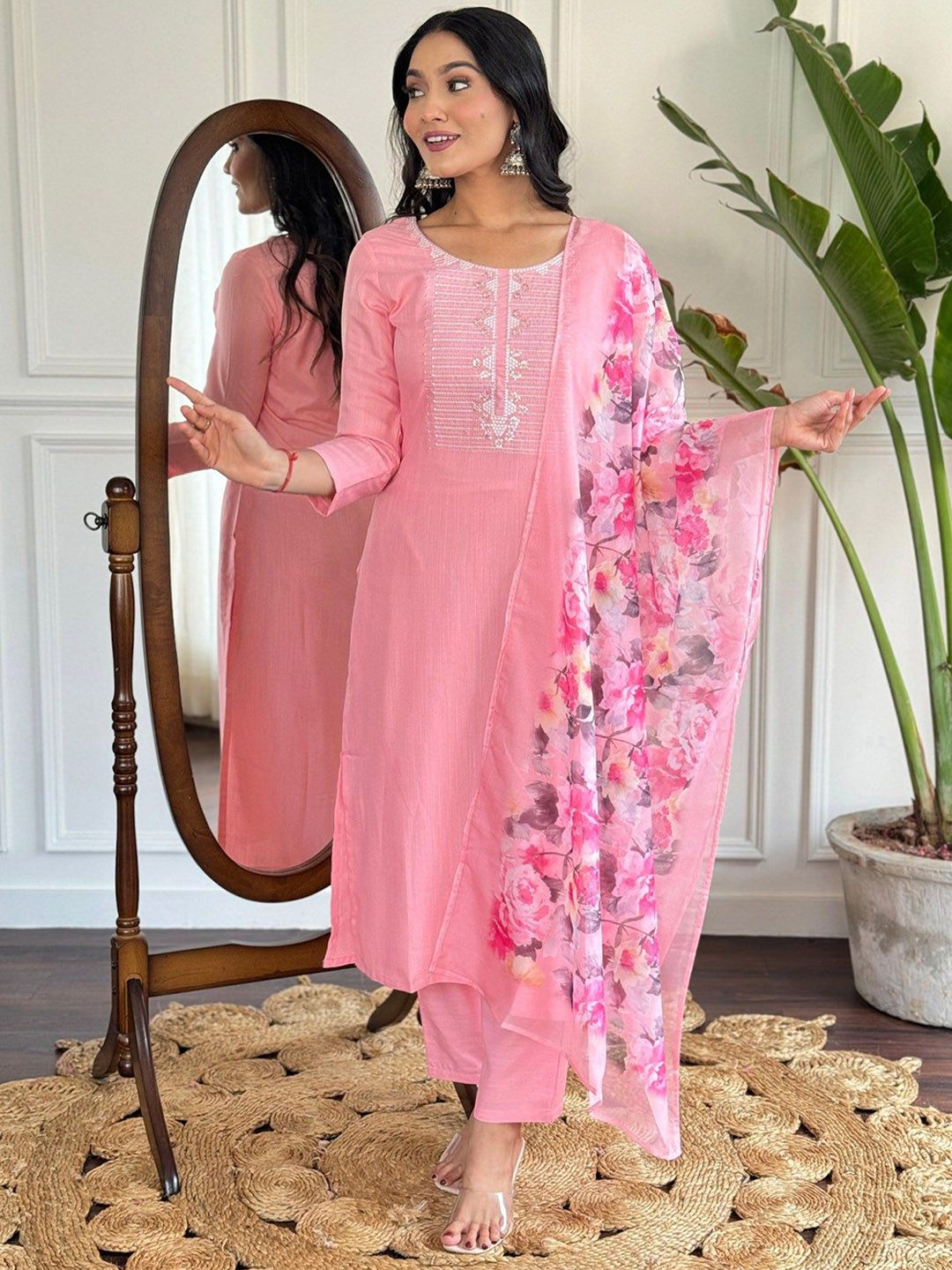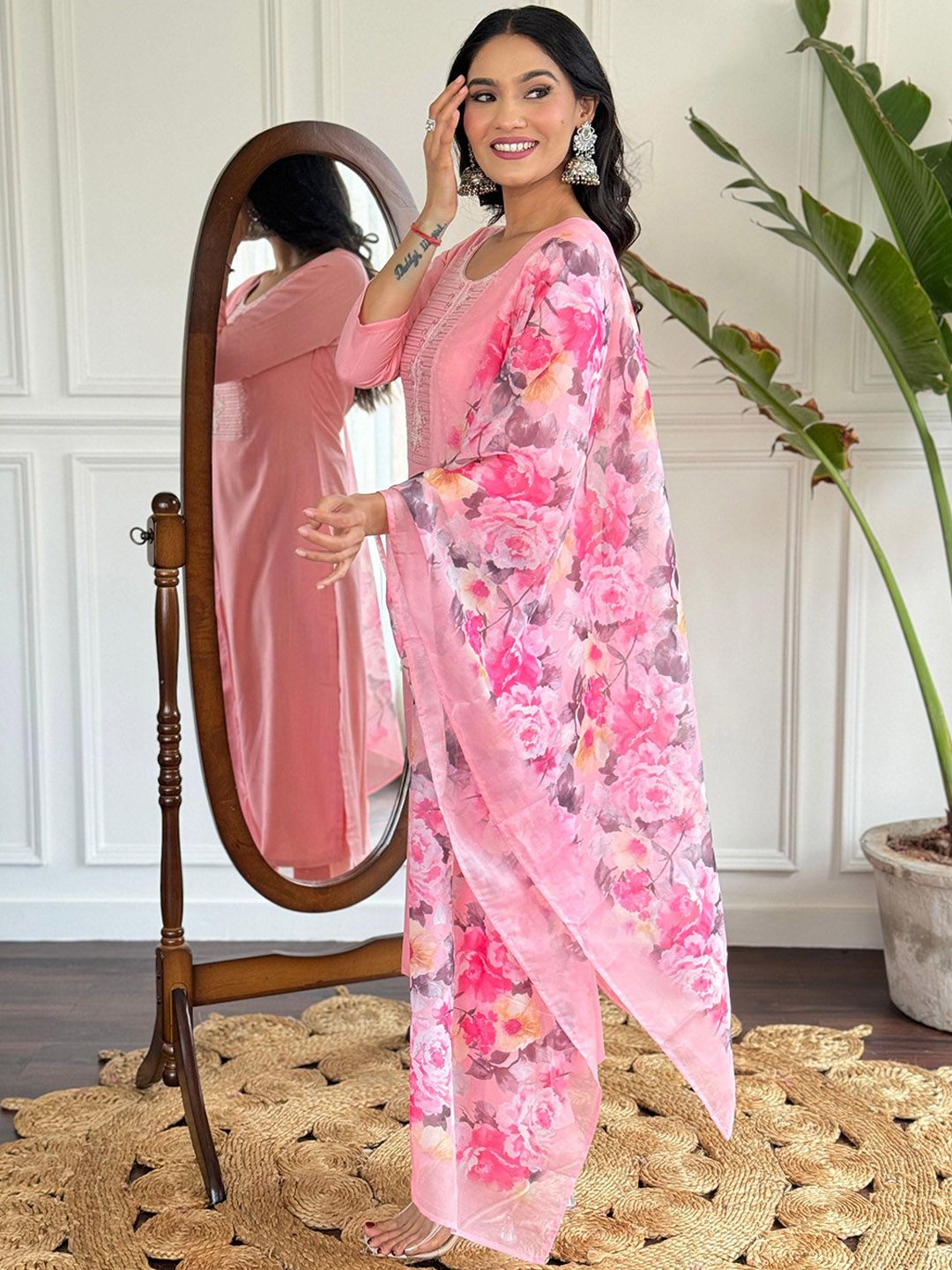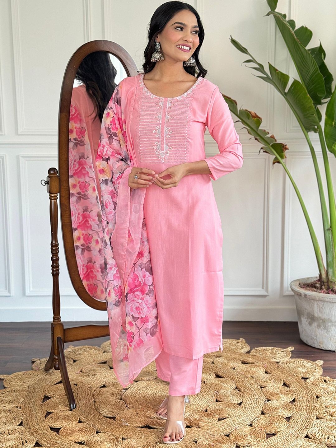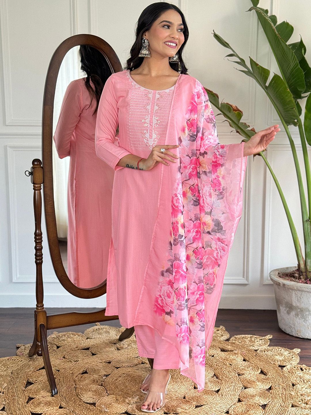 SUPPAR SLEAVE Floral Yoke Design Round Neck Straight Kurta With Trousers & Dupatta