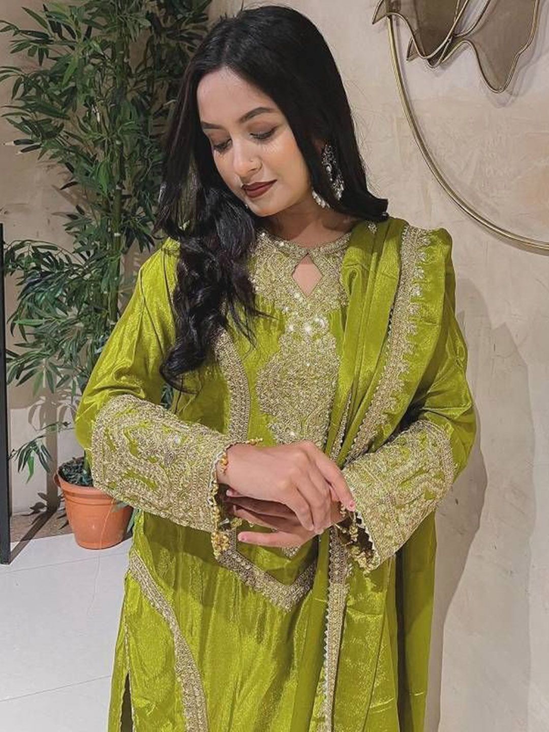 Buy this stylish SUPPAR SLEAVE Women Ethnic Motifs Embroidered Chanderi Silk Kurta with Trousers & Dpatta at Marincart Nepal. This product offers great quality and value. Perfect for those looking for the latest trends in fashion. Get yours now at unbeatable prices.