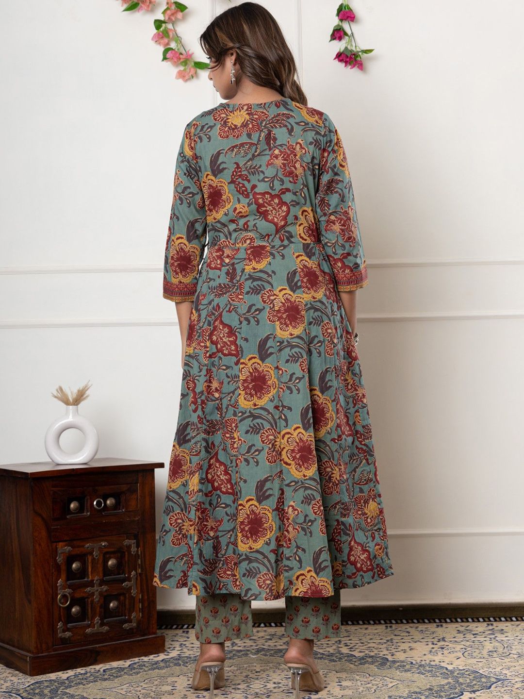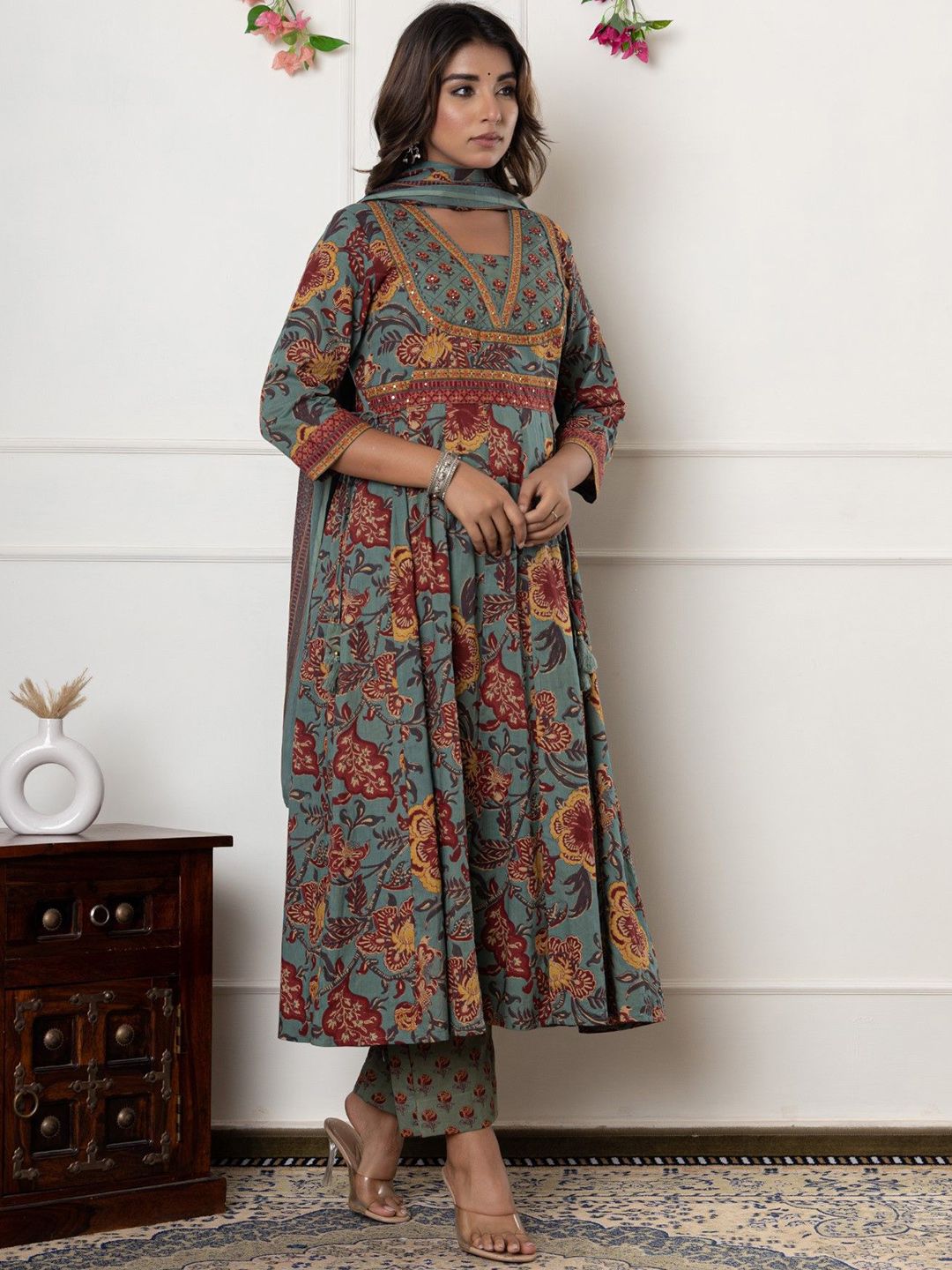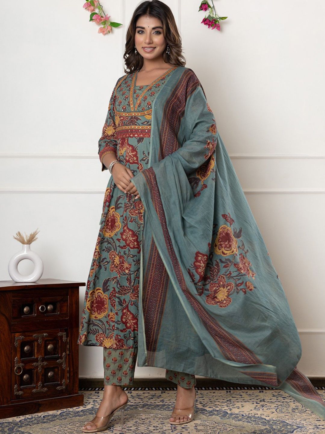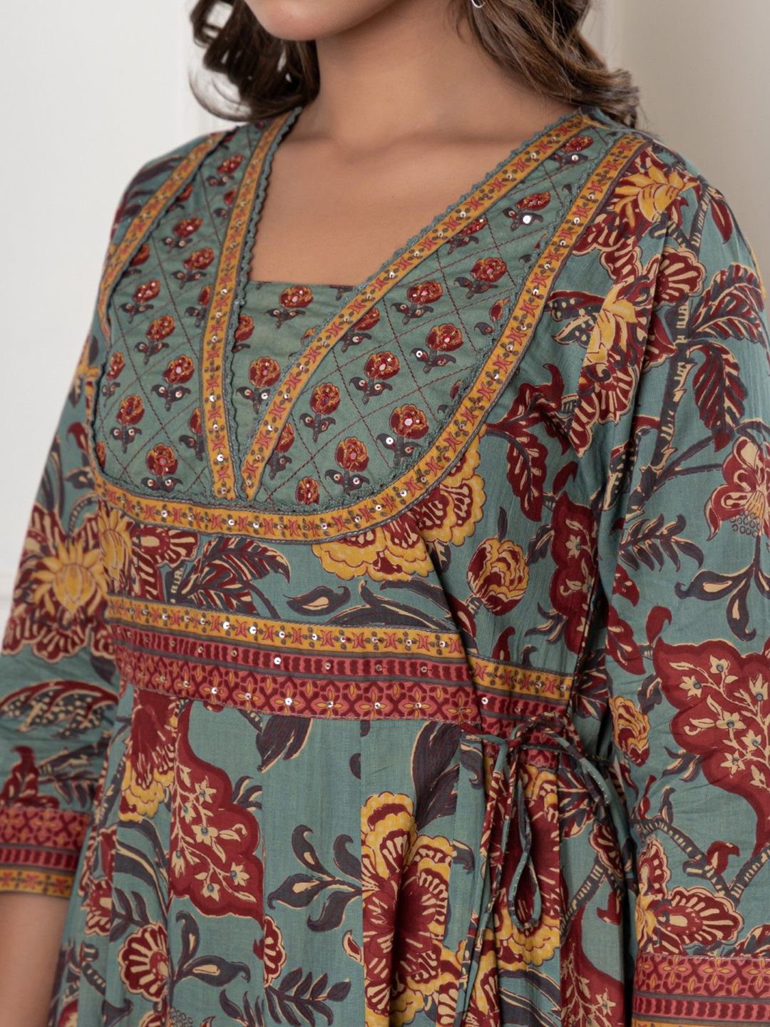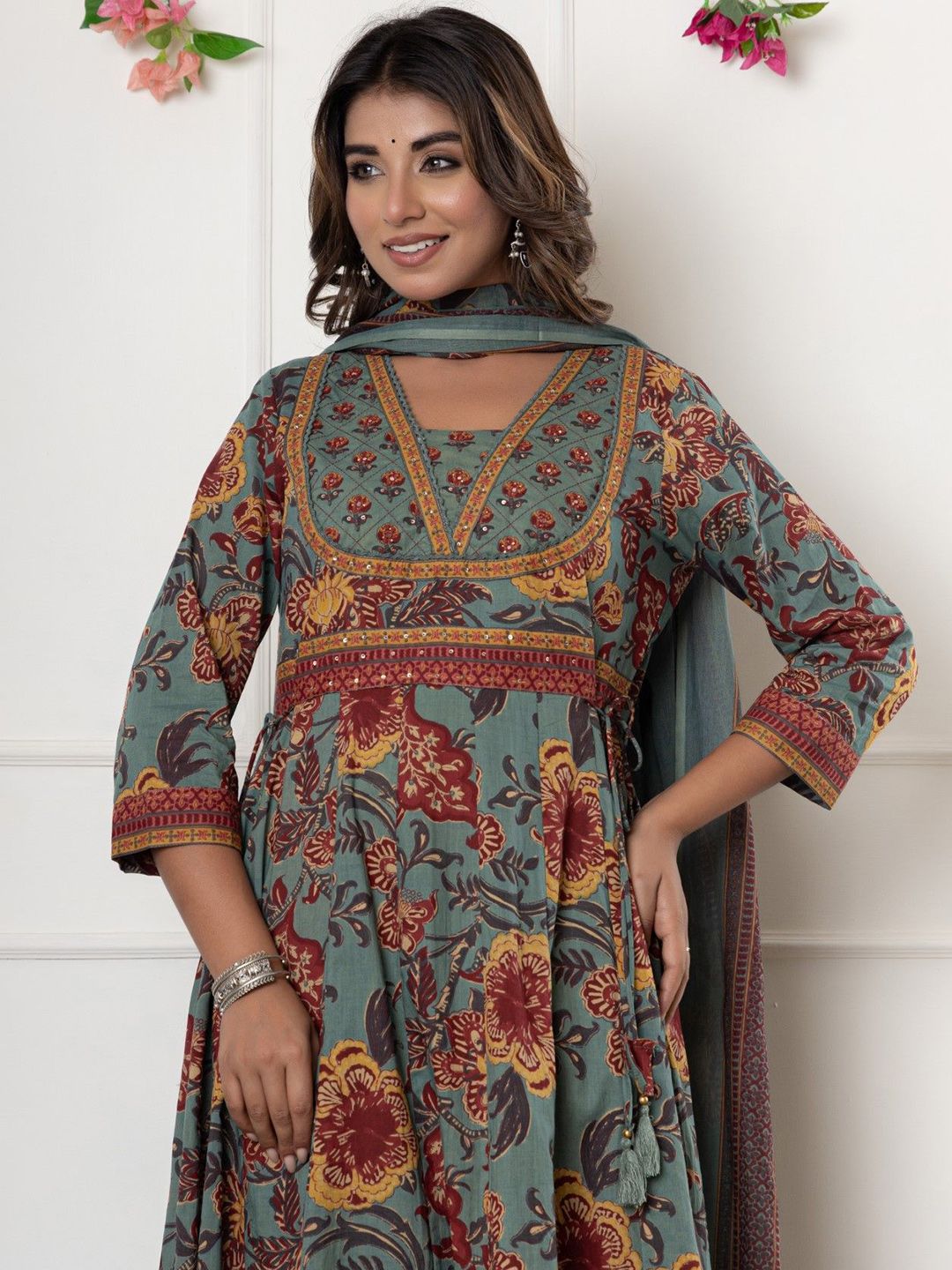 Swasti Floral Printed V-Neck Sequinned Pure Cotton Anarkali Kurta With Trousers & Dupatta