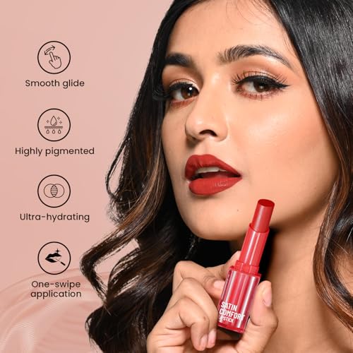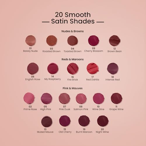Smooth Glide Formula: The buttery texture glides effortlessly onto your lips, giving you a smooth, even application every time. Ultra-Hydrating & Comfortable: Formulated with nourishing ingredients, this lipstick keeps your lips hydrated while providing long-lasting comfort throughout the day. Highly Pigmented: Get rich, intense colour payoff with every swipe. The highly pigmented formula ensures your lips stay vibrant and bold from morning to night. Satin Matte Finish: Experience the best of both worlds – a smooth, satin-like texture with a matte finish that’s both chic and comfortable. 20 Smooth Satin Shades: Choose from 20 beautiful satin shades to match your unique style and any occasion
