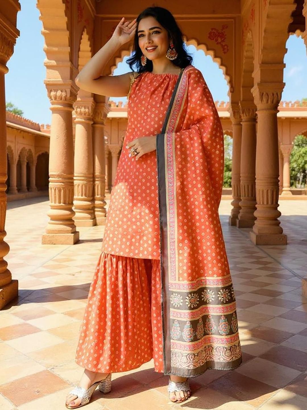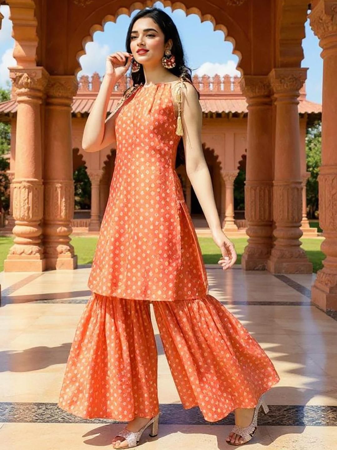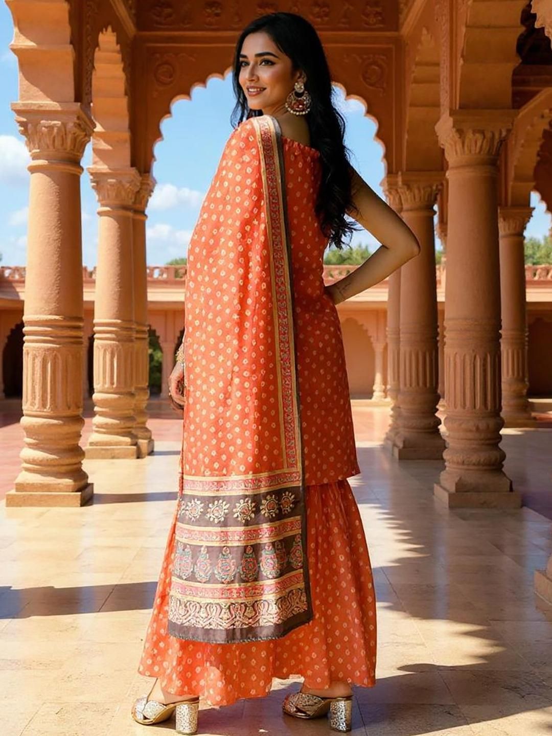 Buy this stylish SZN Bandhani Printed Sleeveless Chanderi Silk Straight Kurta With Sharara & Dupatta at Marincart Nepal. This product offers great quality and value. Perfect for those looking for the latest trends in fashion. Get yours now at unbeatable prices.