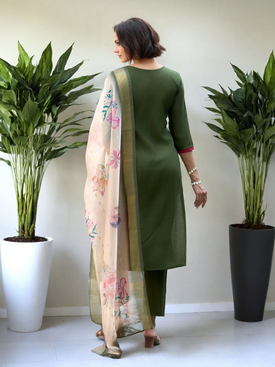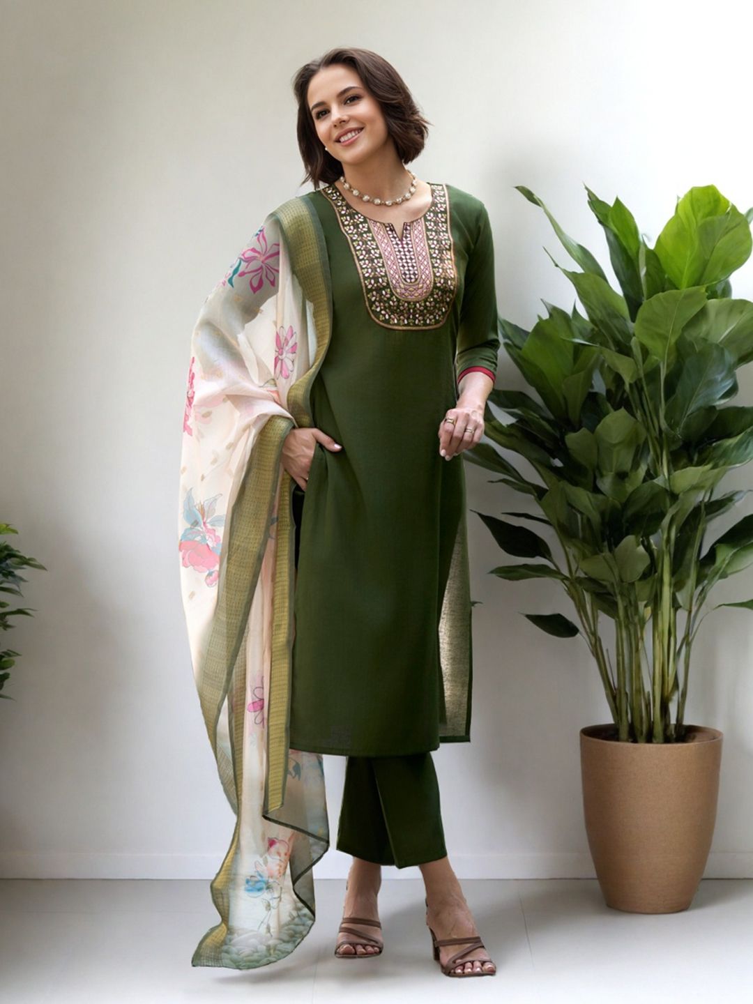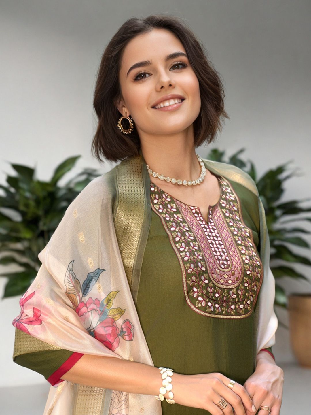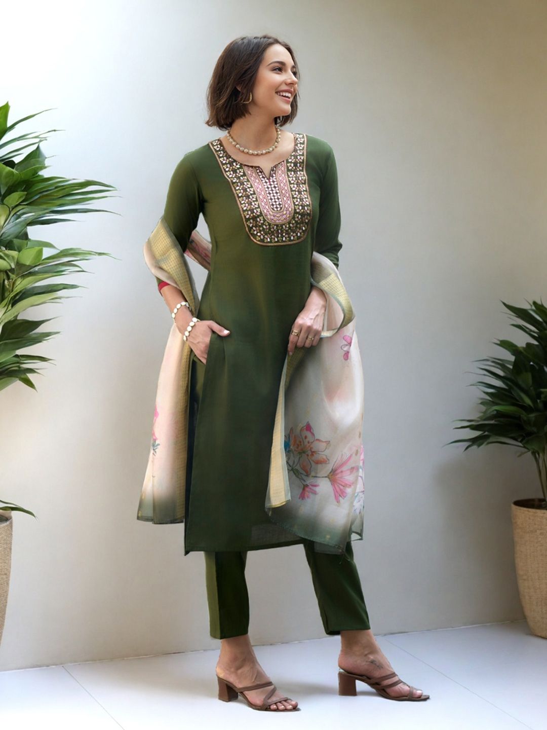 SZN Floral Embroidered Straight Sequinned Kurta With Trousers & Dupatta