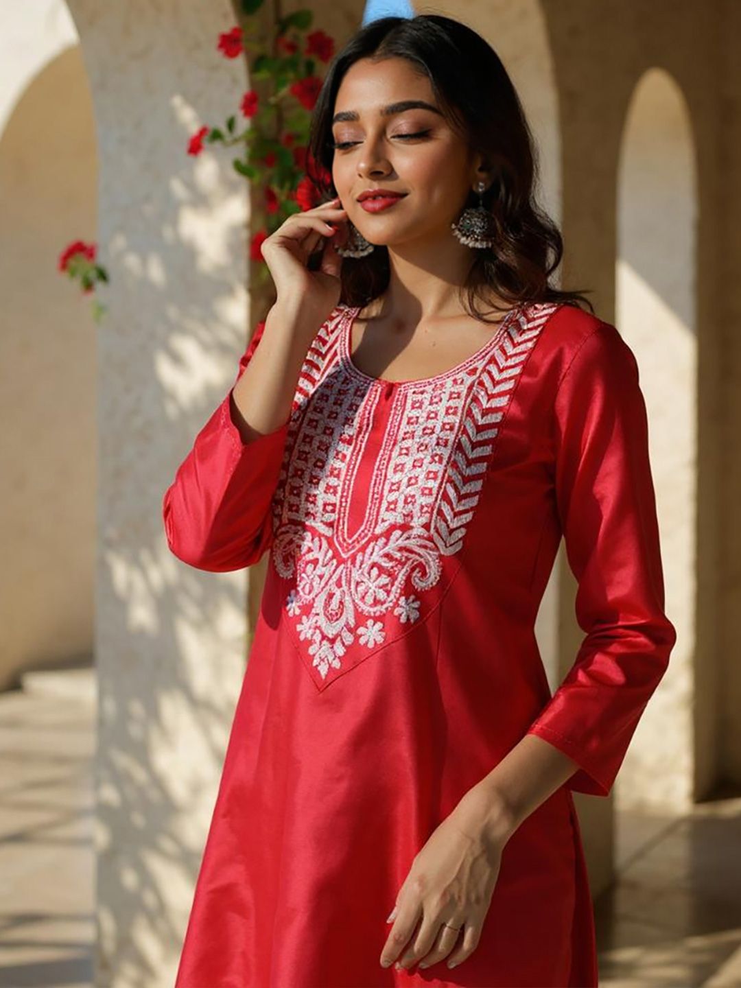 SZN Floral Yoke Design Notch Neck Thread Work Cotton Silk Straight Kurta With Trouser
