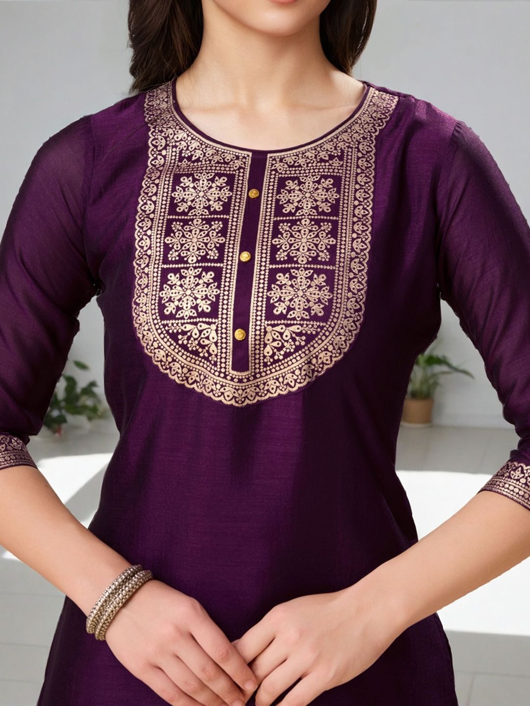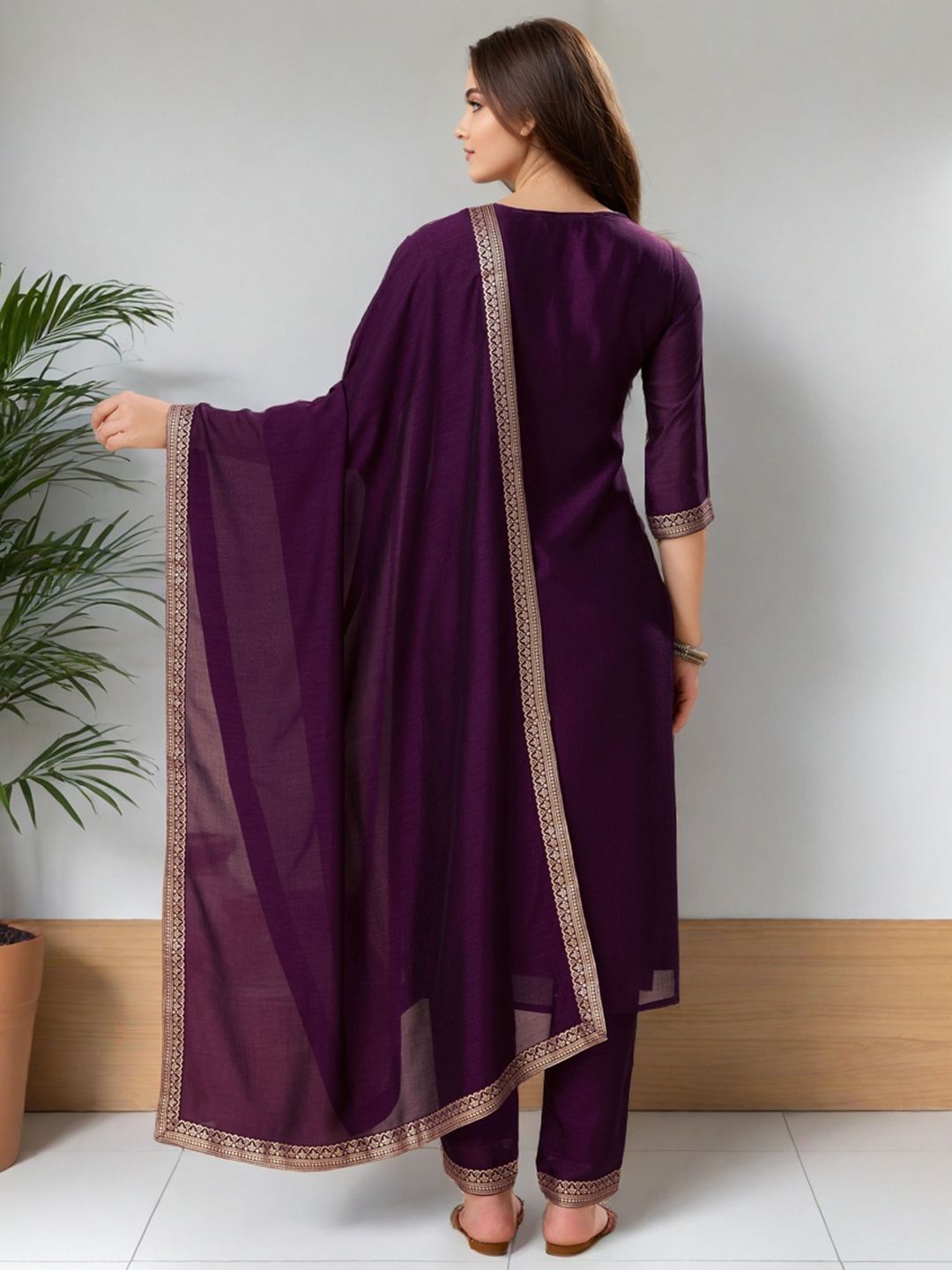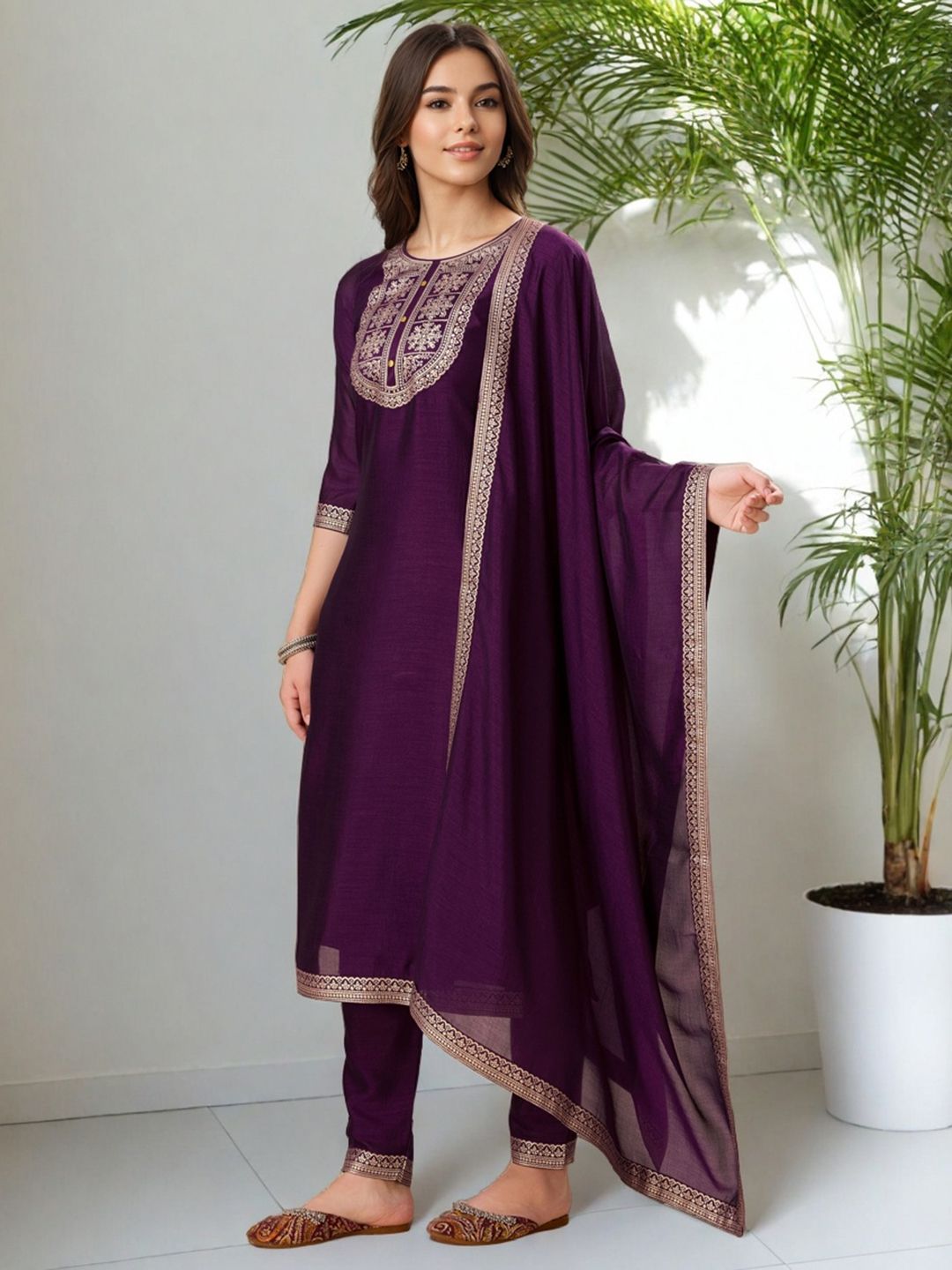 SZN Yoke Design Round Neck Straight Kurta With Trousers & Dupatta
