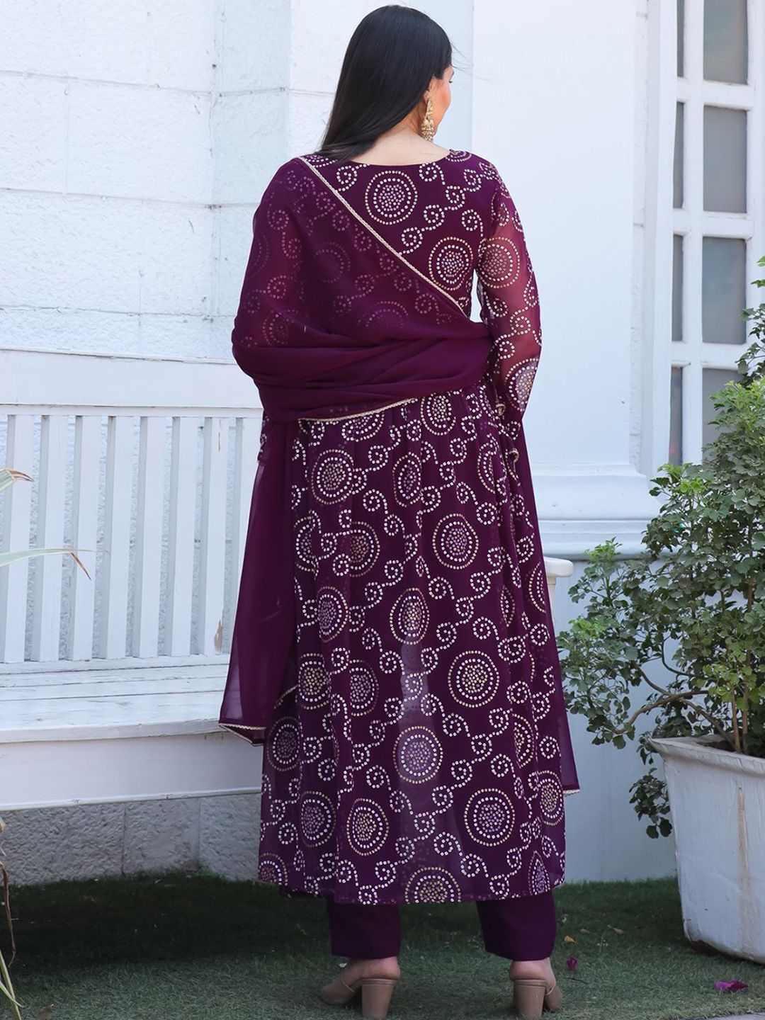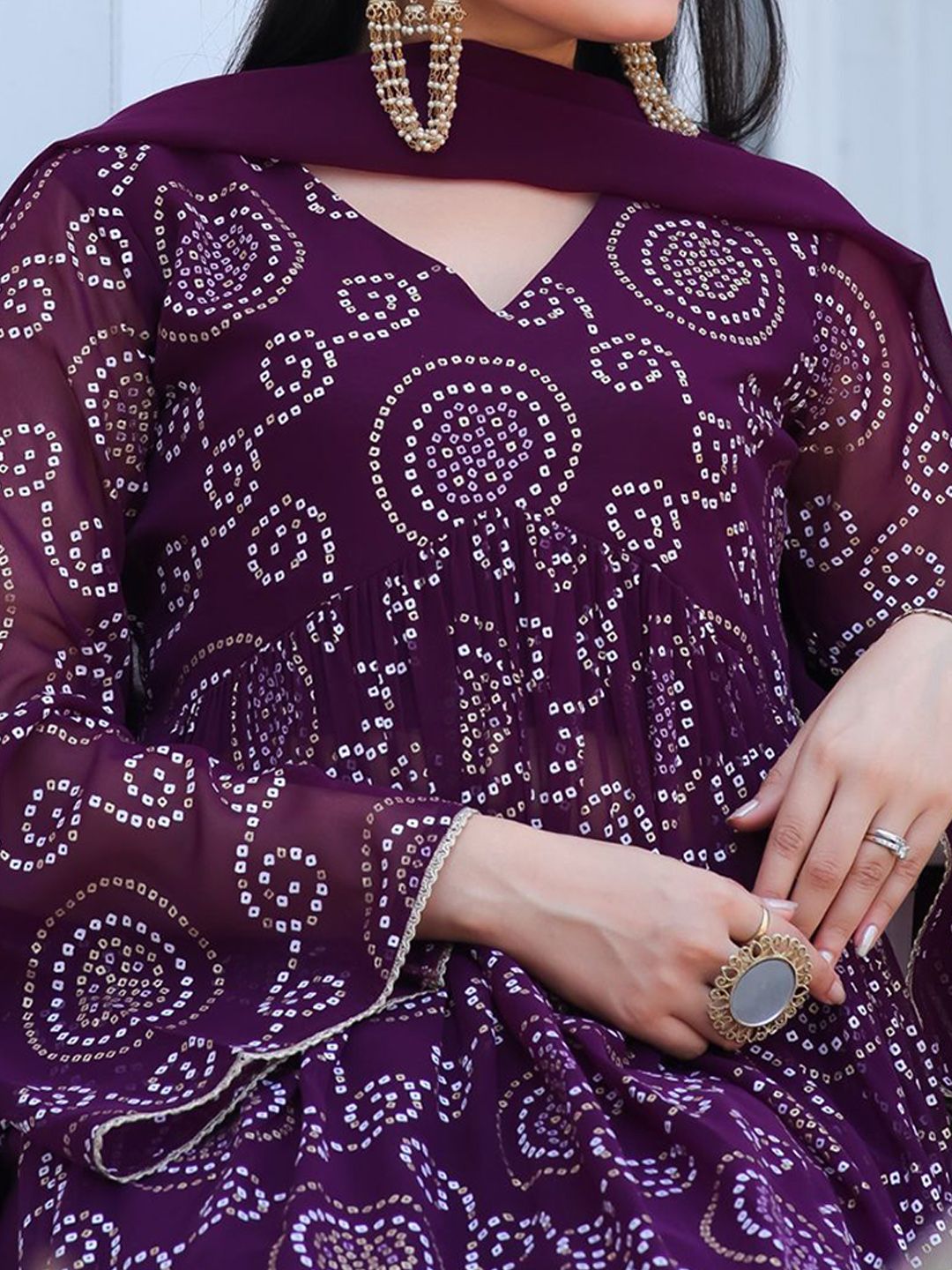 TextileNow Bandhani Printed Georgette V-Neck Empire Kurta With Trousers & Dupatta
