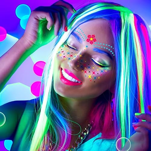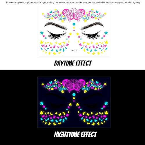 Fluorescent & Eye-Catching Designs – Features mermaid, butterfly, floral, and fantasy-inspired patterns that glow under UV light for a stunning party look. Temporary & Skin-Friendly – Made with non-toxic, waterproof materials that are safe, gentle, and comfortable for all skin types. Easy to Apply & Remove – Simply peel, stick, and press onto clean skin; removes effortlessly without irritation. Perfect for Festivals & Parties – Ideal for raves, concerts, cosplay, Halloween, birthday parties, and themed events. Long-Lasting & Sweatproof – Stays in place for hours, even in warm conditions, ensuring a flawless look all day or night.