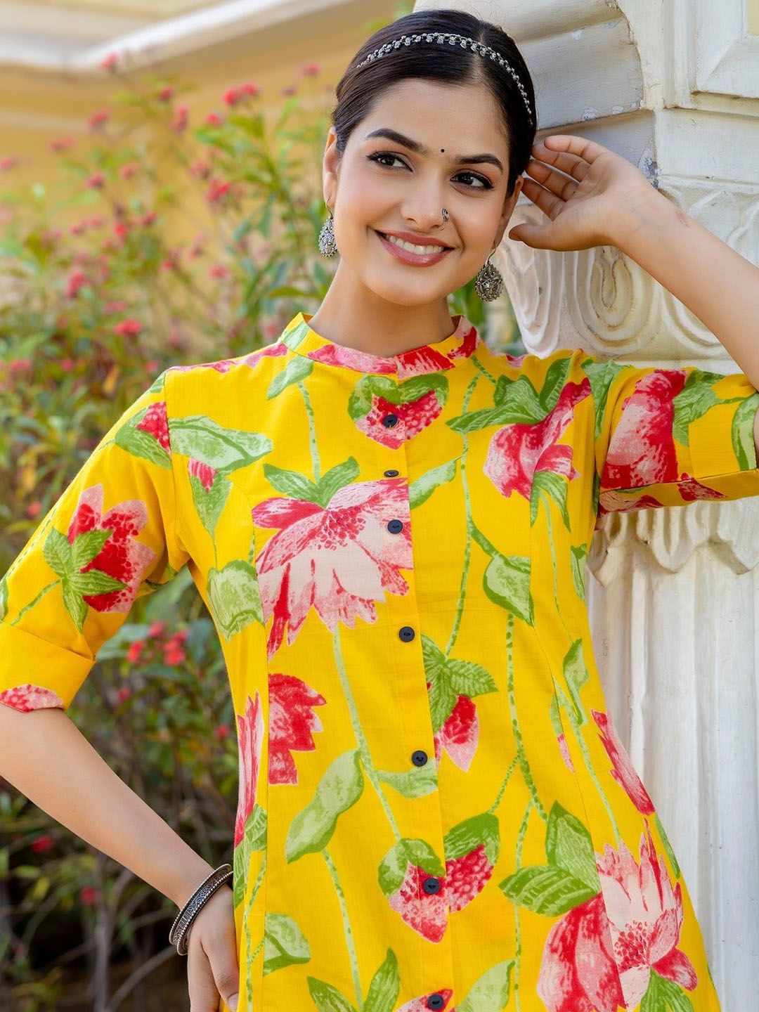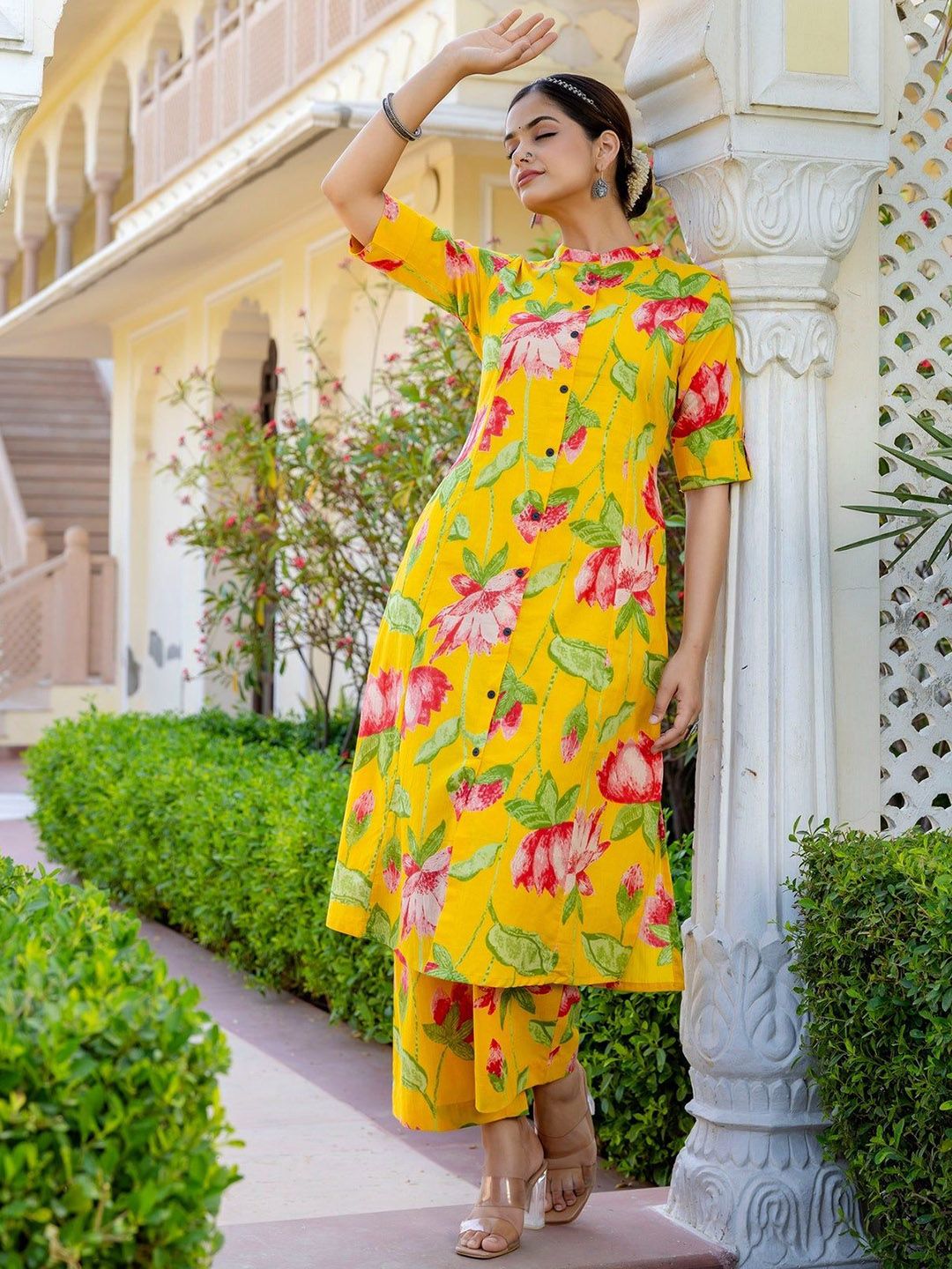 Buy this stylish THE FAB FACTORY Floral Printed Mandarin Collar A-Line Kurta With Palazzos at Marincart Nepal. This product offers great quality and value. Perfect for those looking for the latest trends in fashion. Get yours now at unbeatable prices.