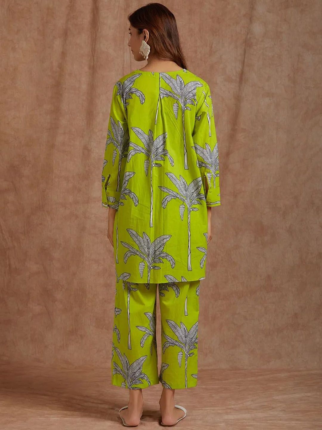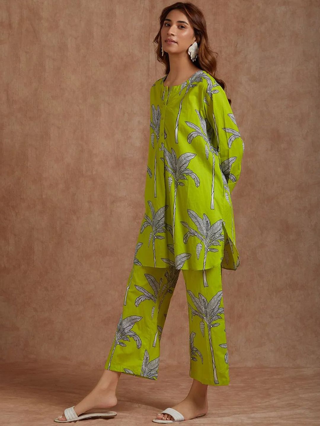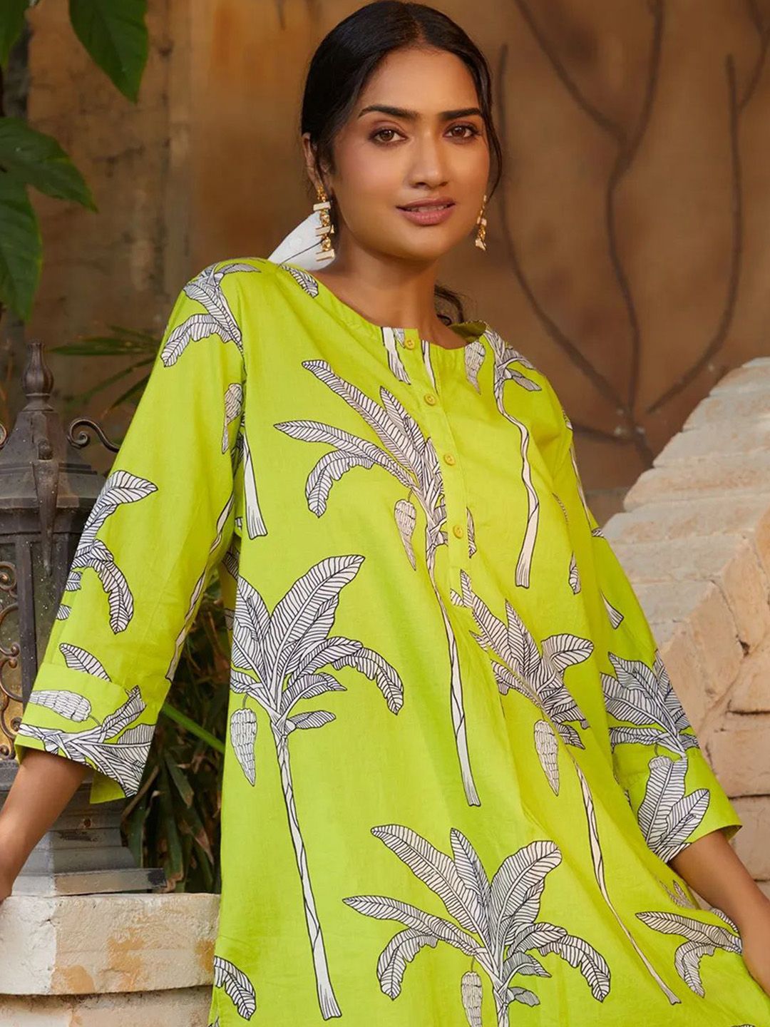 THE FAB FACTORY Floral Printed Round Neck Straight Kurta With Trousers
