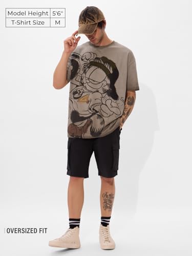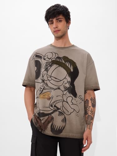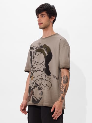 The Souled Store Garfield: Beat It Men and Boys Short Sleeves Round Neck Grey Puff Printed Cotton Oversized T-Shirts