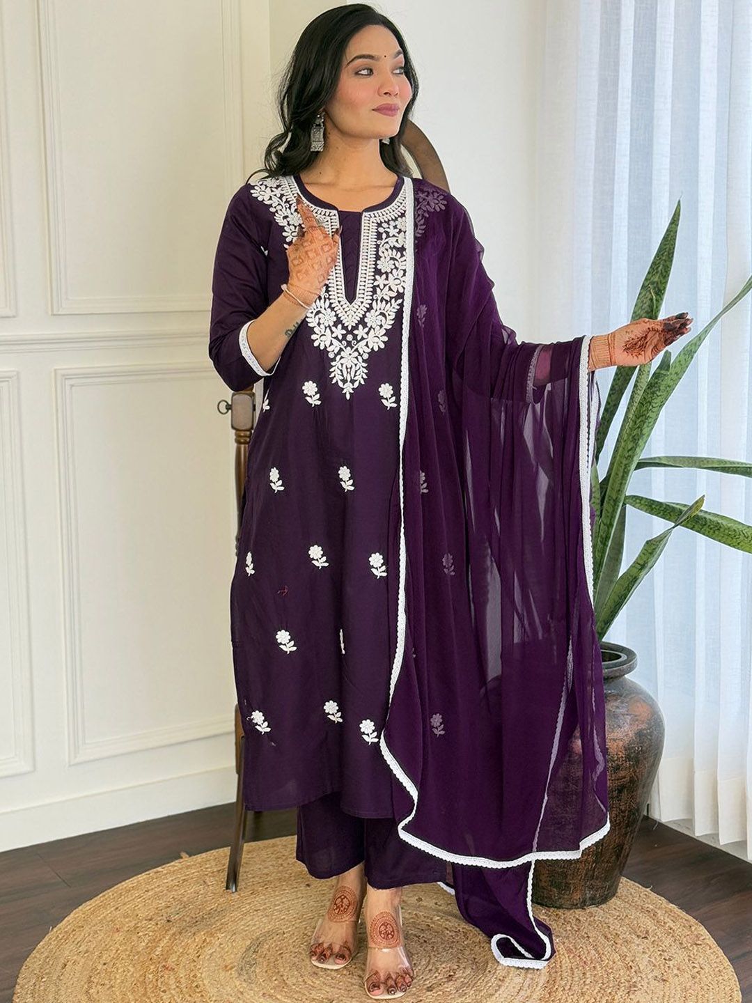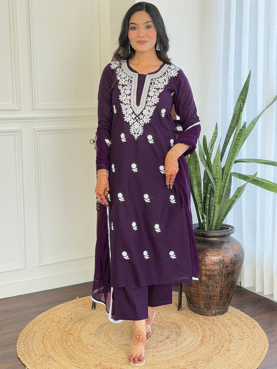 THE52 Women Floral Embroidered Regular Chikankari Pure Cotton Kurta with Trousers & With Dupatta