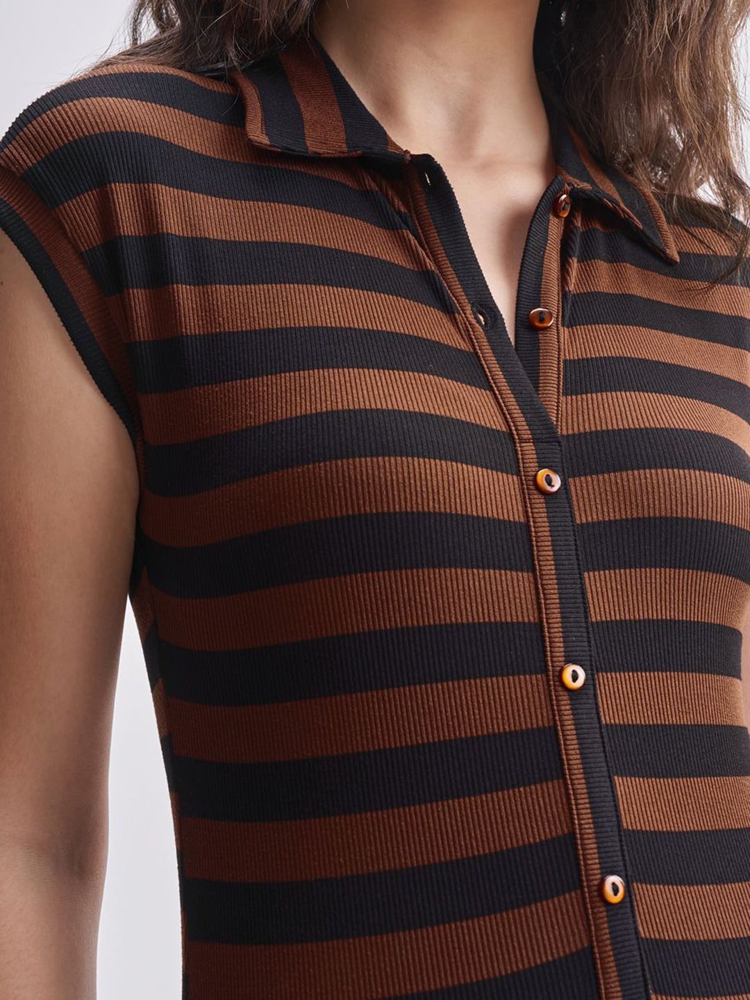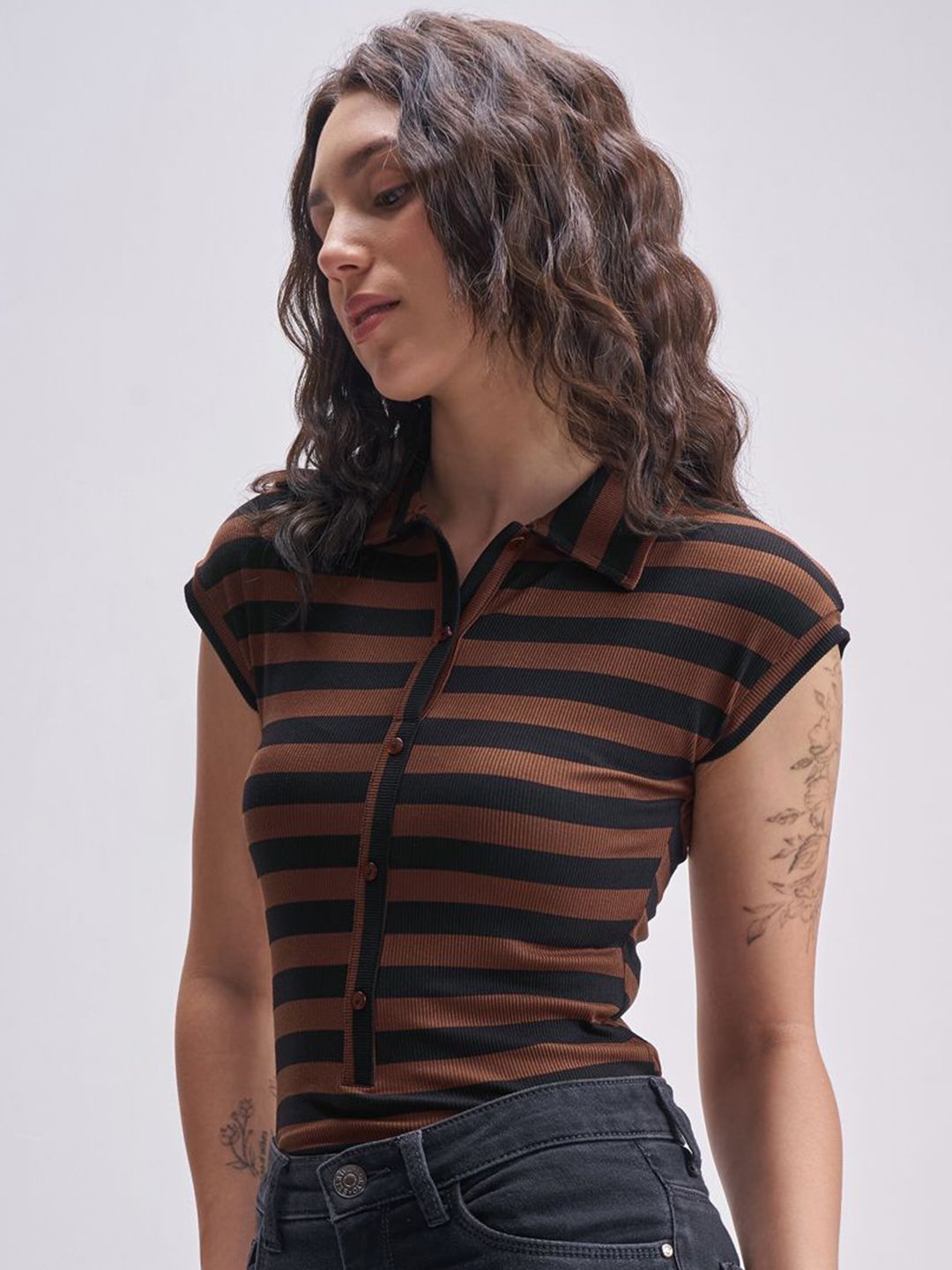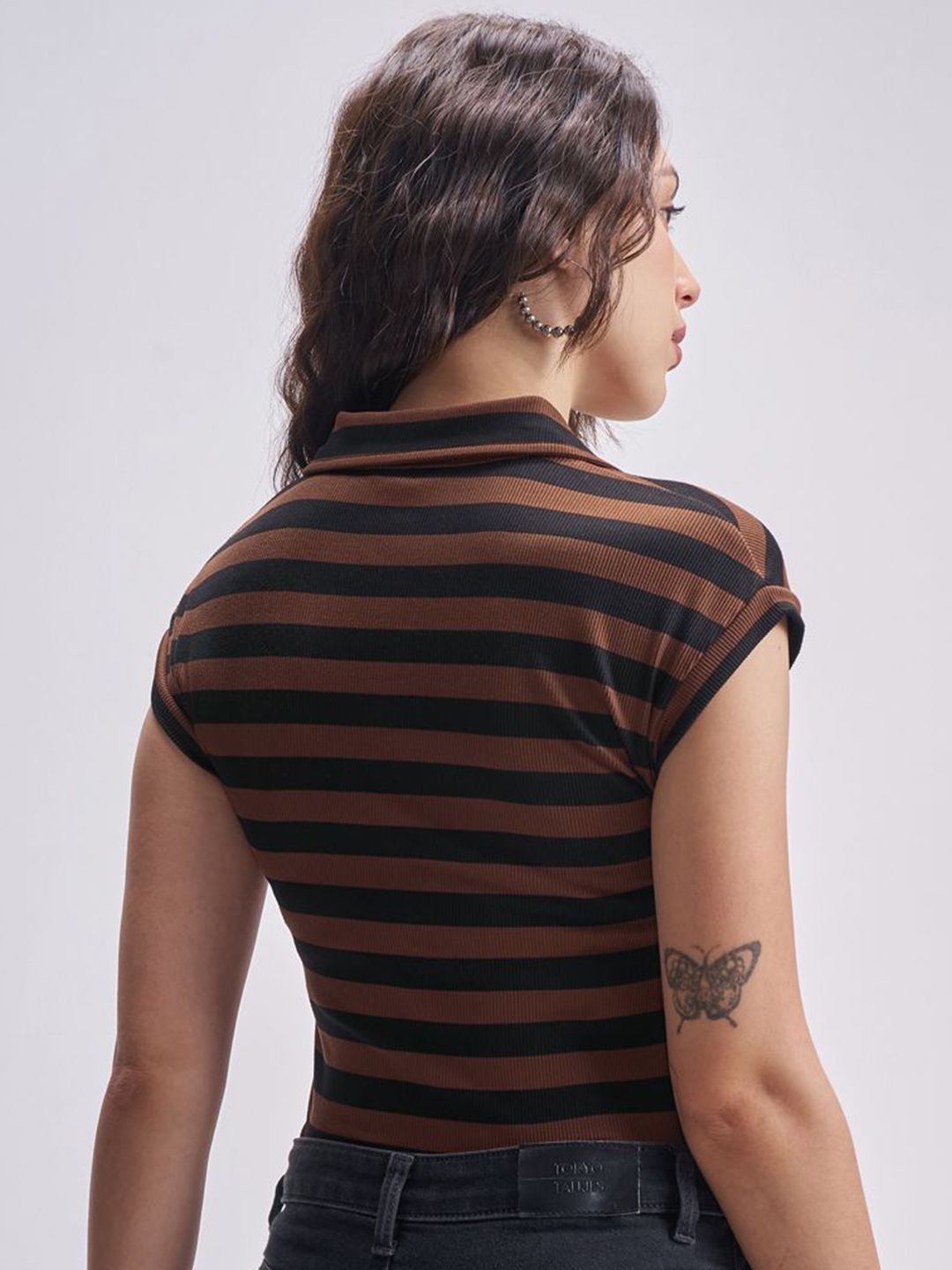 Tokyo Talkies Striped Shirt Collar Bodysuit