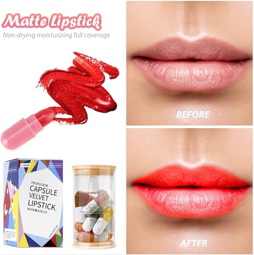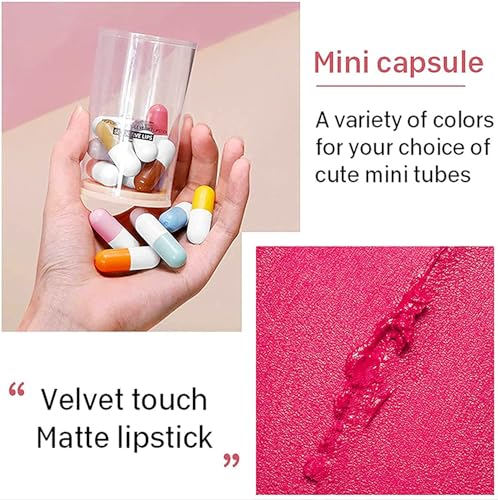 ??The mini size matte candy lipstick set includes 6 beautiful colors. You can choose the color you like according to your needs to make you full of charm. ??The small and cute capsule design is easy to carry and can be used at any time. It is easy to apply and clean without worrying about pigmentation. ??This professional creamy lips stick glides kit smoothly provide a true matte finish, full coverage delivers ultra-saturated lip shade. They contains moisturizing ingredients base for a lightweight comfort to skin and silky feel that does not dry your lips out. ??It is just silky, exquisite and elegant, make up your lips lightly, suitable for all seasons makeup items, especially in office, dating, shopping, summer party with friends.This is a very convenient, very beautiful lip cosmetic makeup set, easy to wear. ??This lipstick with a cute appearance and packaging is the best choice for gifts. And contains 6 colors, people who receive the gift will love it.
