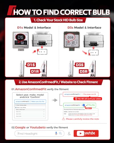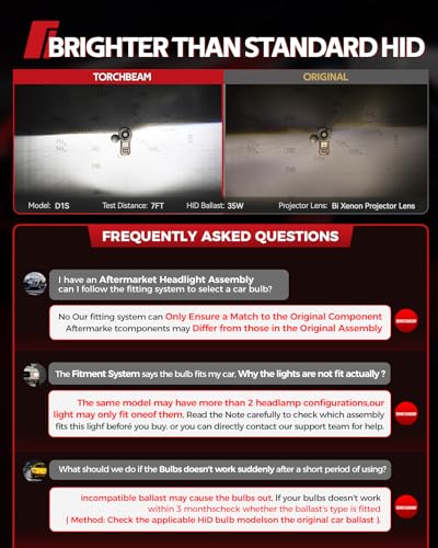 Safer Night Driving: Made with German xenon gas, 300% much brighter than halogen bulbs, Torchbeam D1S bulb provides additional 200ft lighting area for avoiding any safety hazards in 3S advance. Clearer Night Vision: 6000K , diamond bright white, it can illuminate the roadside signs more clearly than 4300K. Note: HID bulb usually uses a lens assembly, the bulb reaches its brightest level after a few seconds of lighting. Please confirm your car is HID assembly to avoid unable installation. Reduce Replacements Frequency: Equipped with shock-proof aluminum shell base, our xenon hid headlights can resist the damage caused by rain, snow and dust intrusion or high temperature inside the engine cover with IP 67 waterproof.; Extend Lifespan: 35W low power consumption, about half the 65W halogen lamps; Anti-ultraviolet coating can prevent the brightness of the bulb from dimming continuously within 5 years. Simpler Installation: Factory specification design, no dashboard error, the replacement will be completed in a few minutes at home. Warm tips?Most car models have more than two assemblies. If you are not sure, please feel free to contact us for detail information. Fit Type: Universal Fit