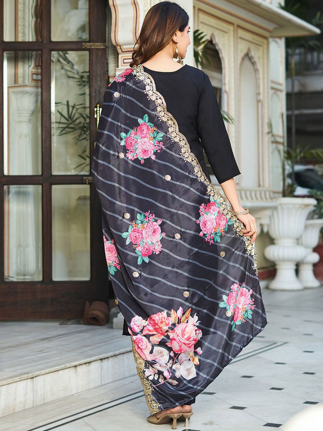 TRAHIMAM Floral Yoke Design V-Neck Chanderi Silk Straight Kurta With Trousers & Dupatta