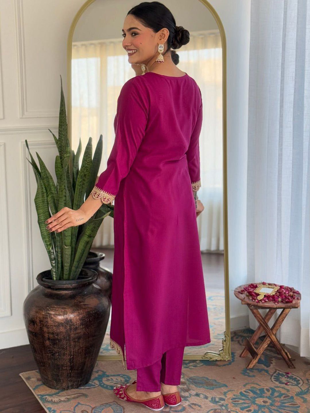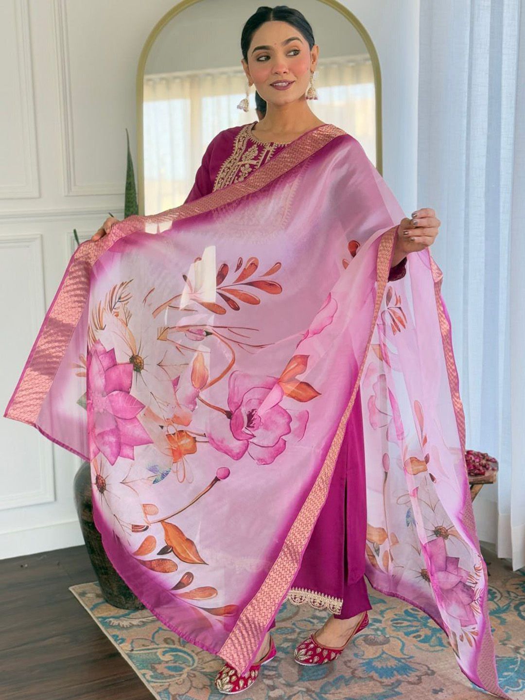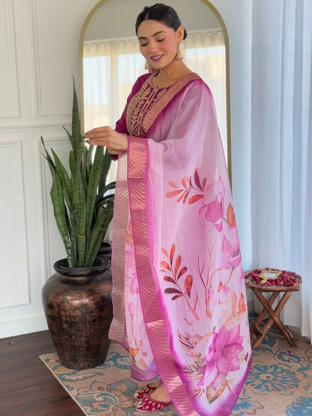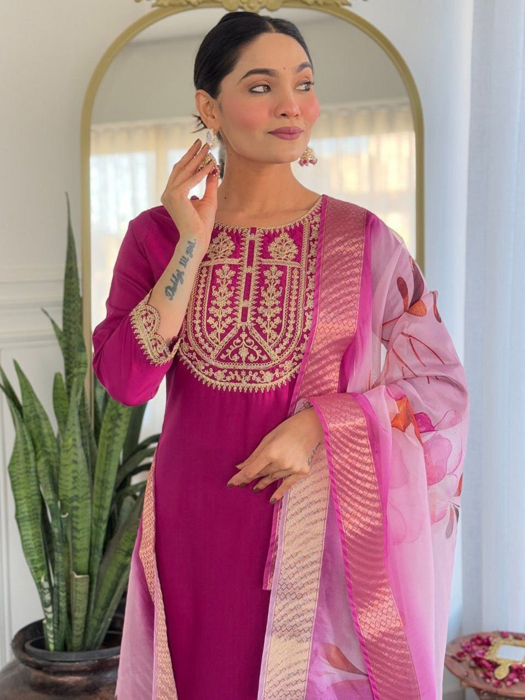 TRAHIMAM Women Ethnic Motifs Yoke Design Kurta with Trousers & Dupatta