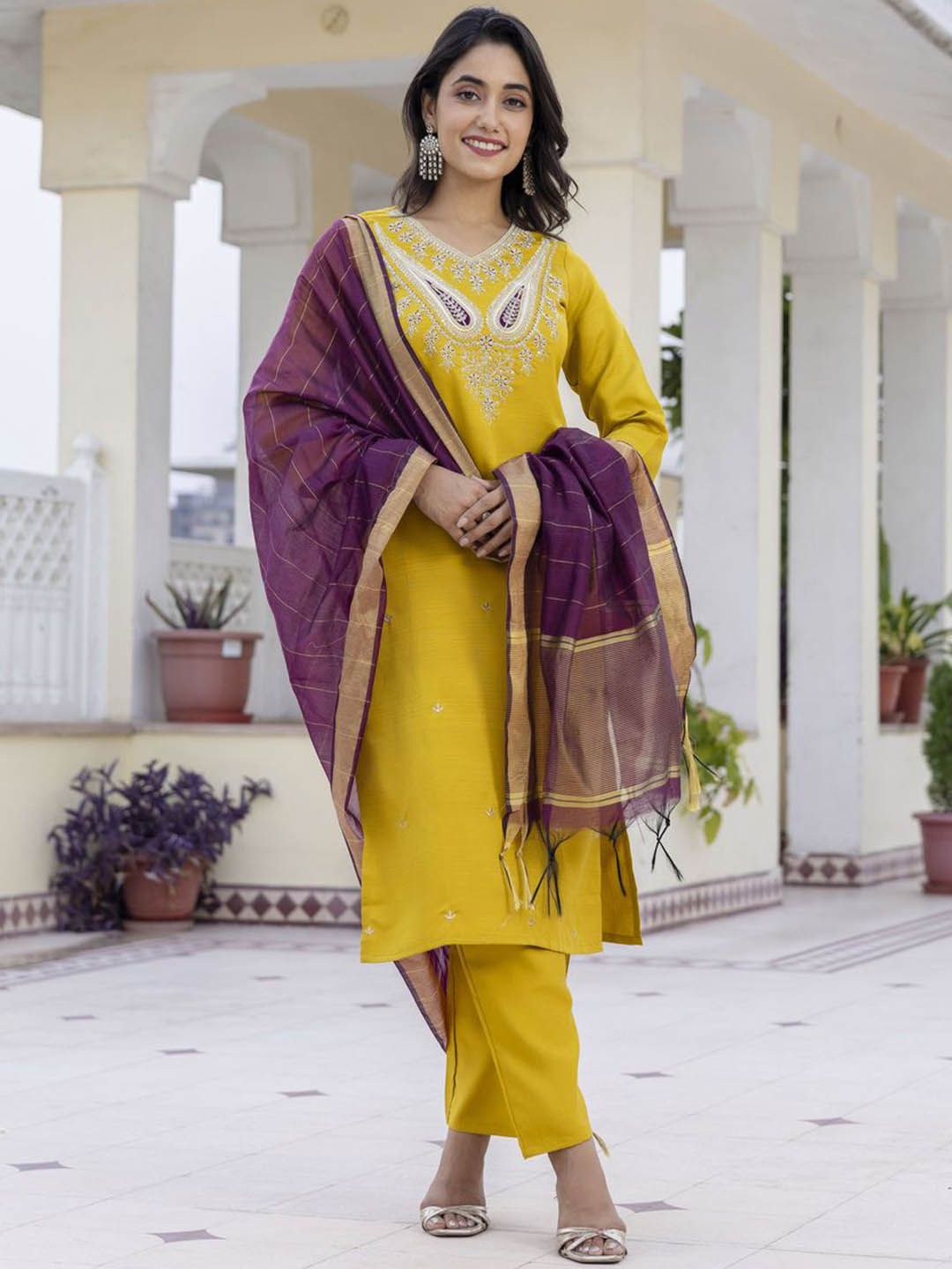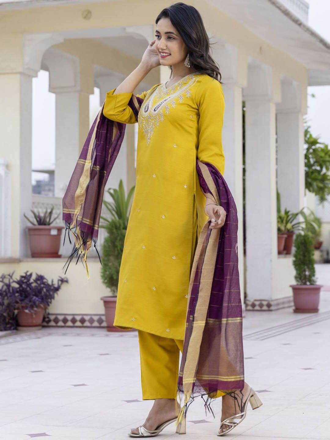 Twika Women Ethnic Motifs Embroidered Chanderi Silk Kurta with Trousers & Dupatta
