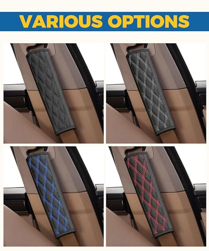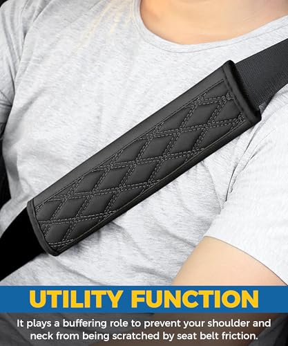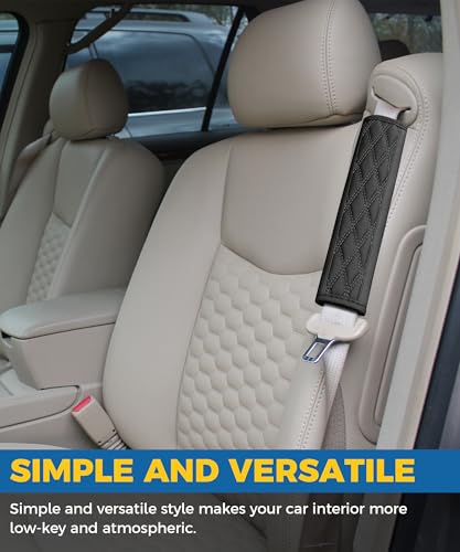 [Material] The car seat belt cover pad is made of high-quality leather material, which is soft and wear-resistant, preventing the seat belt from rubbing your neck and shoulders. Avoid making you feel uncomfortable, very strong and durable. [Product Design] The seatbelt covers are designed with a diamond stitching pattern, and the simple and versatile style is highly integrated with your car decoration. It is exquisite, compact, high-quality in appearance, and classic in shape. It can decorate your car and make your car more beautiful and dazzling. [Size] You will receive 2 car seat belt pads, measuring 9.06x2.76x0.79 inches, suitable for the main seat and passenger seat. In addition, the conspicuous presence of the seat belt pad can also help you solve the problem of the electronic eye mistakenly catching you not wearing a seat belt! [Easy Operation] The car seat belt shoulder pad can be quickly installed and removed without any tools, the installation is very simple, when you do not need it, just remove it and store it, it does not take up too much space in the car. [Function] In the event of emergency braking or an accident, it can provide better cushioning and protect your family's shoulders. This seat belt cover is suitable for all car seat belts and can be easily installed on the seat belts of most cars, trucks, RVs, vans and SUVs.