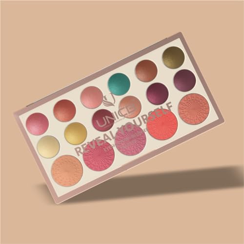 Versatile 17-Shade Palette: UNICB Reveal Yourself Eyeshadow Blusher features 17 dazzling matte and blusher shades, including a blendable highlighter and blusher, ensuring a wide range of stunning makeup options for any occasion. Long-Wear Technology: Formulated with advanced long-wear and crease-resistant technology, this eyeshadow palette offers a day-to-night color wardrobe, keeping your eyes vibrant and fresh for a dazzling 24 hours. Easy Application: The creamy and blendable powder ensures a seamless application process. Whether you're going for a natural everyday look or a bold, vibrant style, this palette makes it easy to achieve your desired makeup look. Vegan and Cruelty-Free: Certified by V-label, a vegan certification authority with strict standards, this eyeshadow palette is vegan-friendly and cruelty-free. Feel good about your makeup choices while looking fabulous. Complements All Tones: From classic matte to bold pearls and blusher, the color combination in this palette complements all skin tones and eye colors. Create soft, glistening blusher looks that enhance your natural beauty.