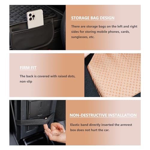 PREMIUM DESIGN: Quilted microfiber leather console cover with diamond pattern stitching adds luxury and protection to your vehicle's center armrest UNIVERSAL FIT: Compatible with most vehicle models' center console armrests, providing a custom-looking upgrade to your car's interior STORAGE SOLUTION: Features convenient side pockets to keep your phone, cards, and small items within easy reach while driving COMFORT UPGRADE: Padded cushion design provides extra comfort for your elbow while operating the vehicle or during long drives EASY INSTALLATION: Simply place over your existing console - no tools or modifications required, with non-slip bottom to keep cover securely in place
