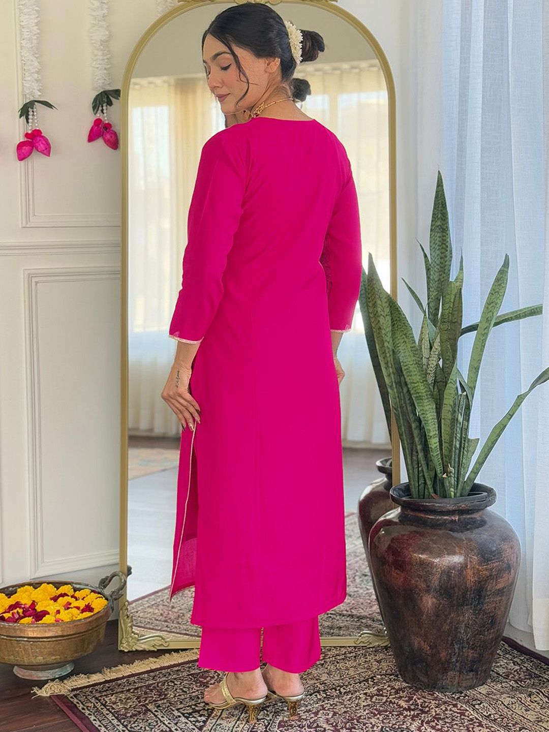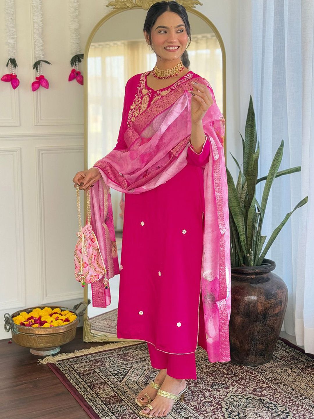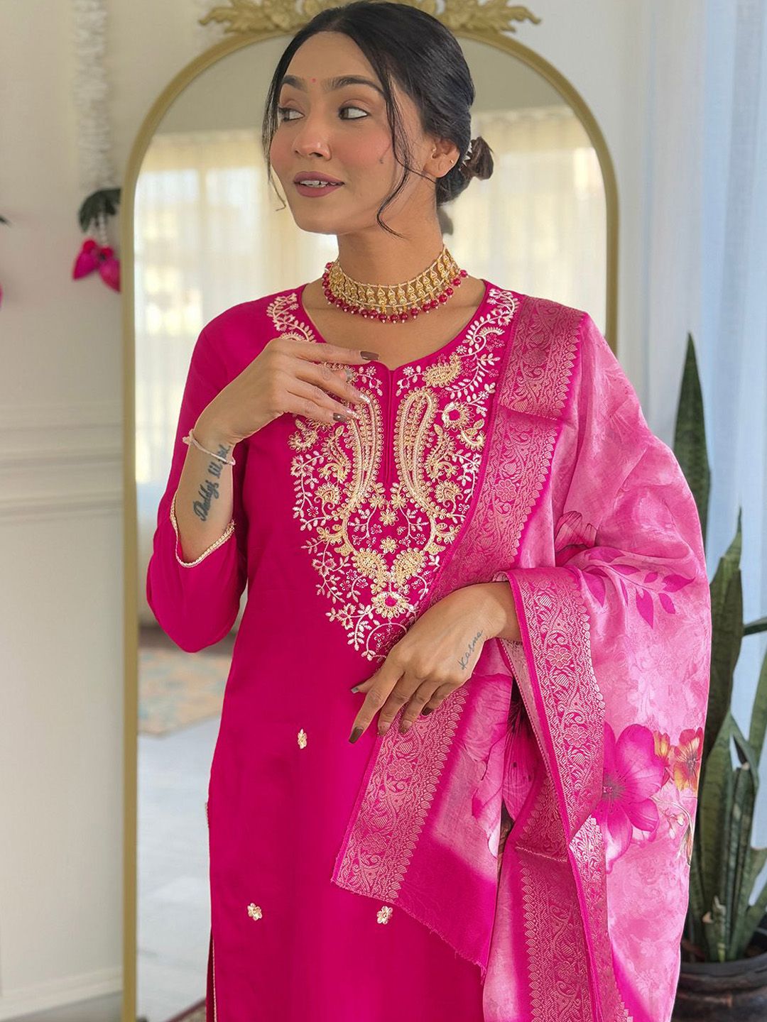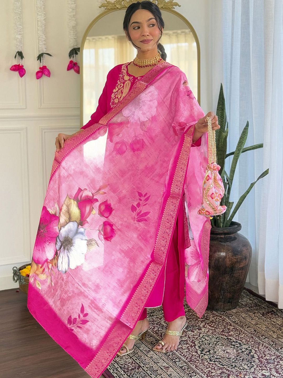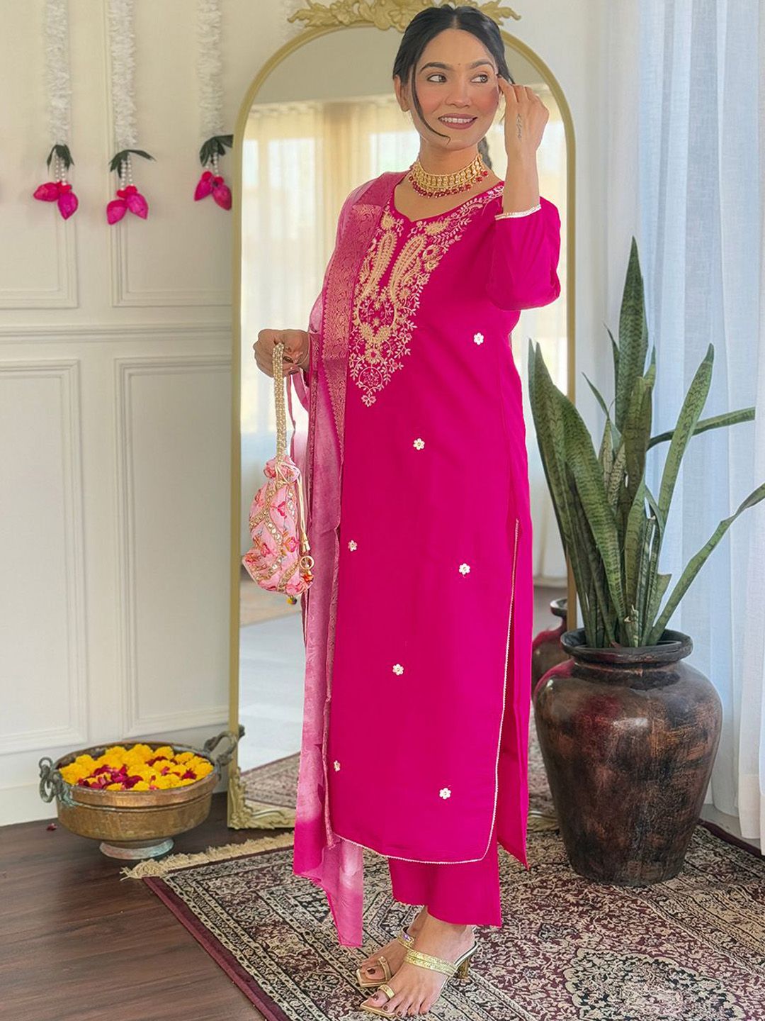 URMIR FASHION Floral Embroidered Round Neck Straight Kurta With Trousers & Dupatta