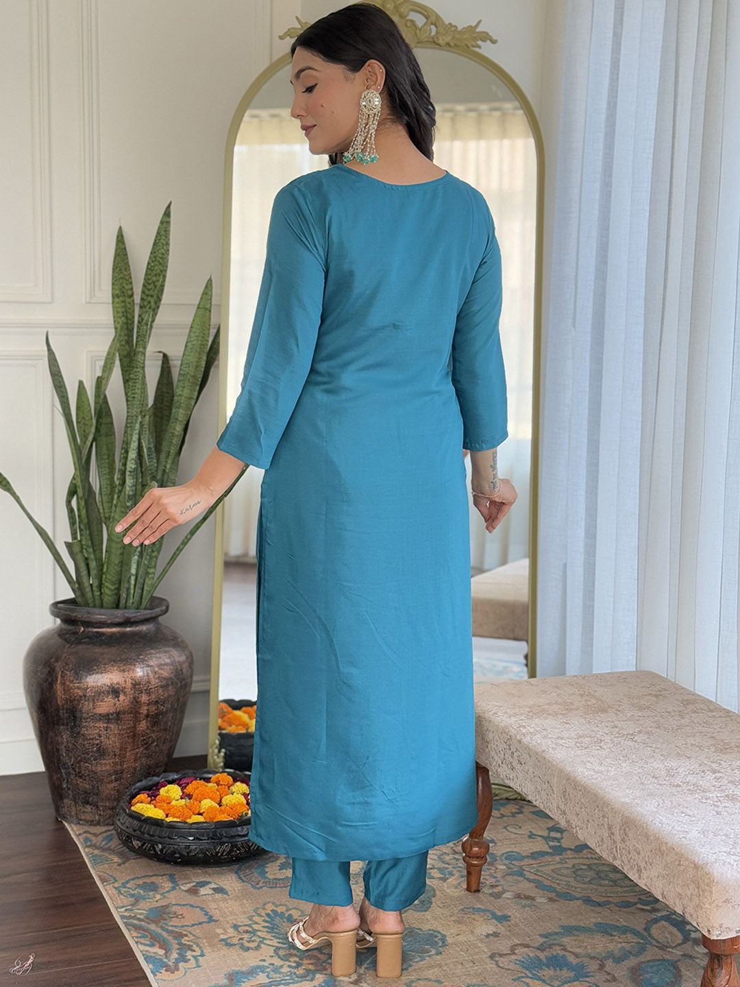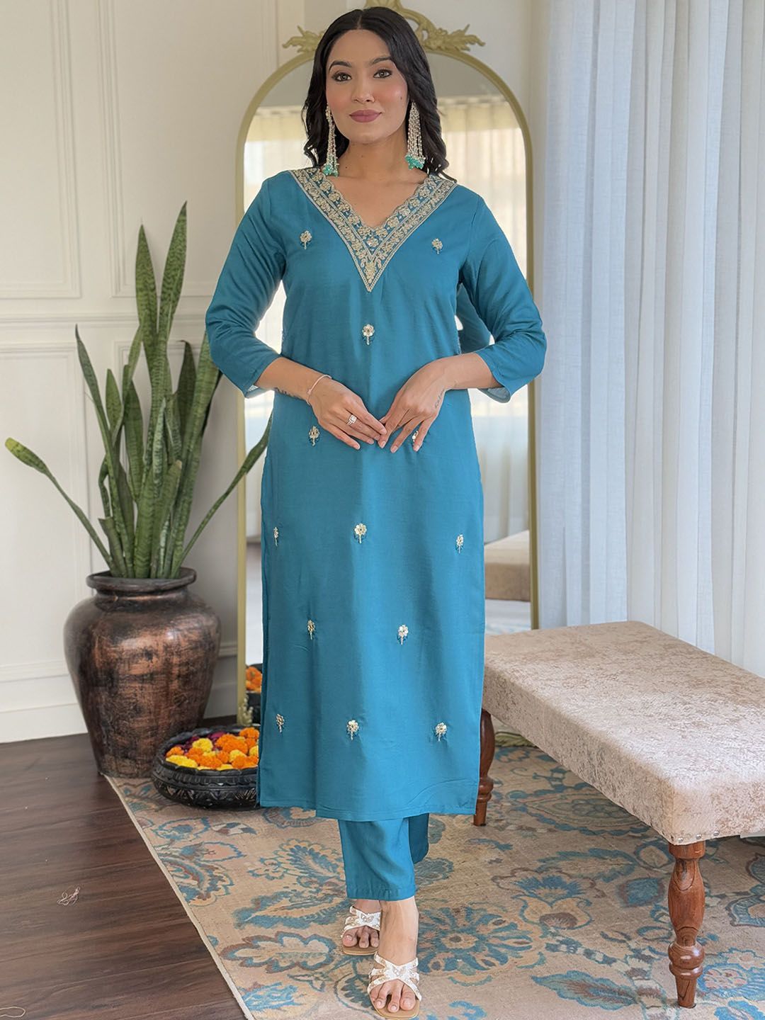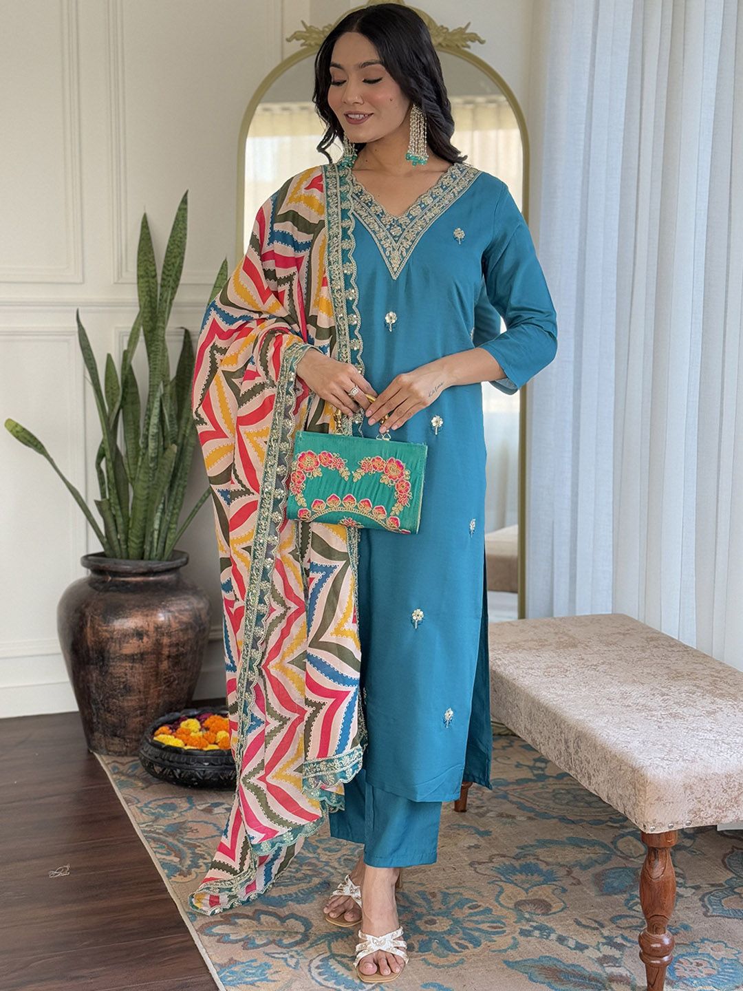 URMIR FASHION Floral Embroidered V-Neck Thread Work Straight Kurta With Trousers & Dupatta