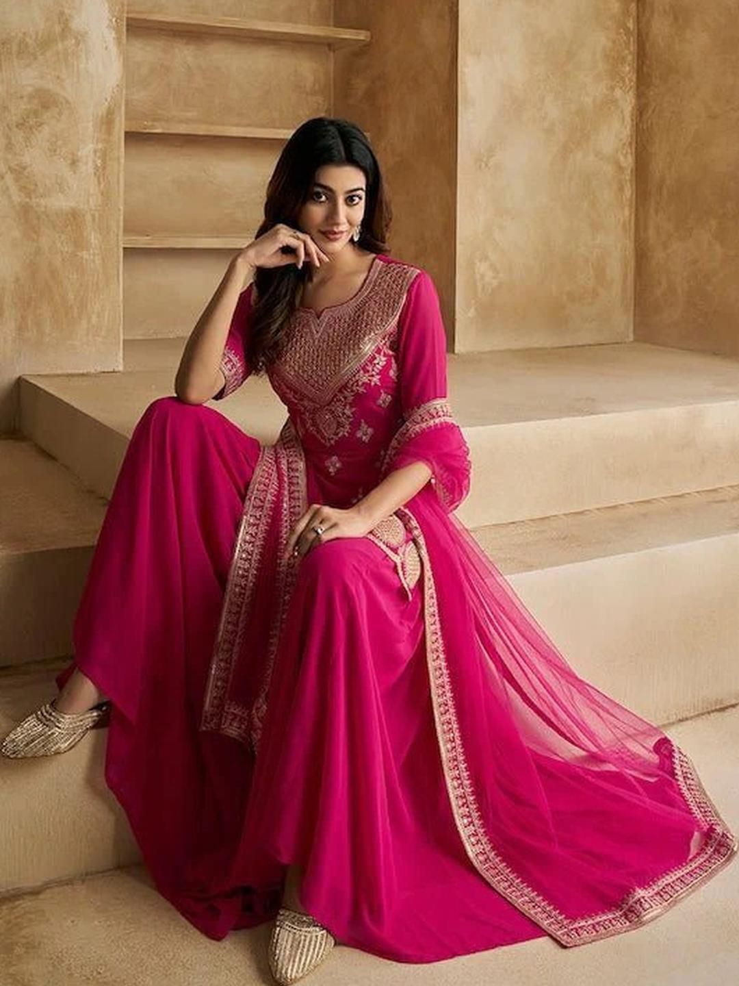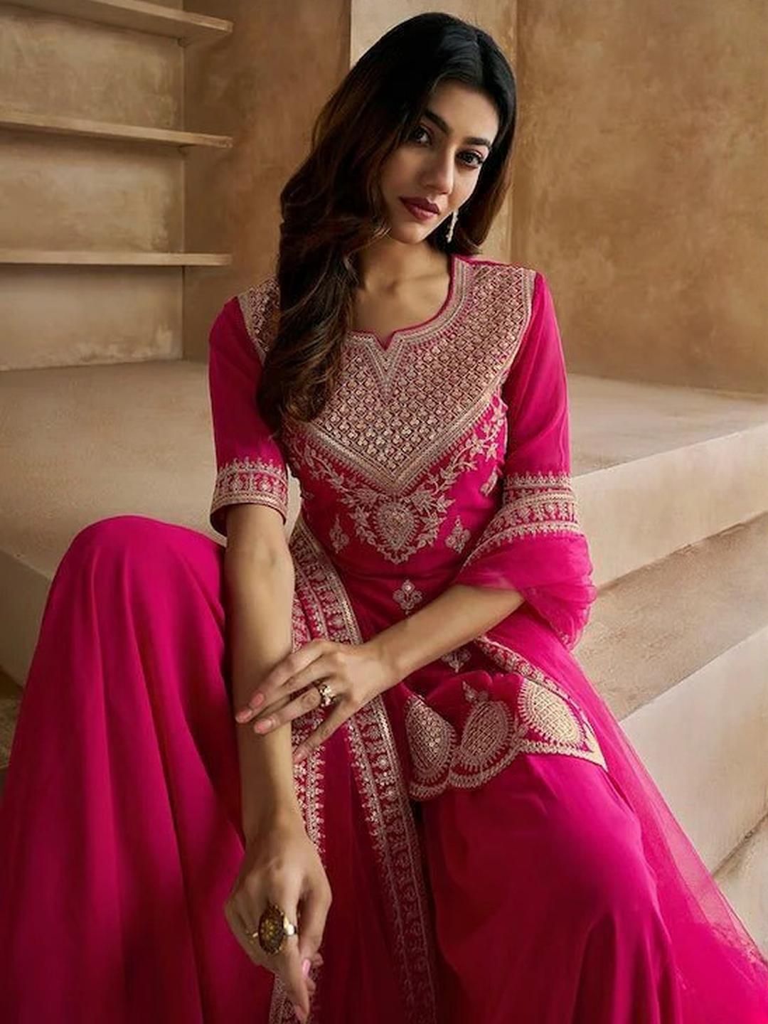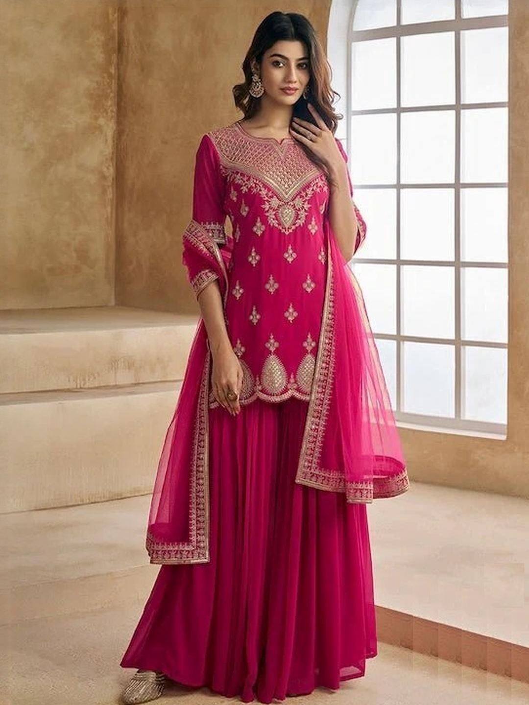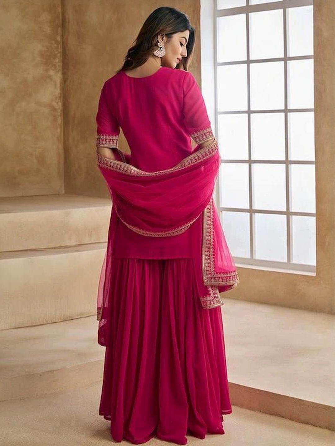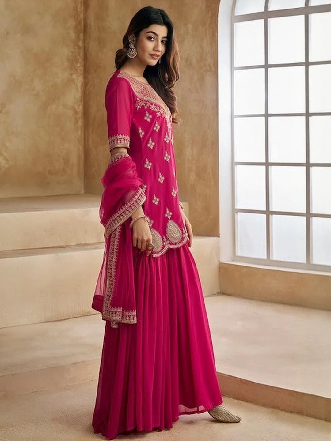 URMIR FASHION Women Pink Regular Kurta with Sharara & With Dupatta