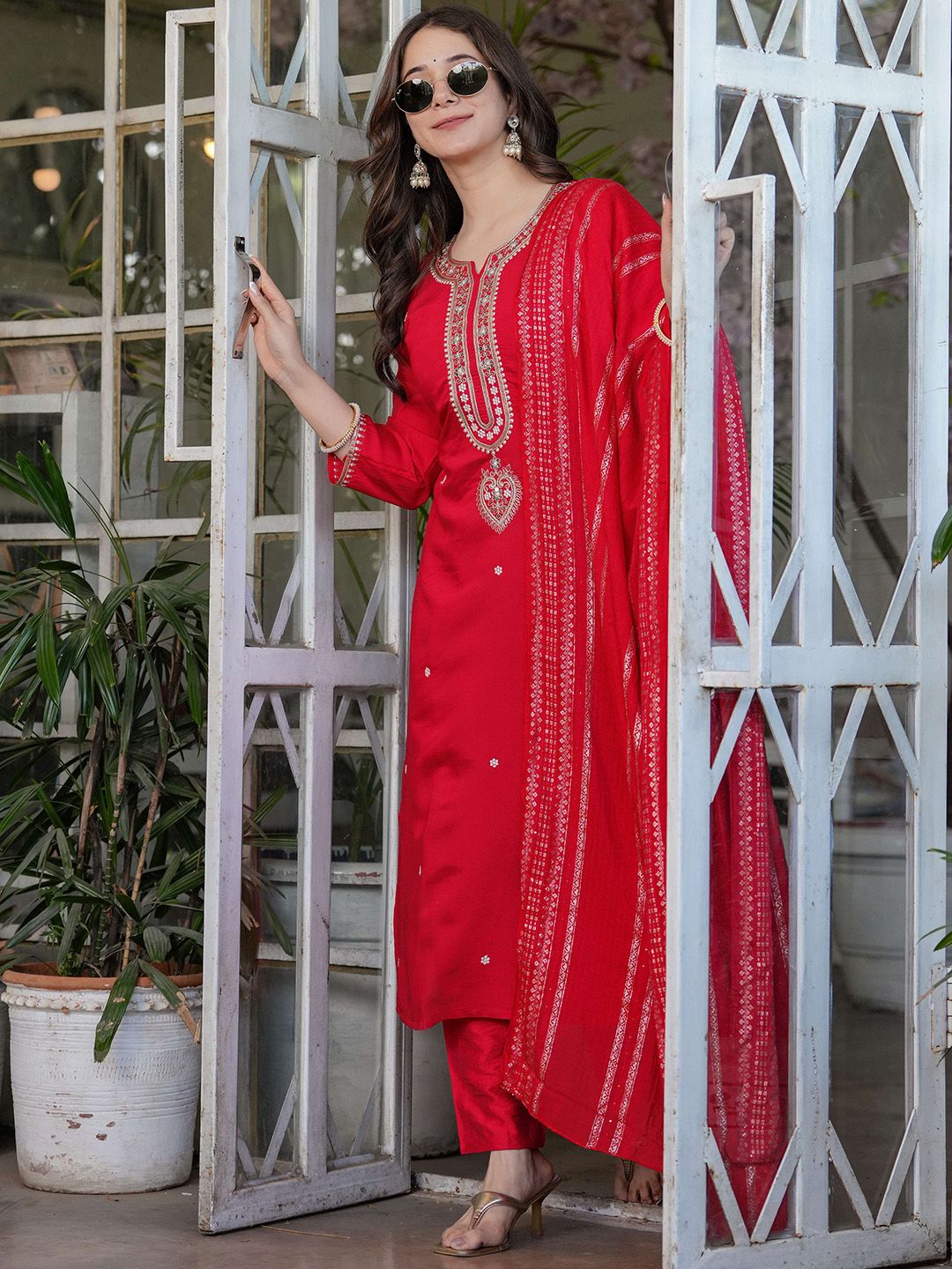 VAAZI CREATOR Embroidered Chanderi Silk Notch Neck Straight Kurta With Trousers & Dupatta