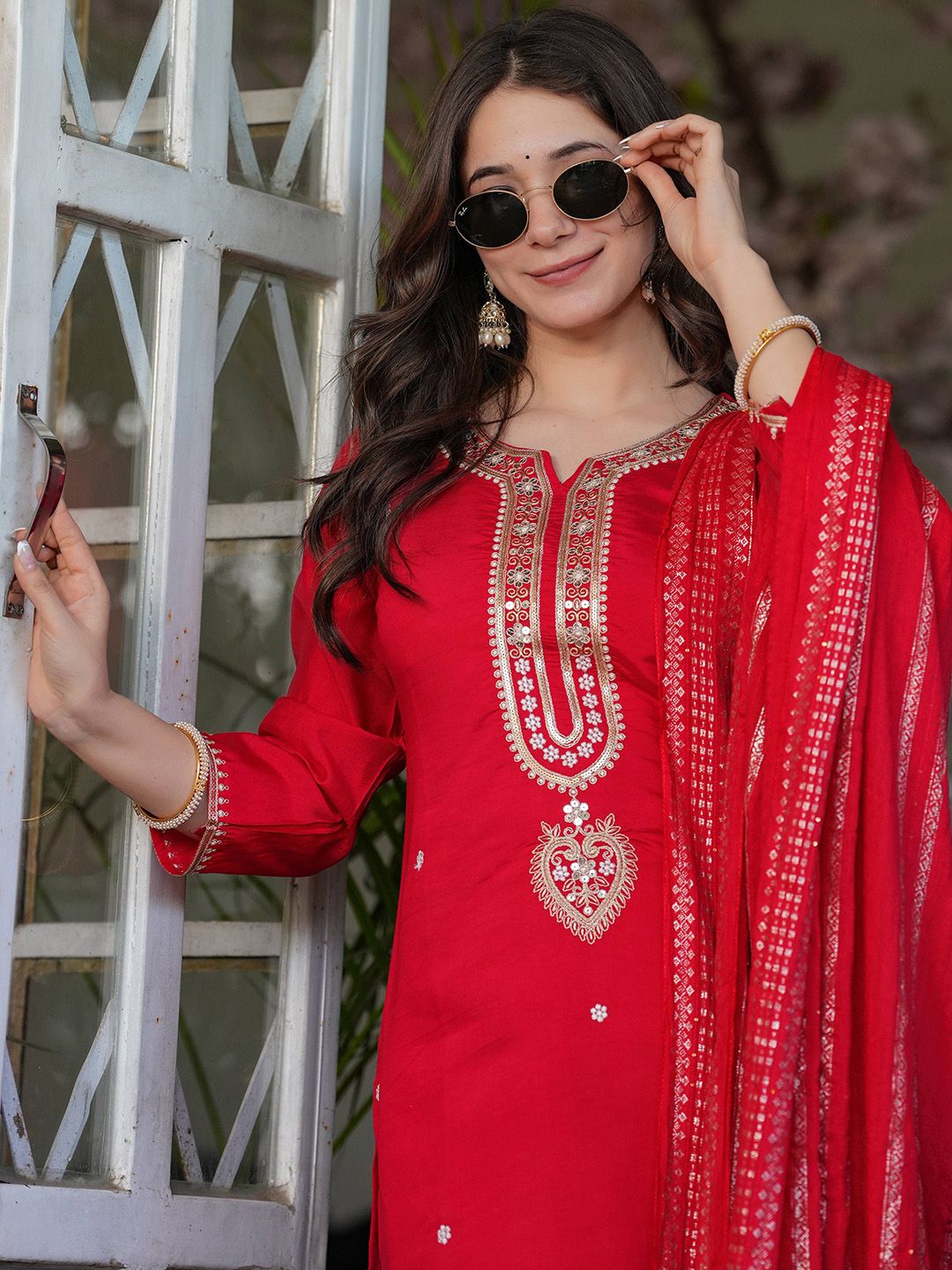 Buy this stylish VAAZI CREATOR Embroidered Chanderi Silk Notch Neck Straight Kurta With Trousers & Dupatta at Marincart Nepal. This product offers great quality and value. Perfect for those looking for the latest trends in fashion. Get yours now at unbeatable prices.