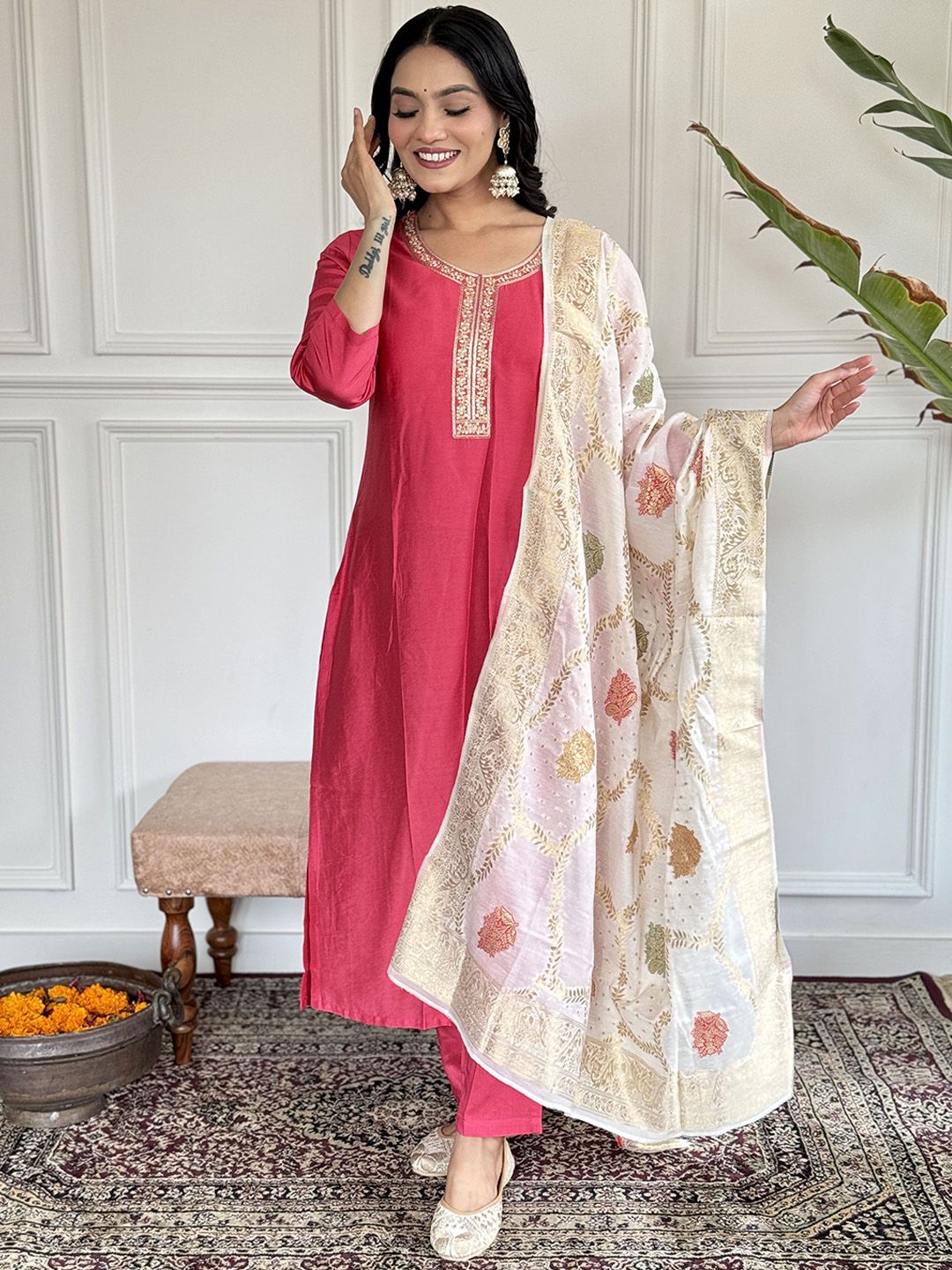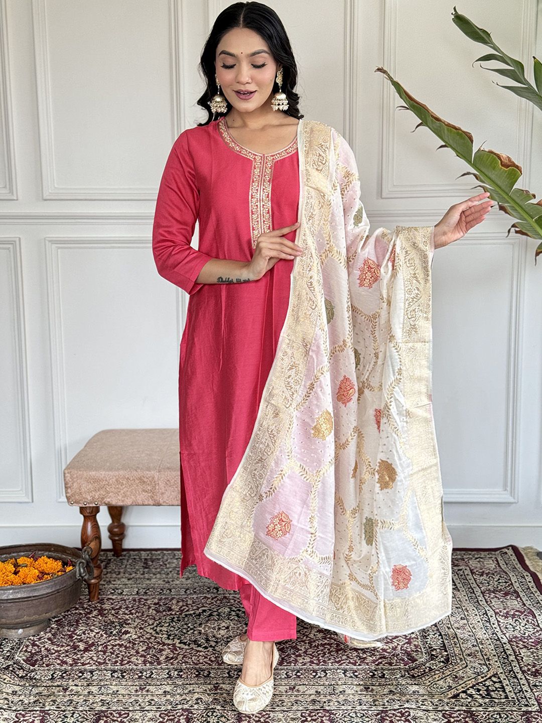 VAAZI CREATOR Women Woven Design Embroidered Kurta with Trousers & Dupatta