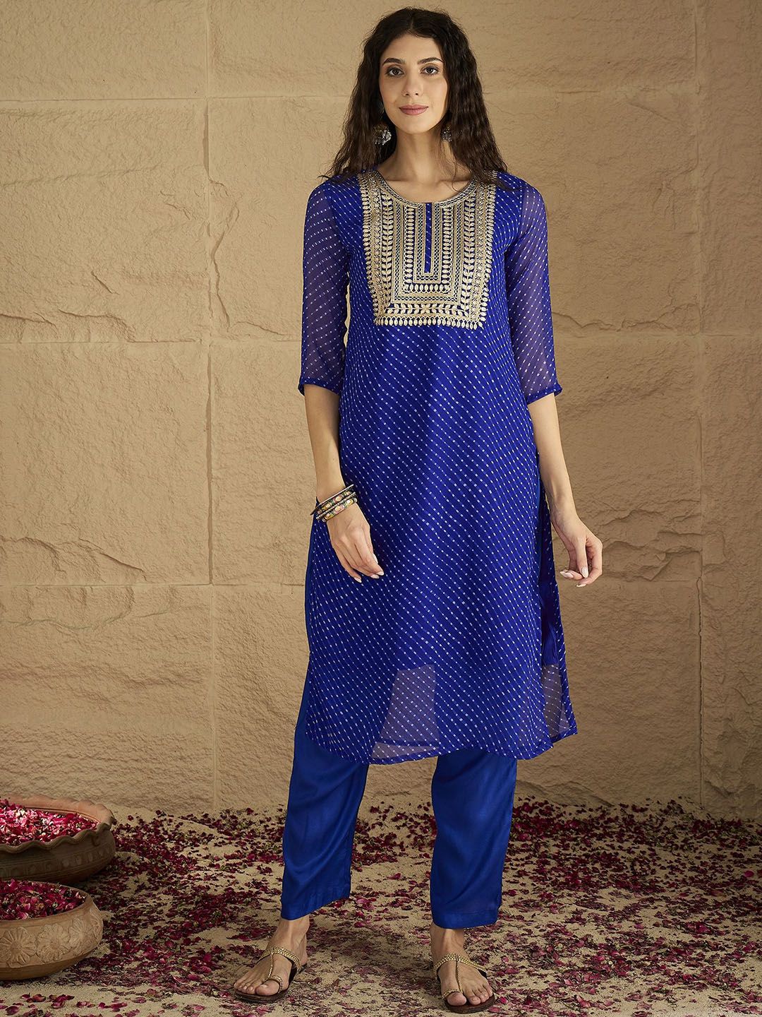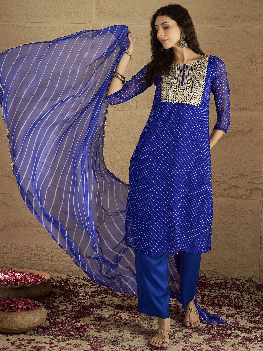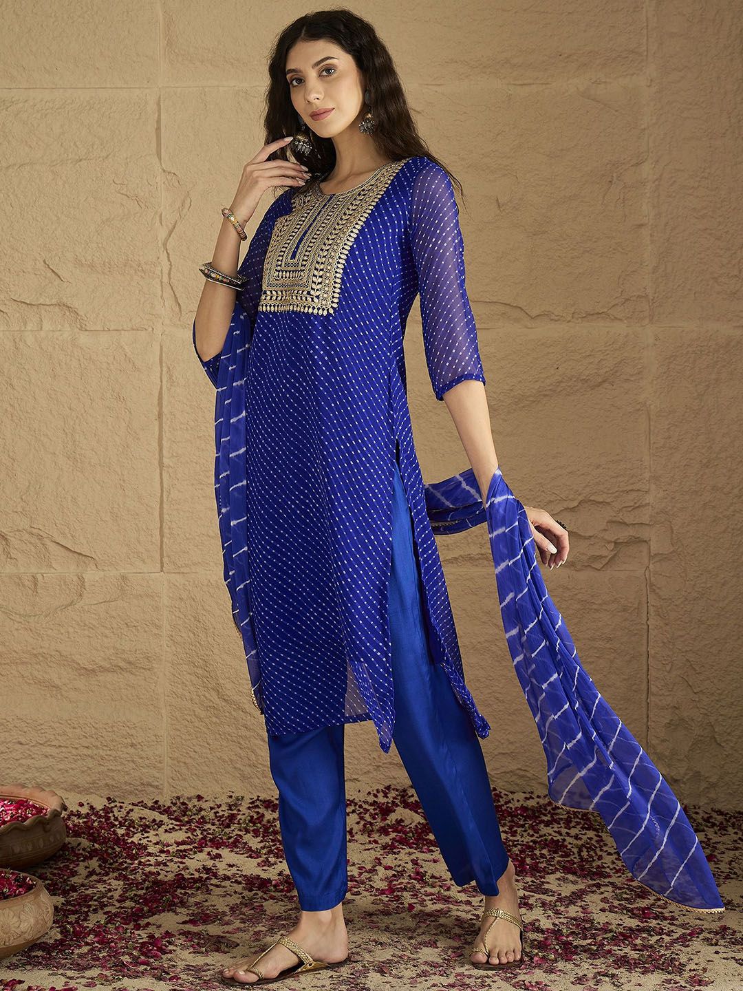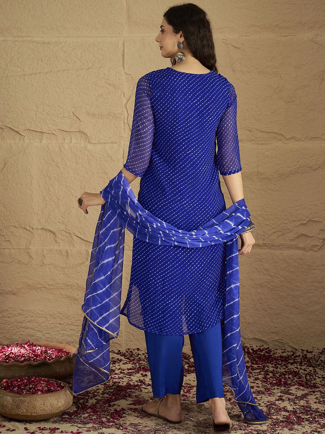 Varanga Bandhani Printed Silk Georgette Round Neck Straight Kurta With Trousers & Dupatta