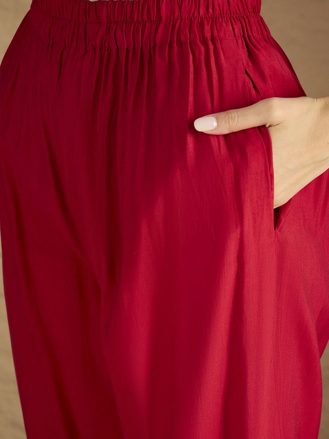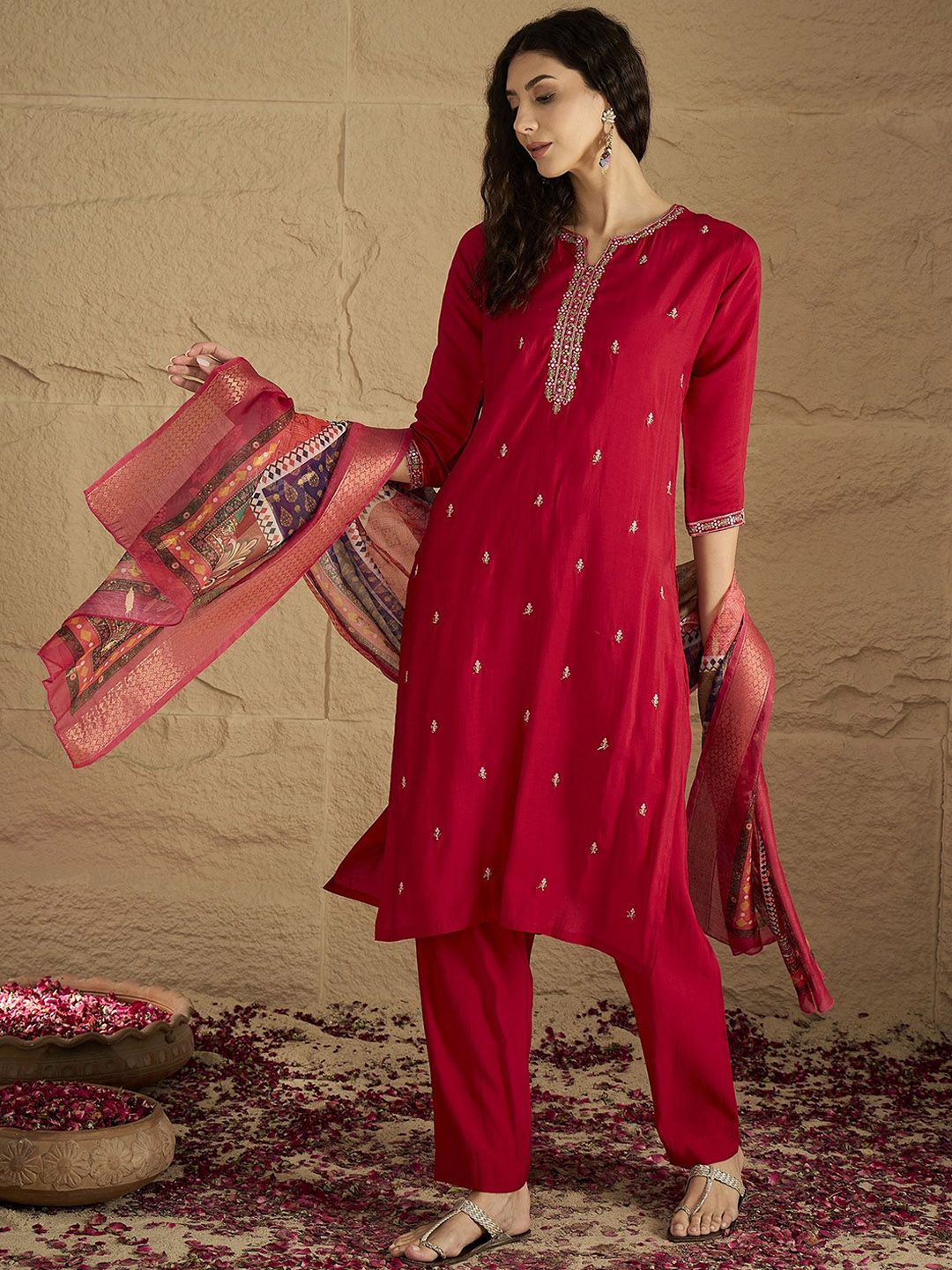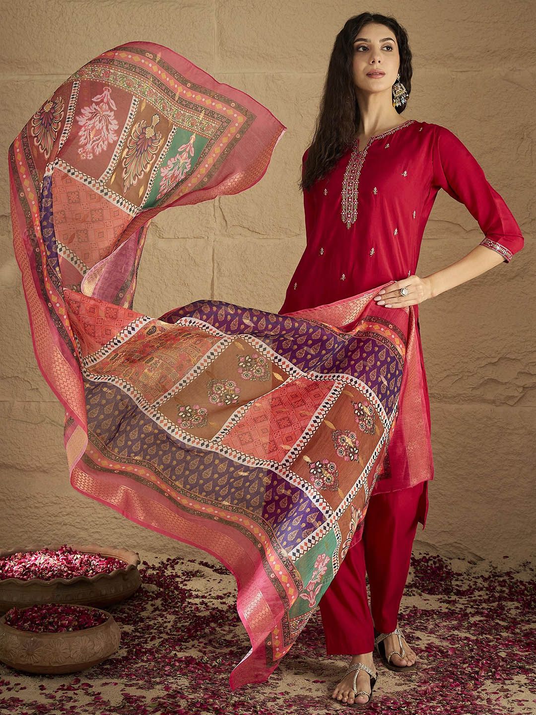 Varanga Floral Embroidered Mirror Work Kurta With Trousers & Dupatta