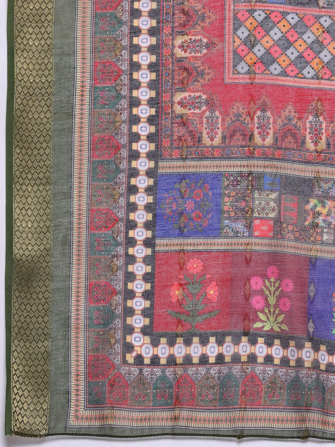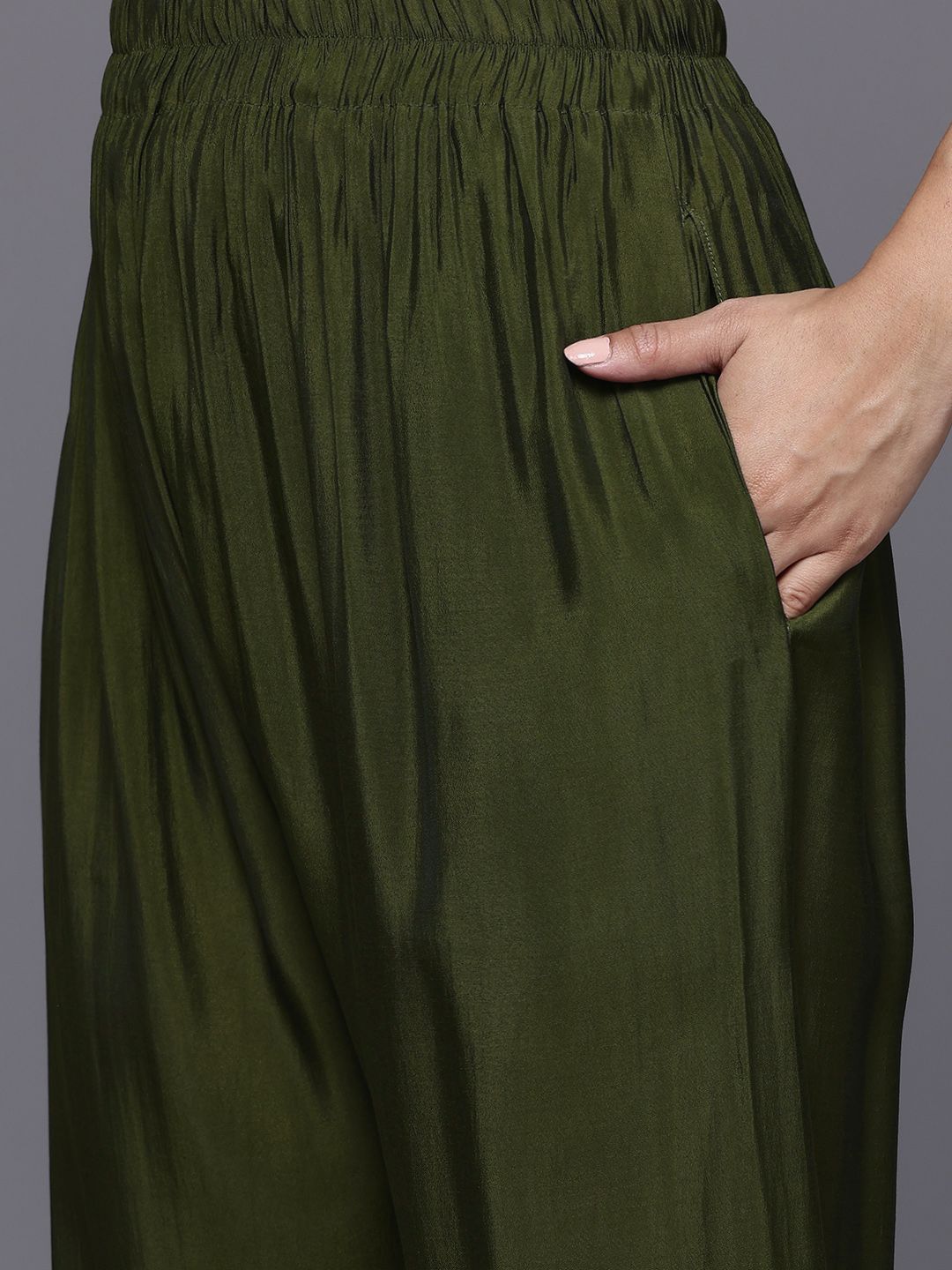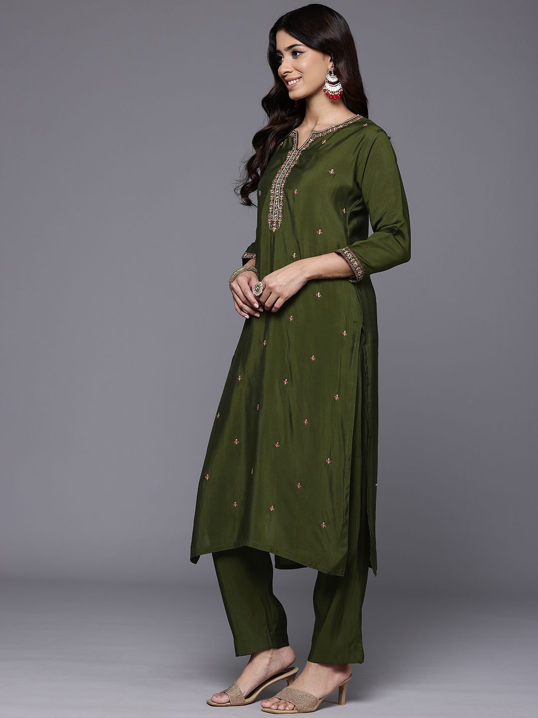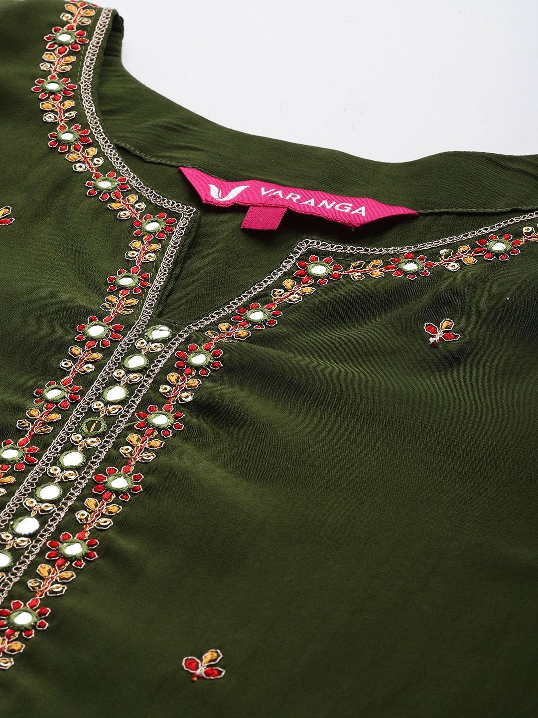 Varanga Floral Embroidered Notch Neck Mirror Work Straight Kurta With Trousers & Dupatta