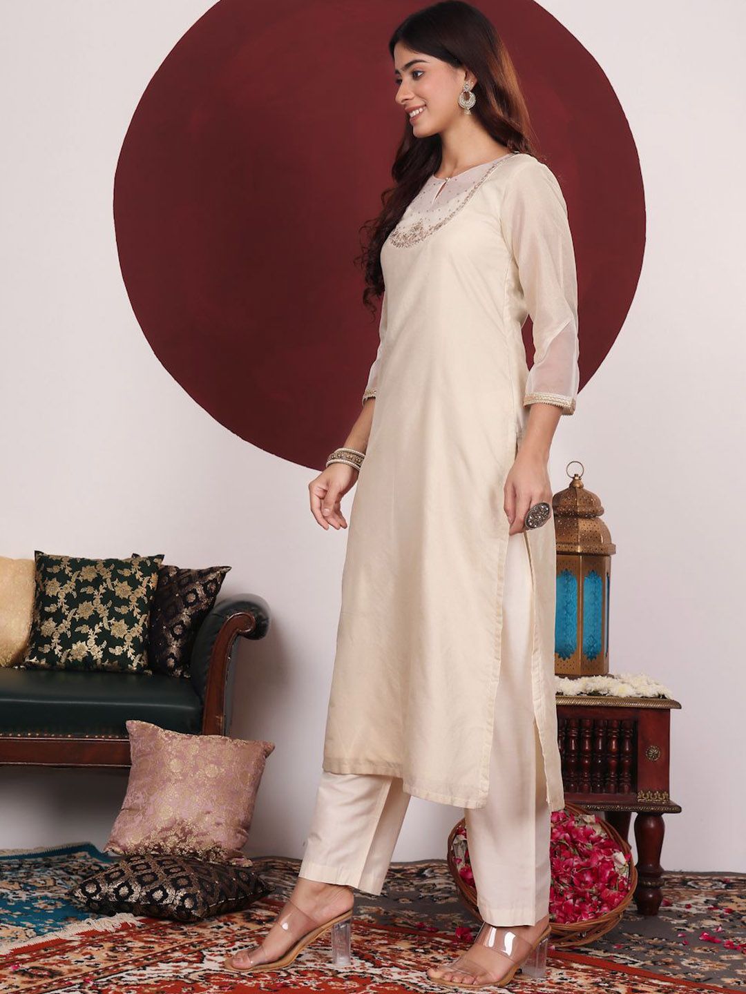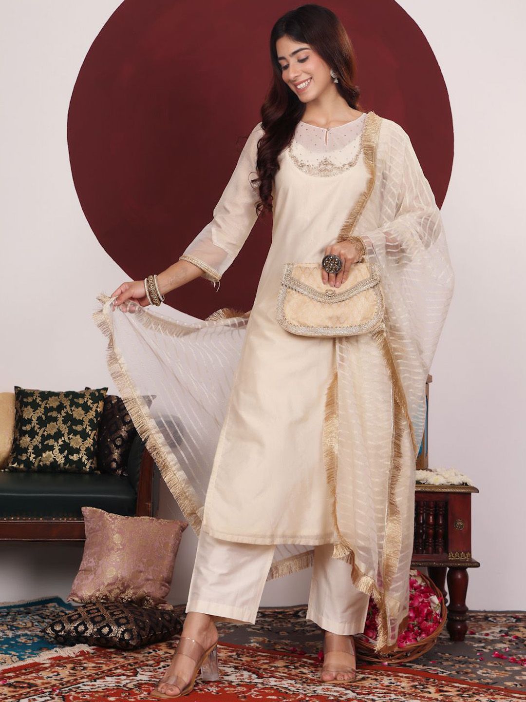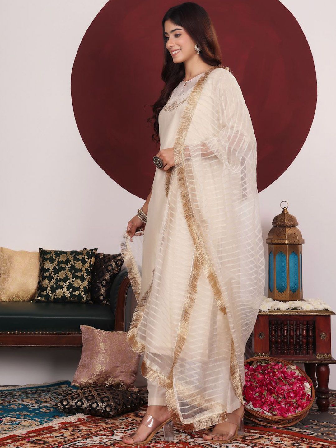 Varanga Floral Embroidered Round Neck Straight Kurta With Trousers & Dupatta