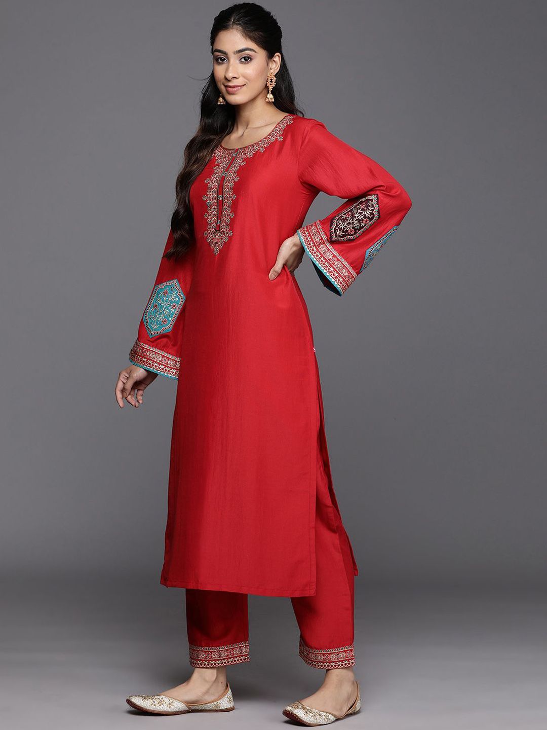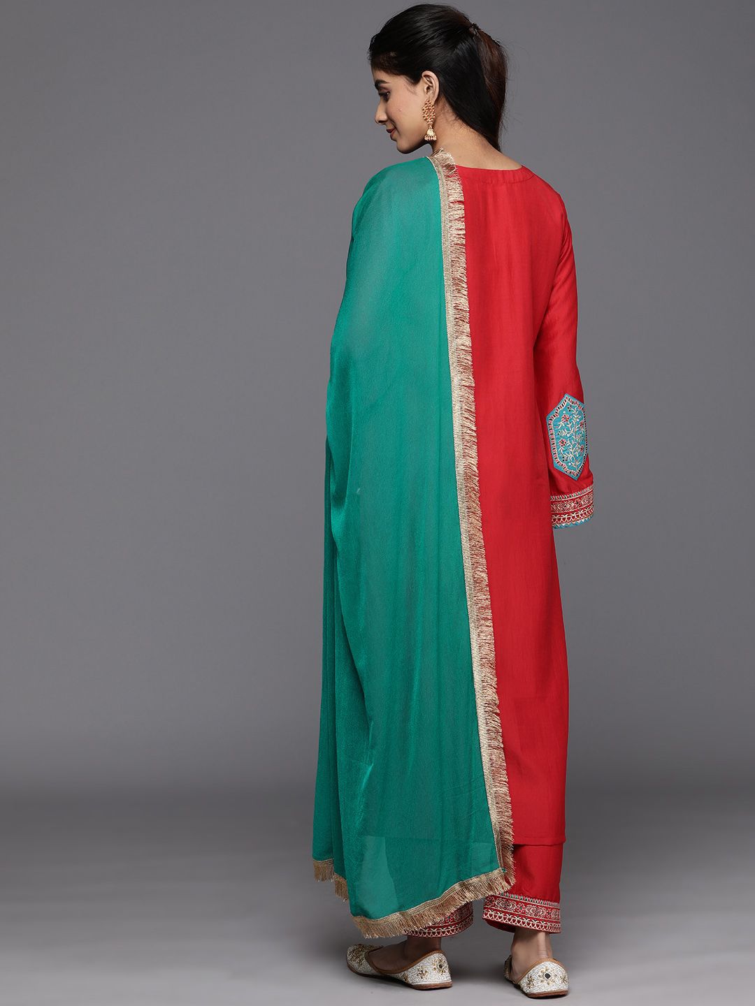 Varanga Floral Yoke Design Sequinned Kurta With Trousers & Dupatta