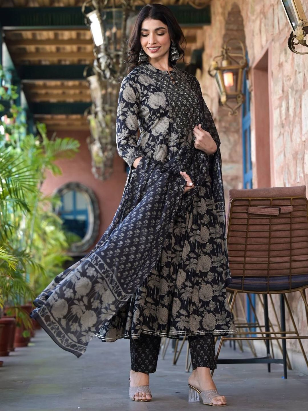 Varanga Women Floral Printed Panelled Mirror Work Kurta with Trousers & With Dupatta