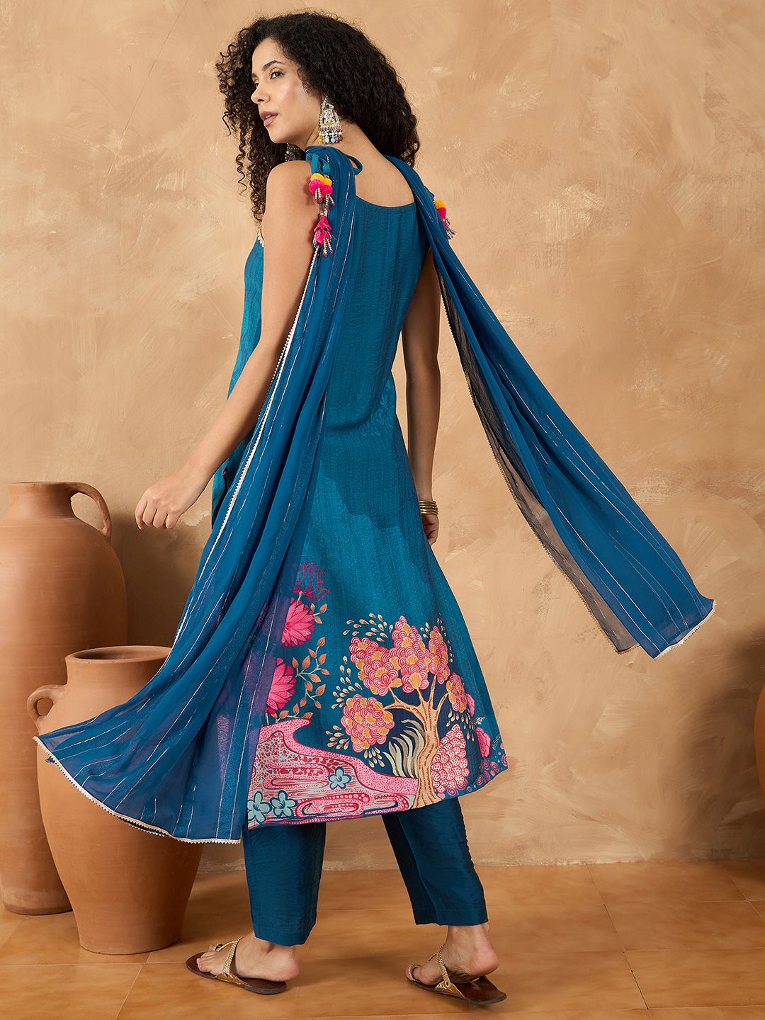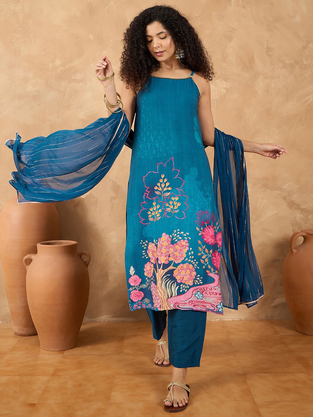 Varanga Women Spaghetti Tie up Strap Straight Floral Kurta with Trousers and Dupatta