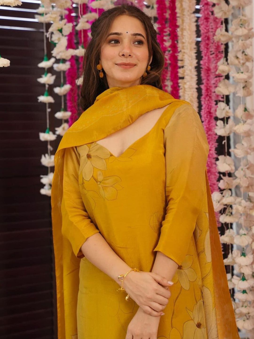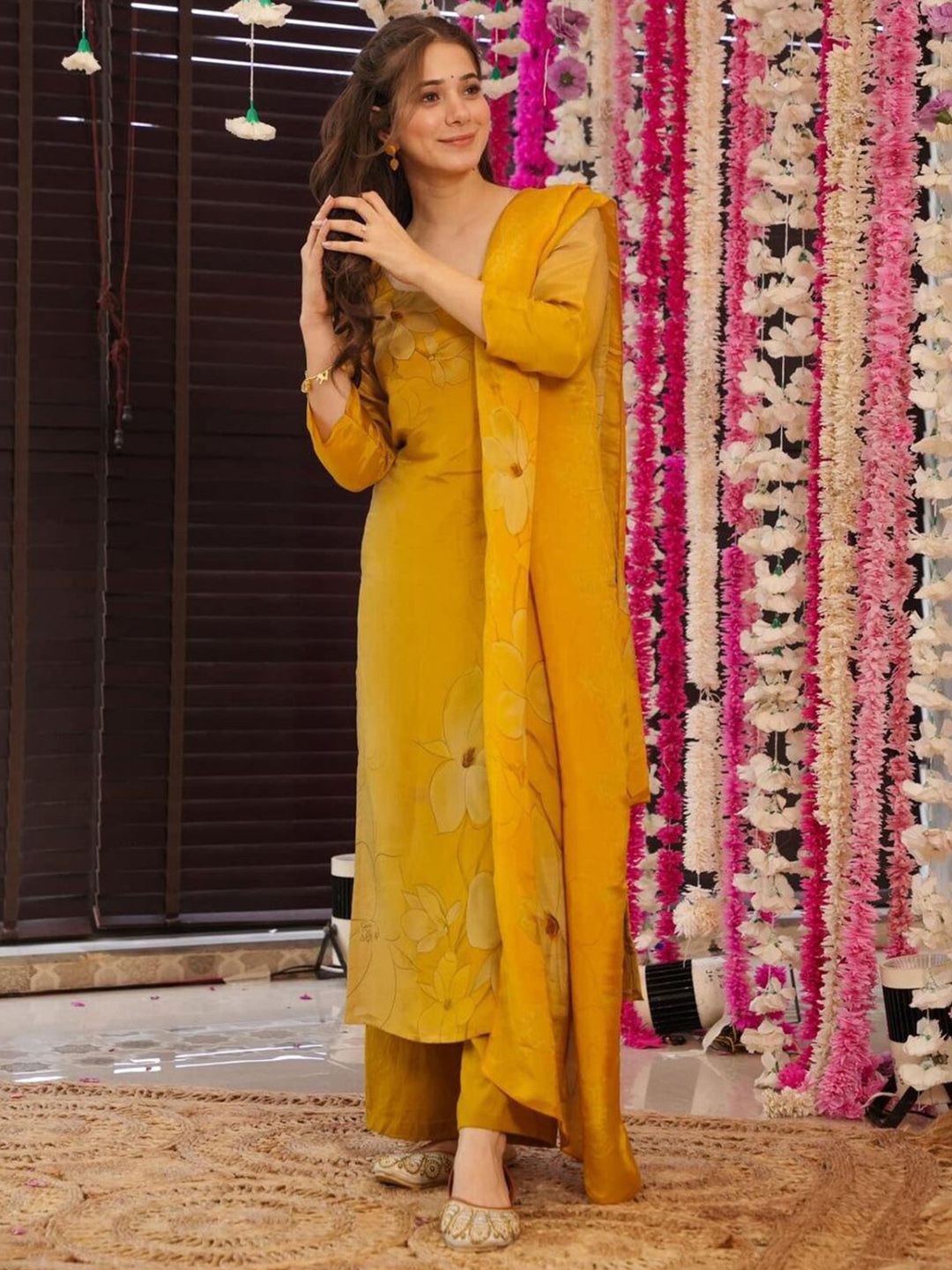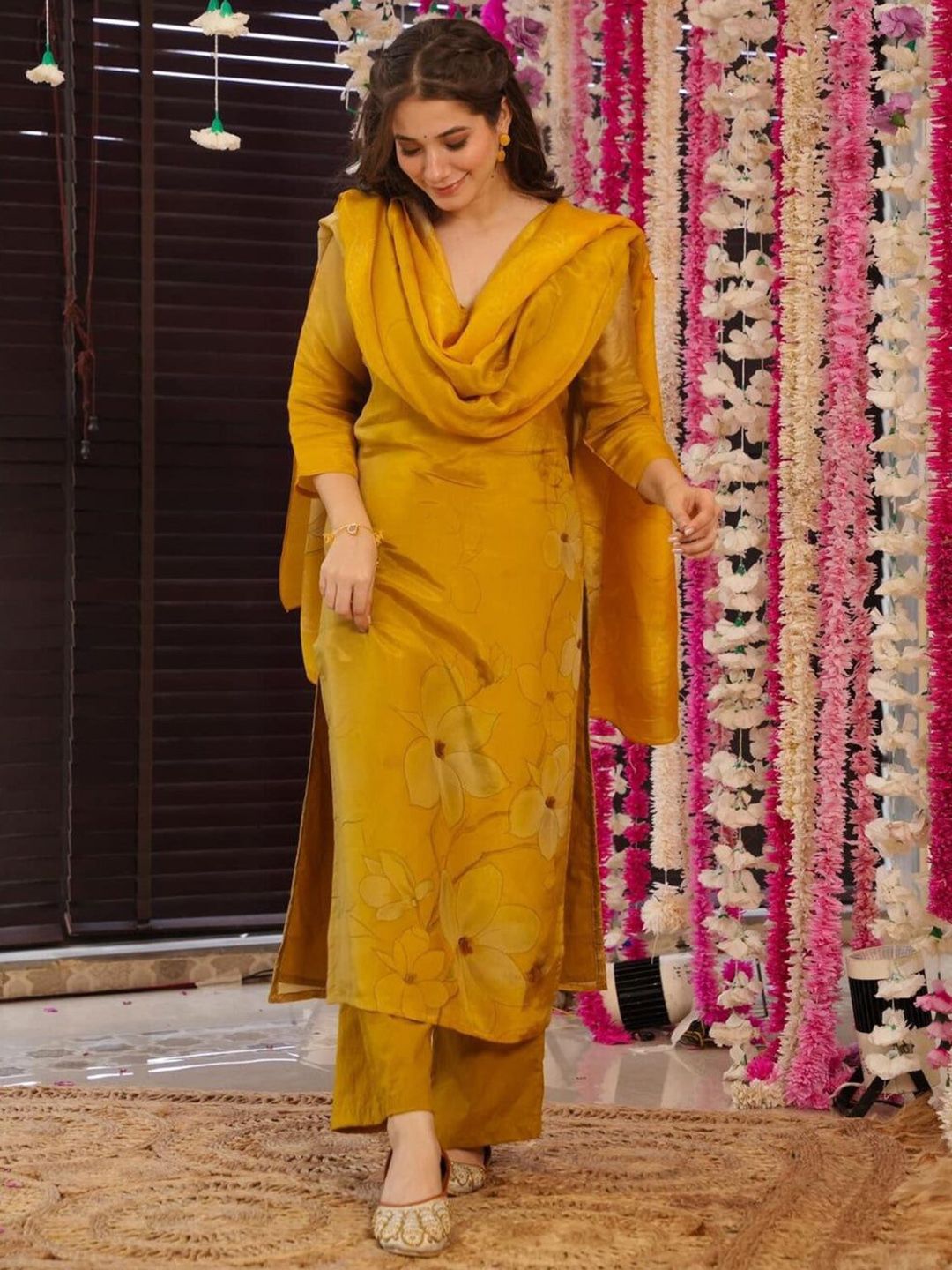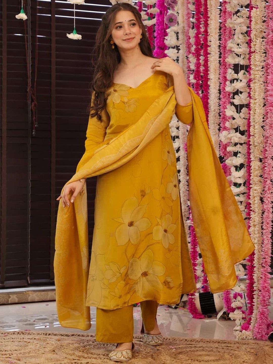 VASTRAHUT Floral Printed V-Neck Straight Kurta With Trousers And Dupatta