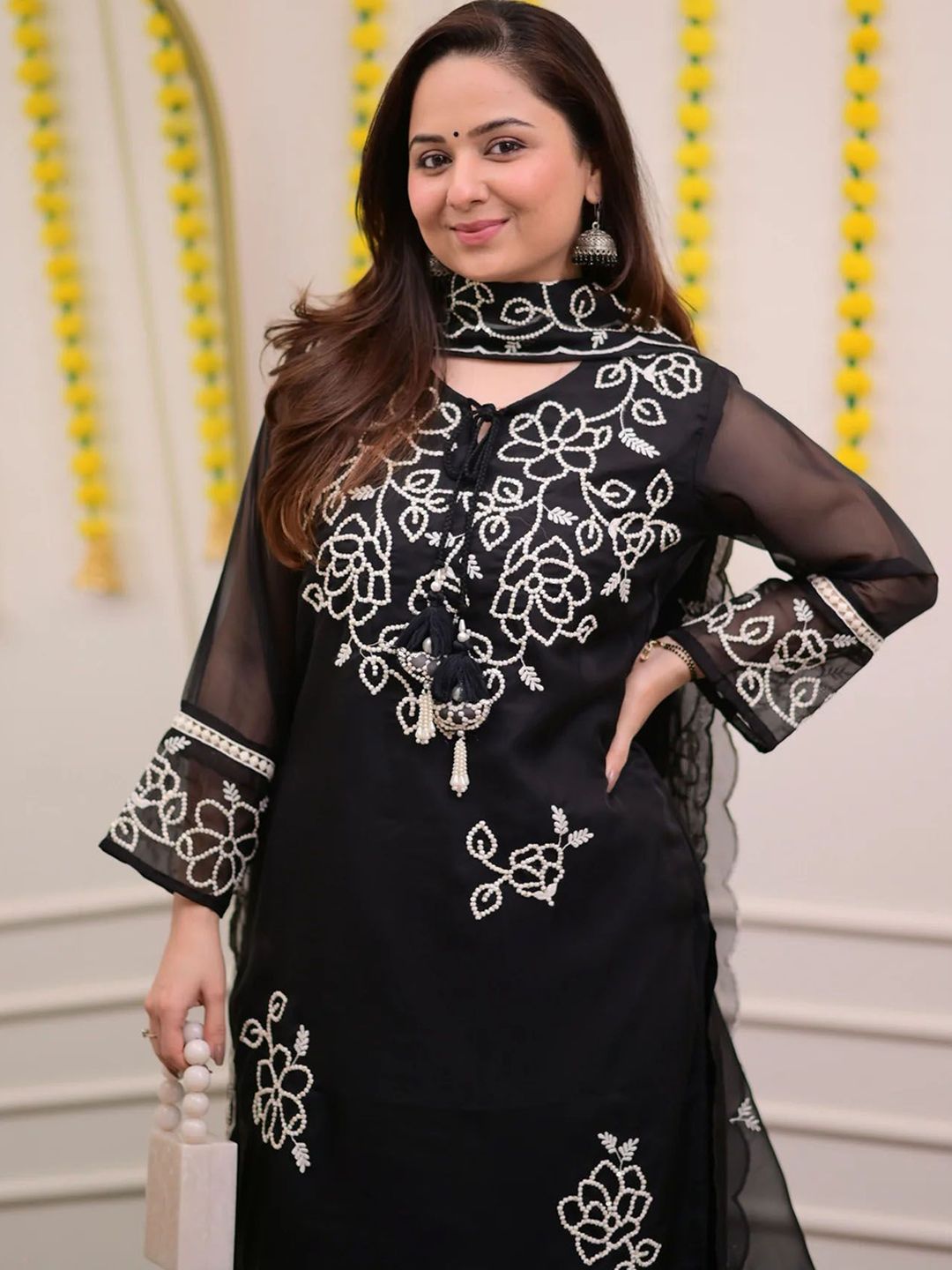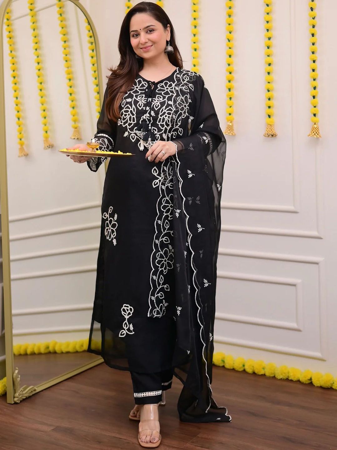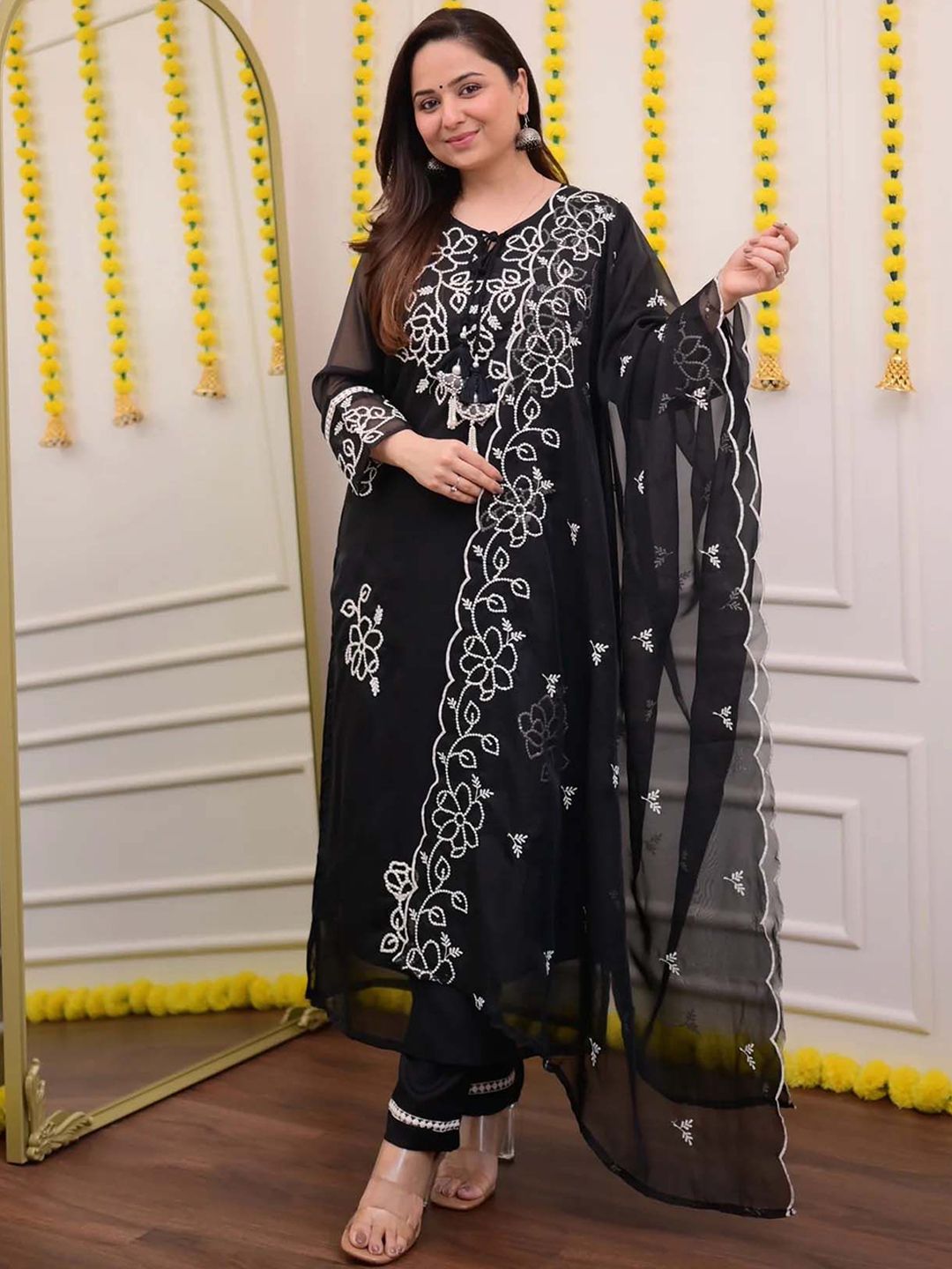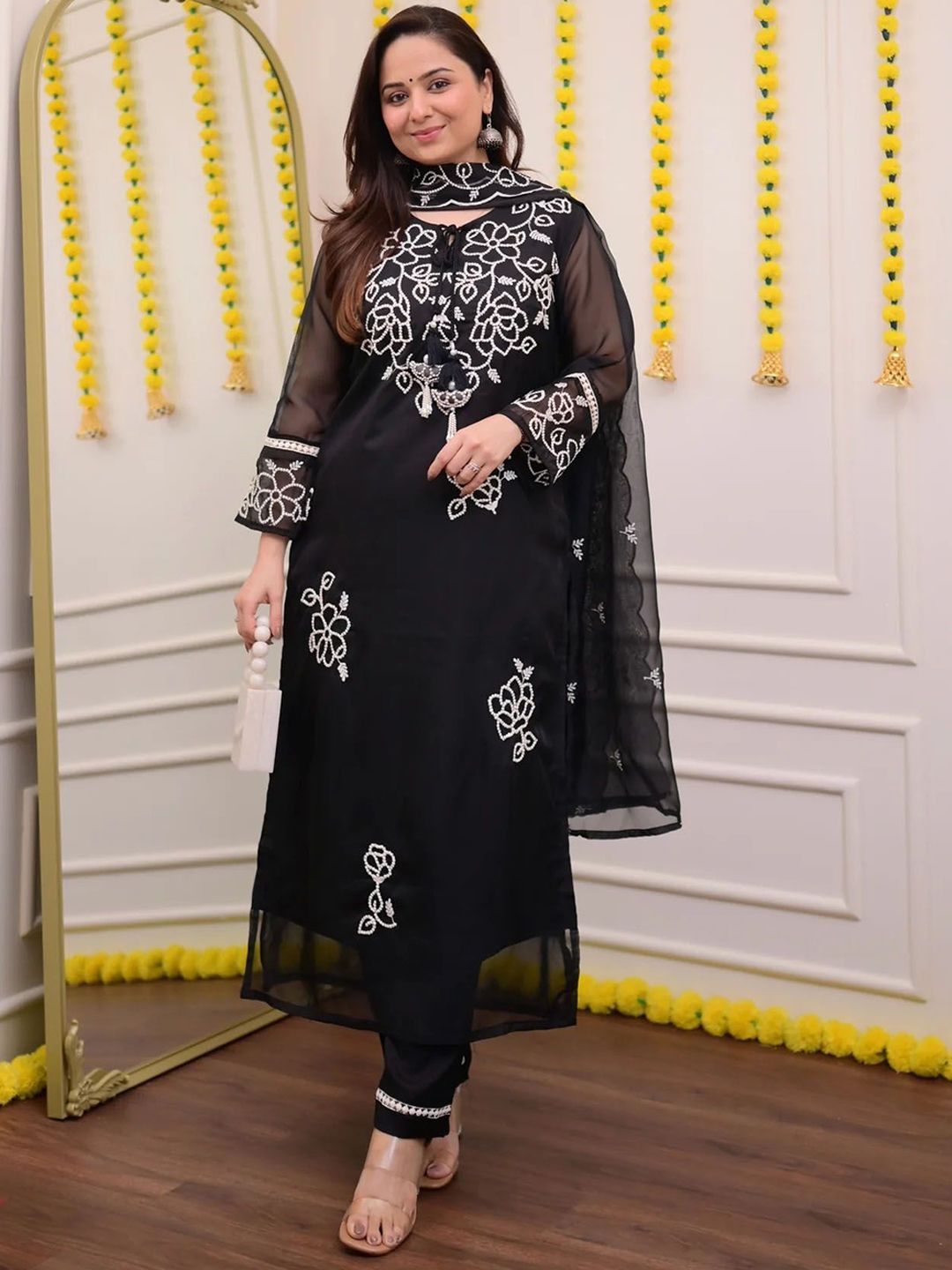 Vastukala Floral Embroidered Georgette Thread Work Straight Kurta With Trousers & Dupatta
