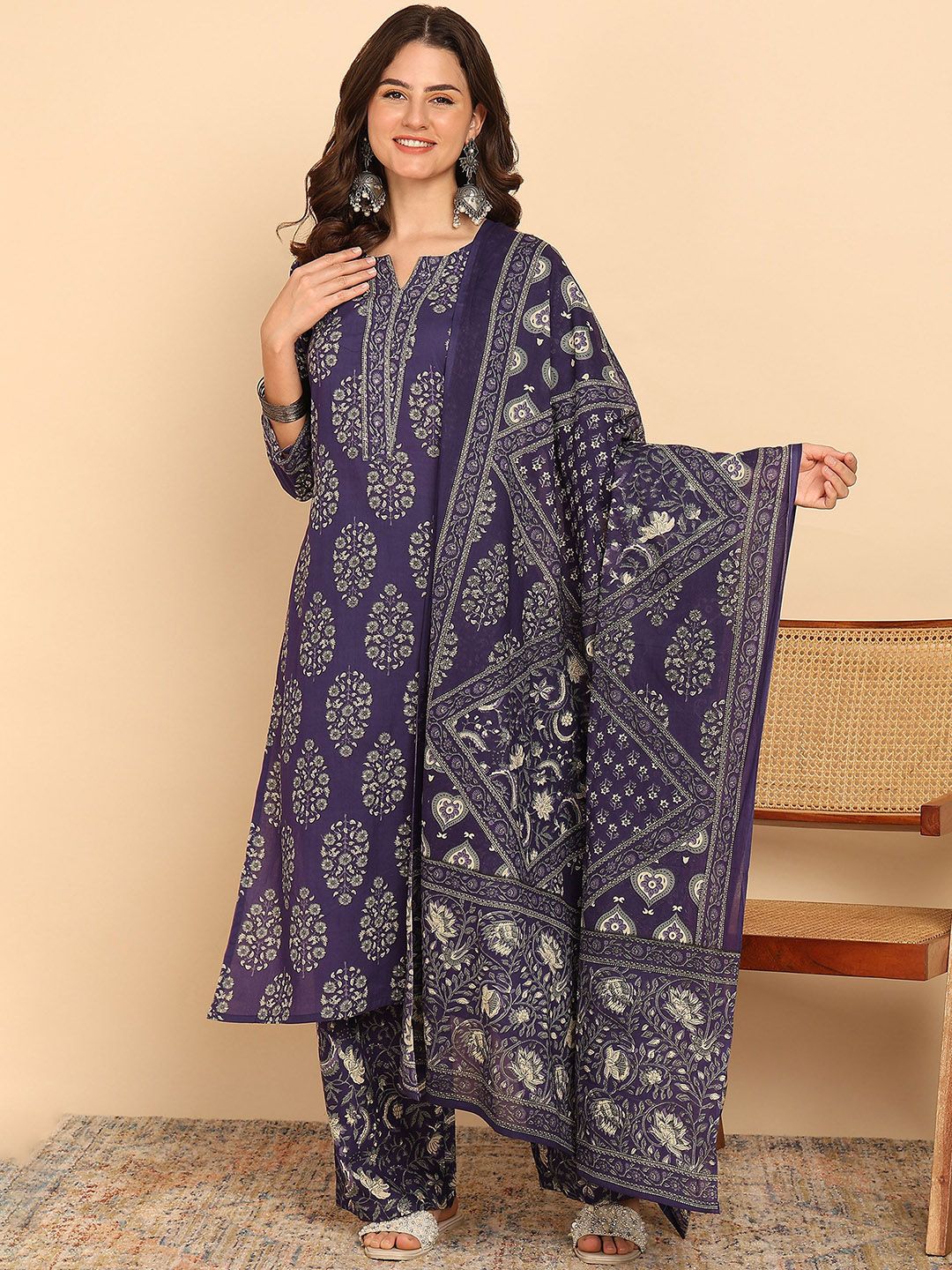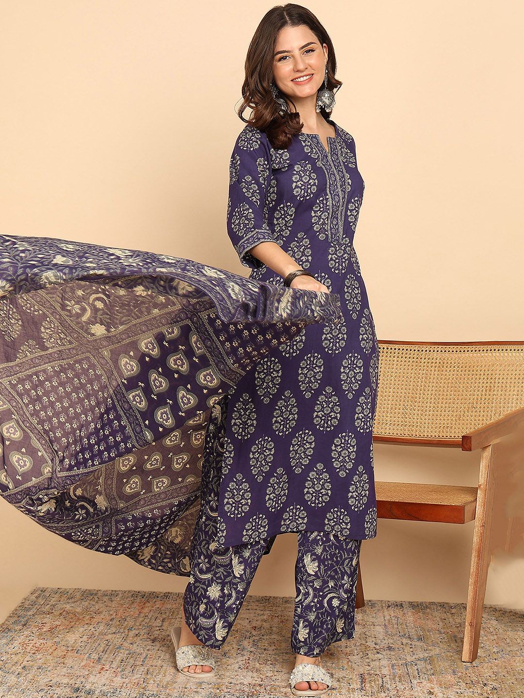 Vbuyz Women Floral Printed Cotton Kurta with Palazzo & Dupatta