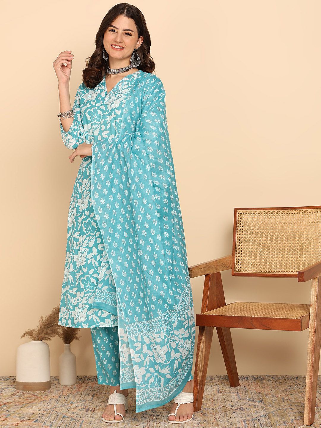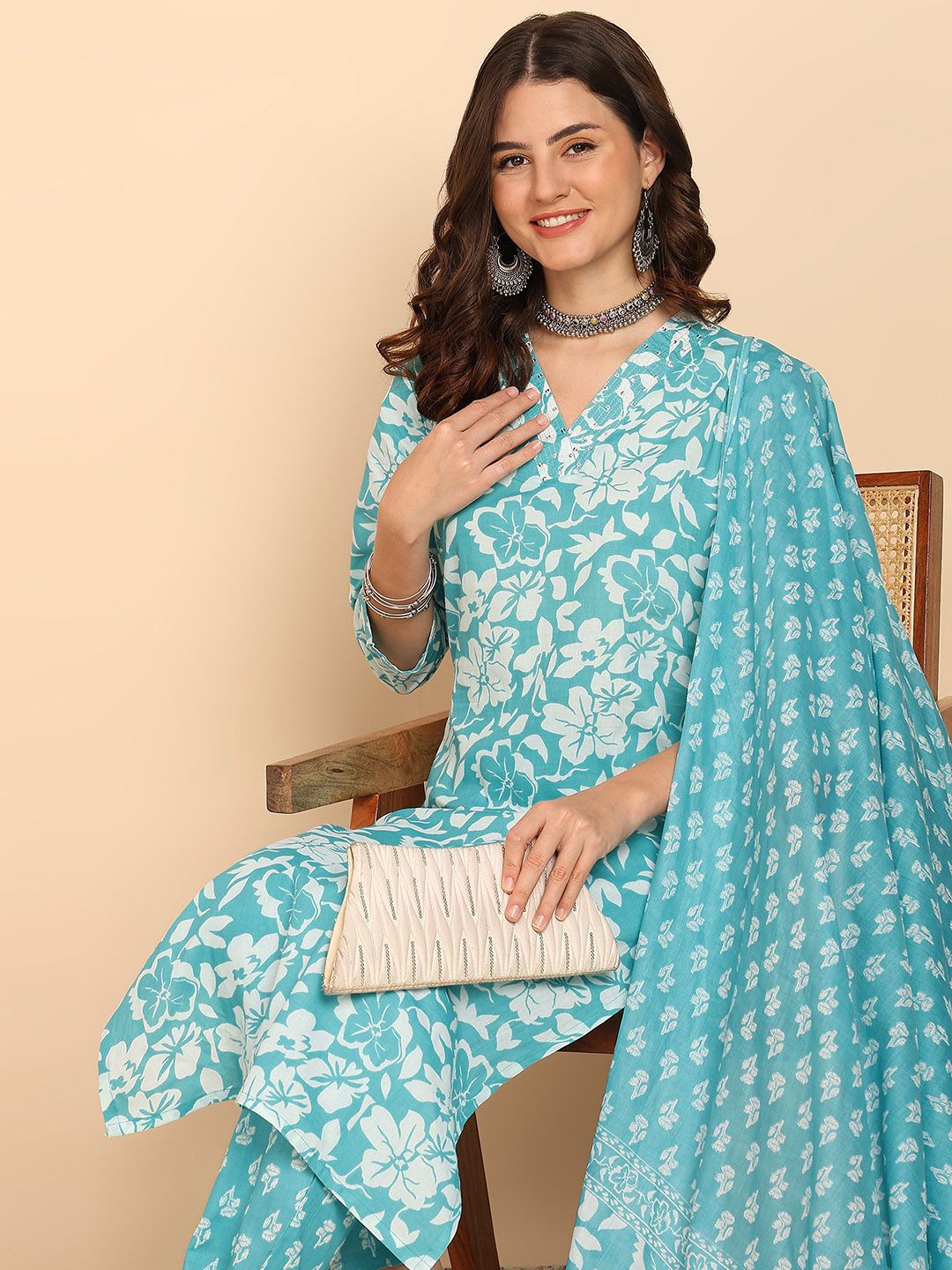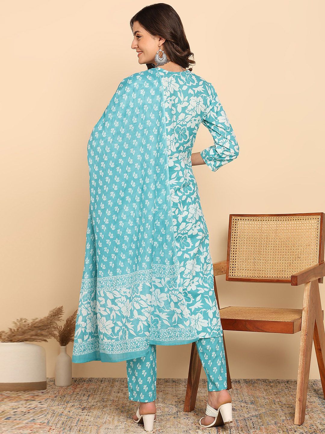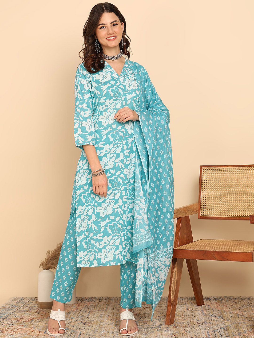 Vbuyz Women Floral Printed Cotton Kurta with Trousers & Dupatta
