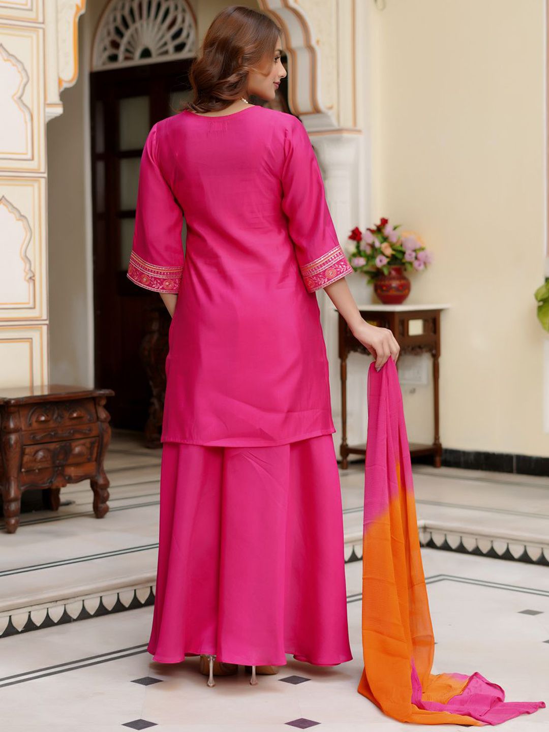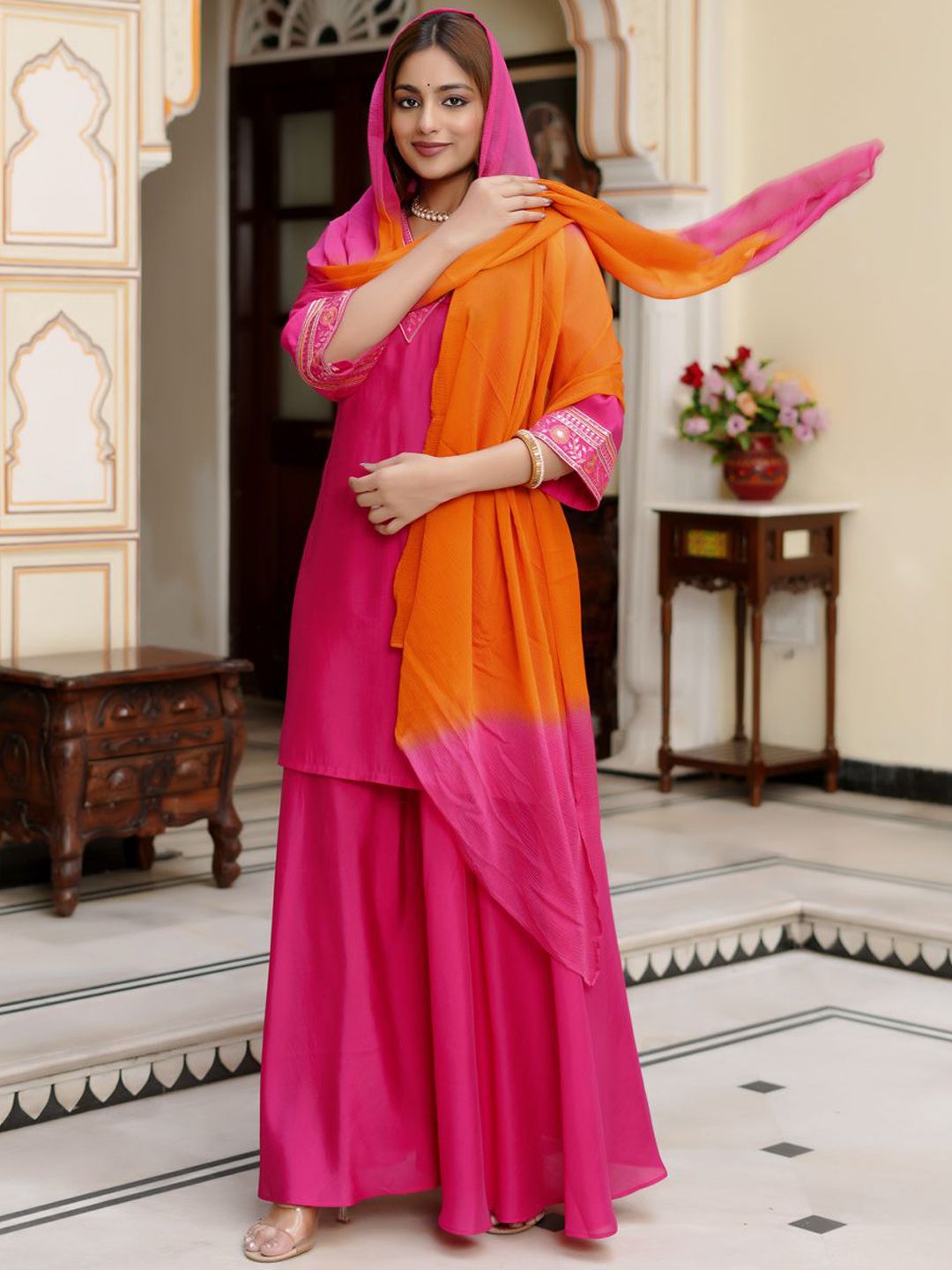 VIBE VISION Women V-Neck Straight Regular Kurta with Trousers & With Dupatta
