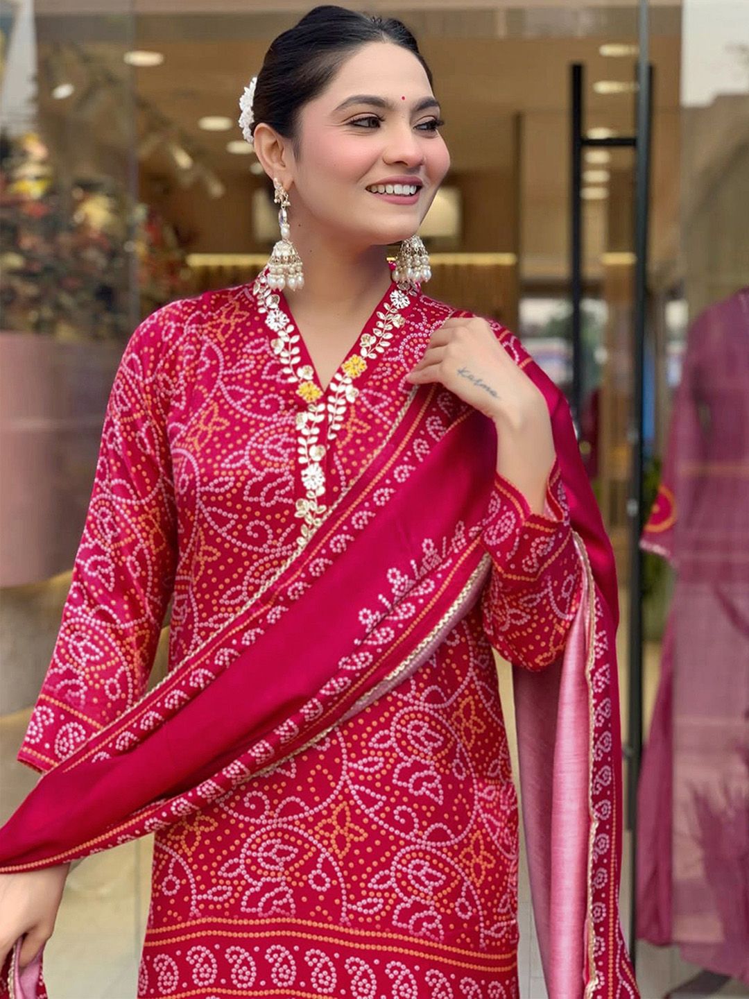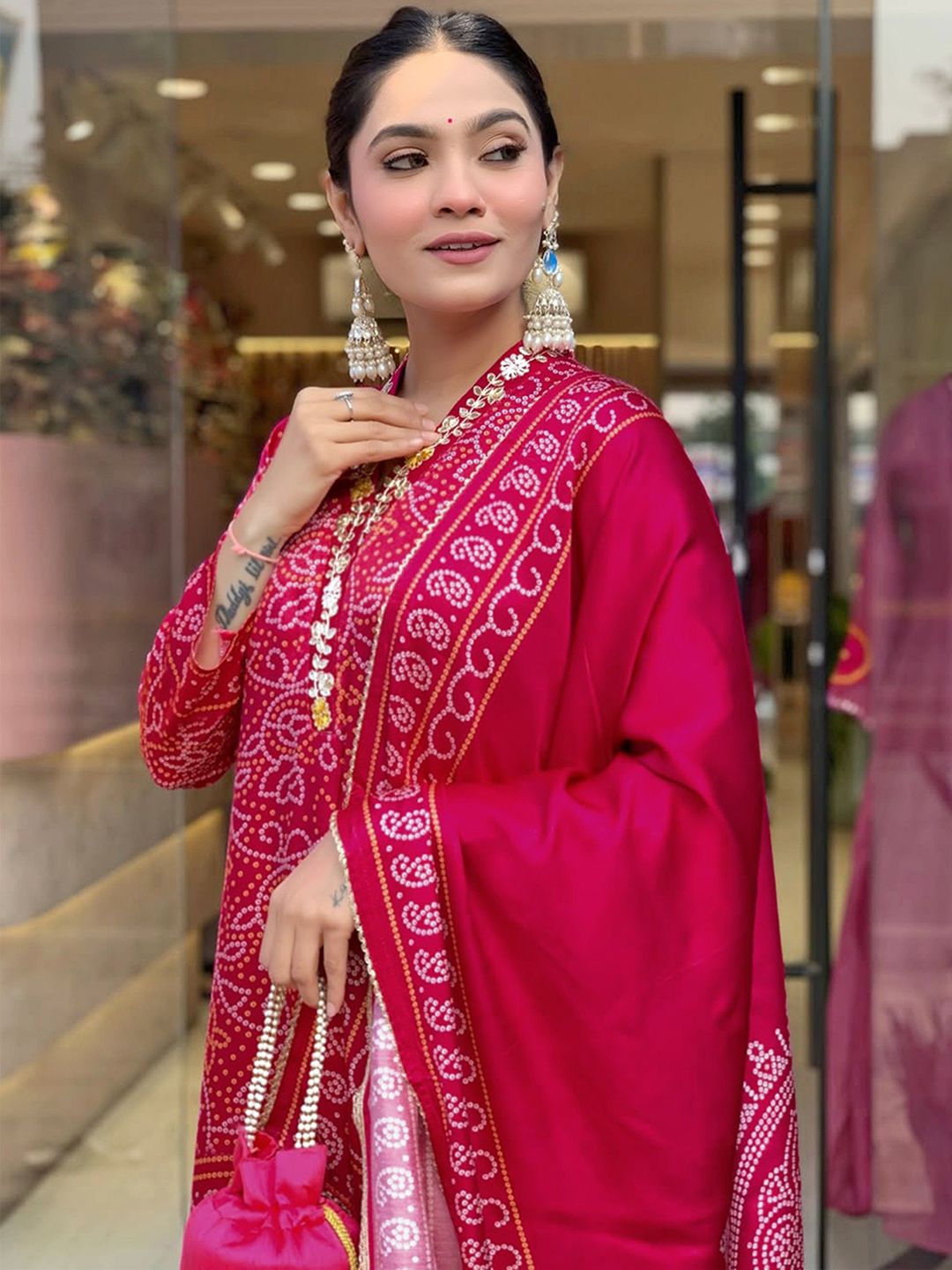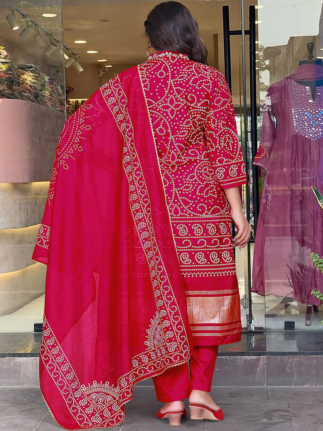 VKOM'S Women Bandhani Printed Regular Kurta with Trousers & Dupatta