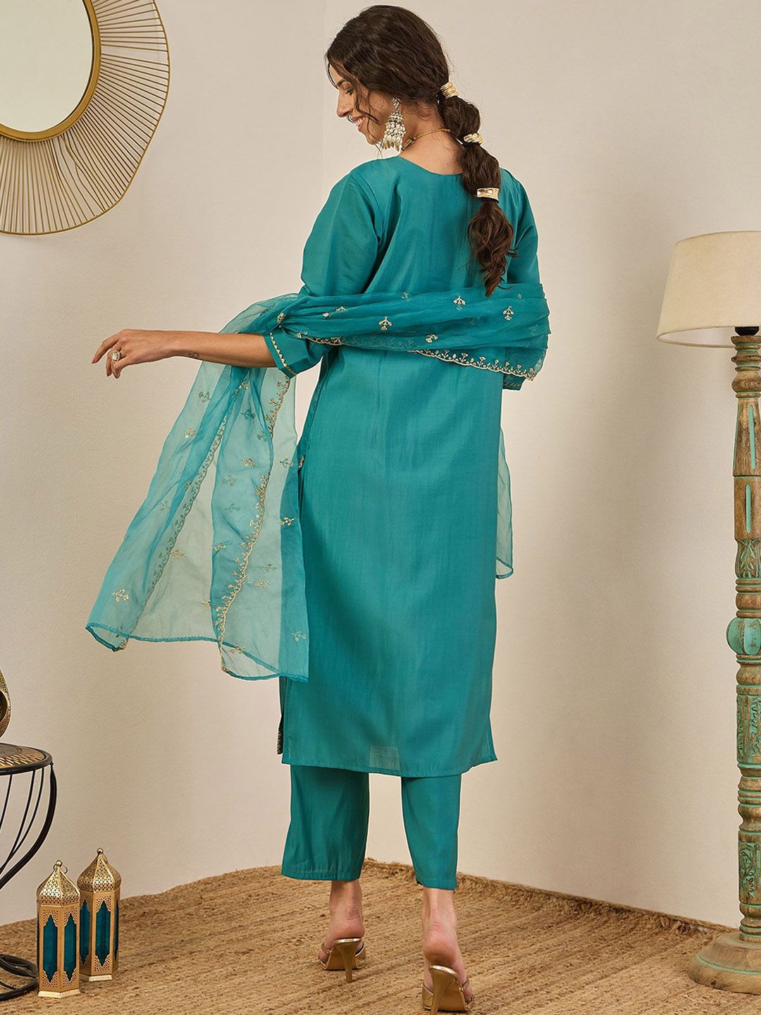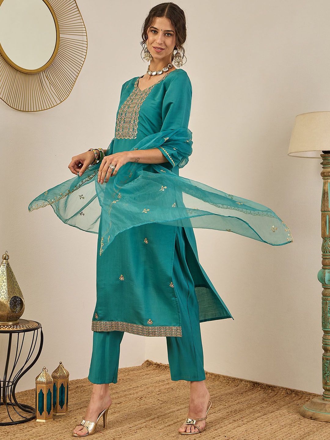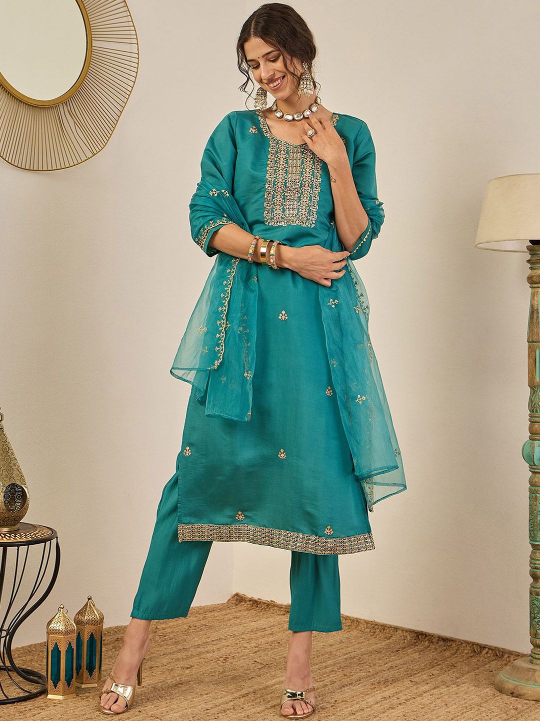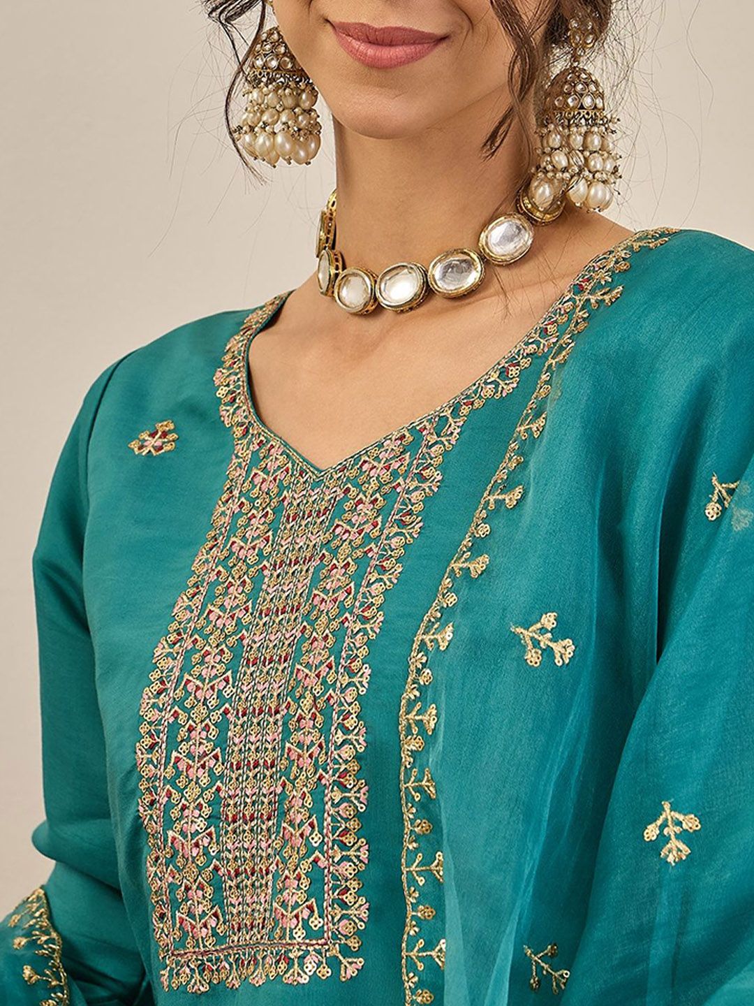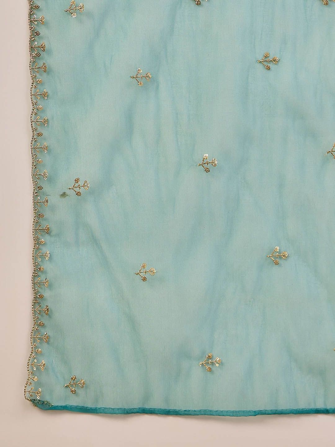 VredeVogel Floral Embroidered Sweetheart Neck Sequinned Kurta With Trousers & Dupatta