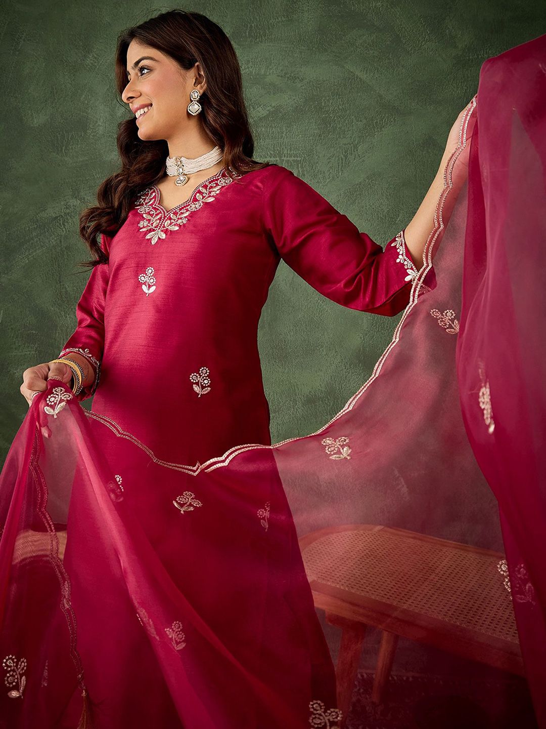 VredeVogel Floral Embroidered Thread Work Kurta With Trousers & Dupatta
